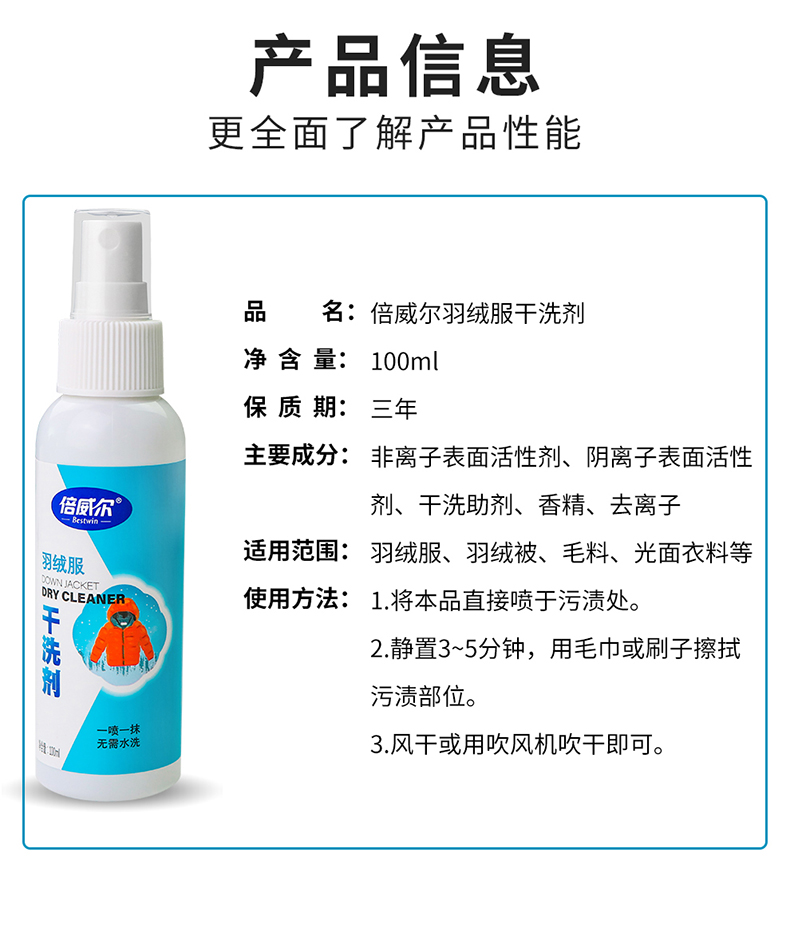 倍威尔羽绒服干洗剂清洗毛呢大衣免水洗家用小白鞋去油污清洁喷雾