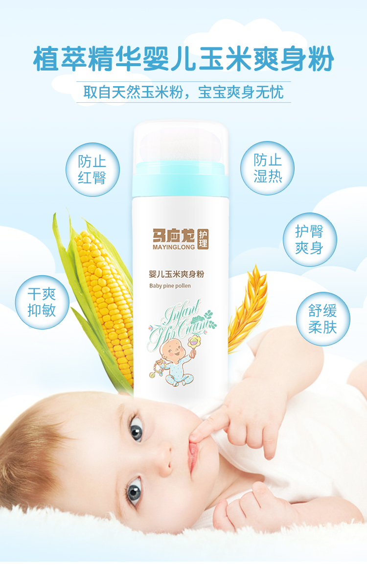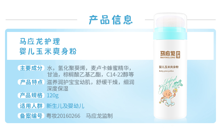 马应龙婴儿爽身粉,四季安全呵护宝宝娇嫩肌肤;采用改性玉米淀粉,艾叶提取物,预防缓解长痱子/小PP红/闷汗等。马应龙系列新妈妈的好帮手!