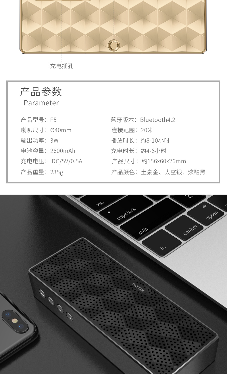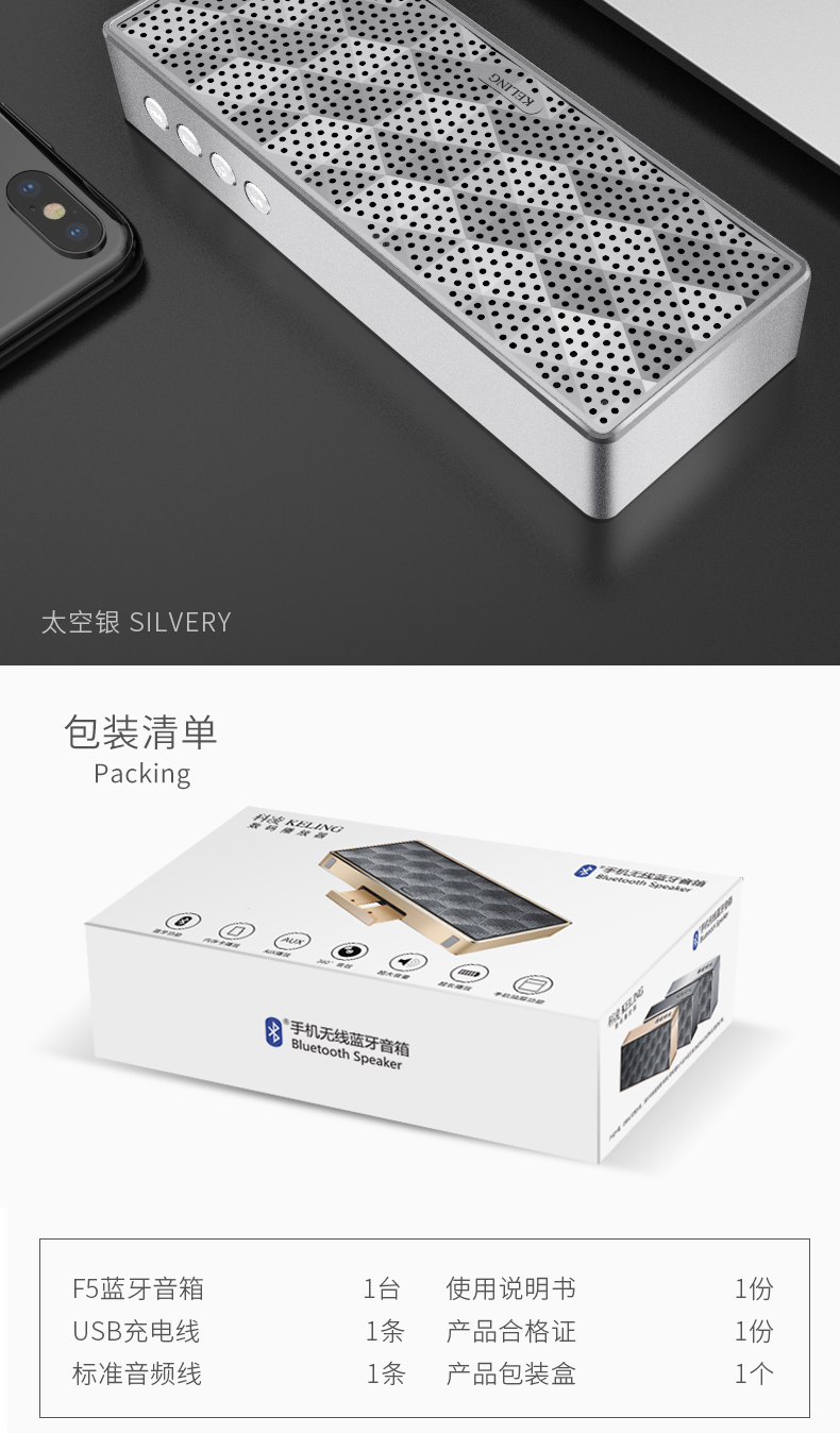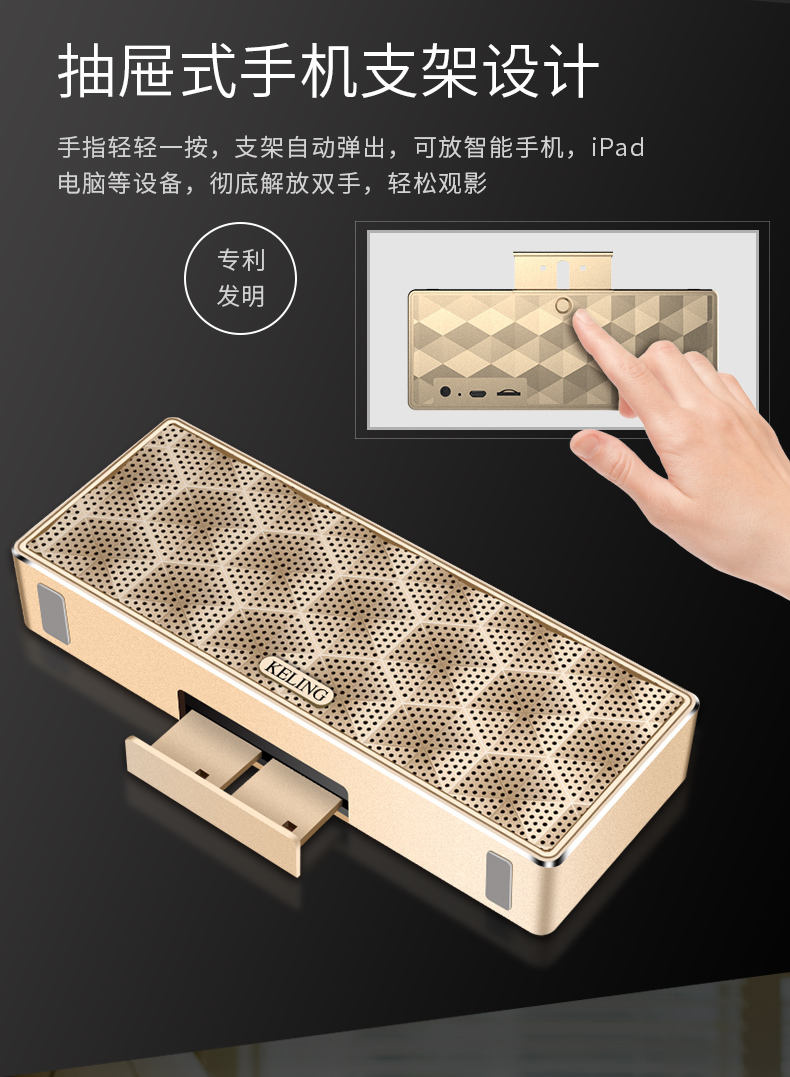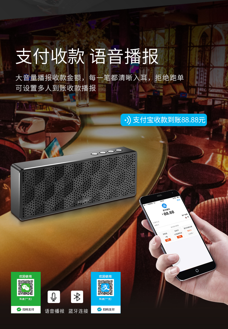 【科凌F5】【抽取式手机支架设计】【线下商户都用这款】大音量语音播报,噪声再大也听得清。240小时长时间待机低音炮,铝合金边框,磨砂高质感,坚固抗摔。感受影院般音效,蓝牙4.2传输,强抗干扰。