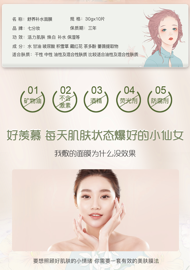 蚕丝胶蛋白,核心成分,密集补水,锁水保湿,层层补水,水润滋养,敷出好肌肤!让肌肤喝饱水,还您水嫩美肌~