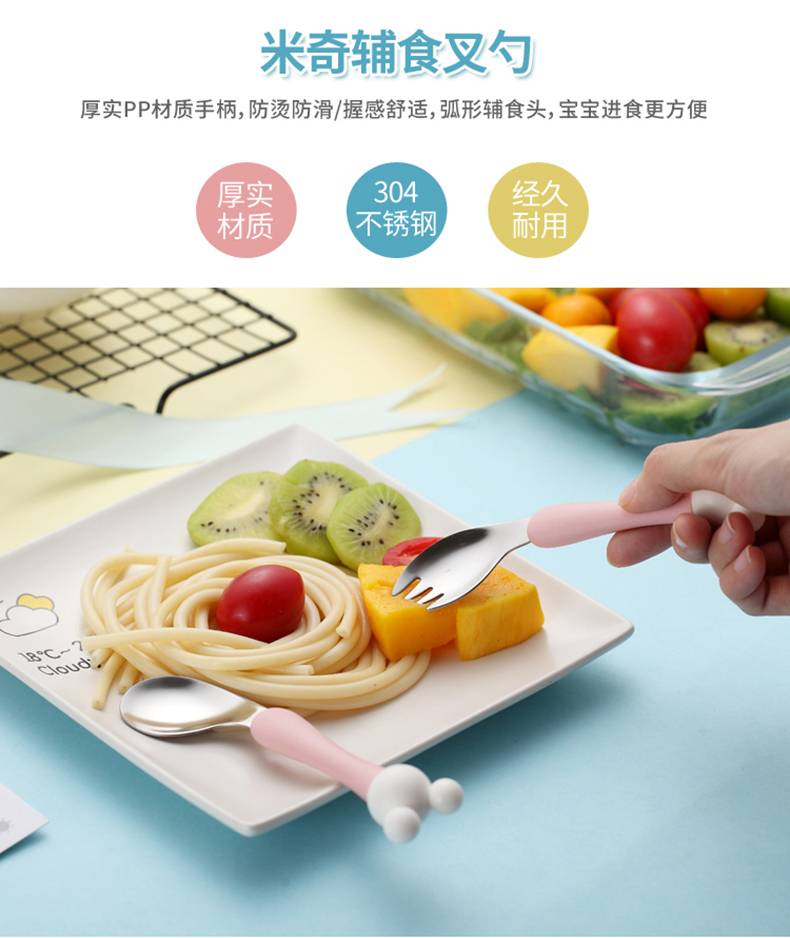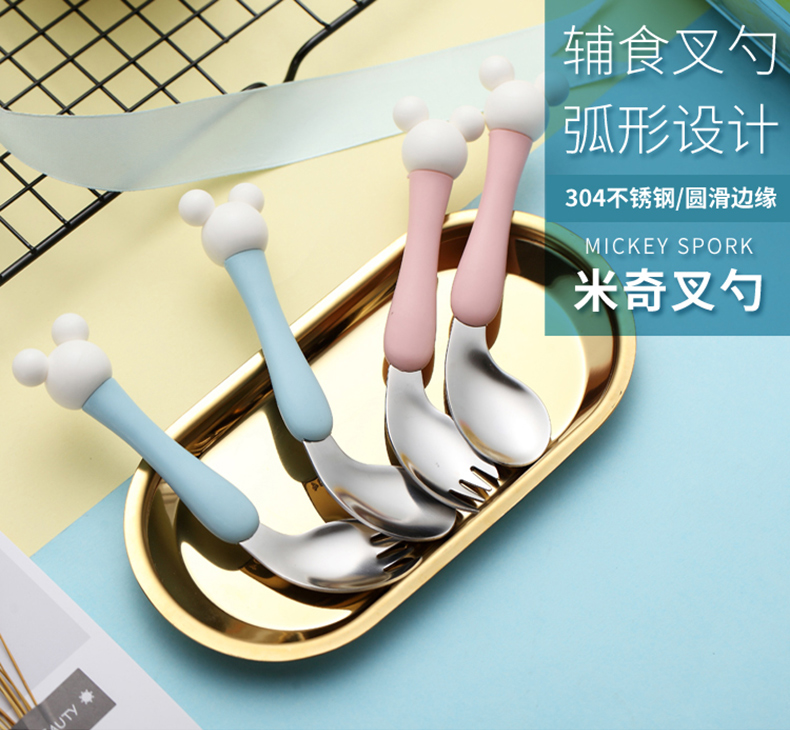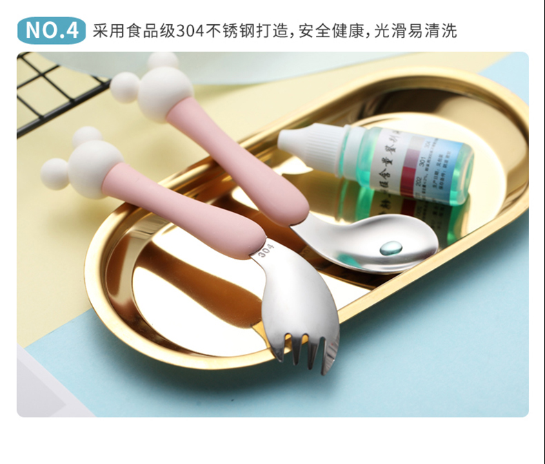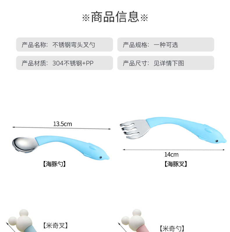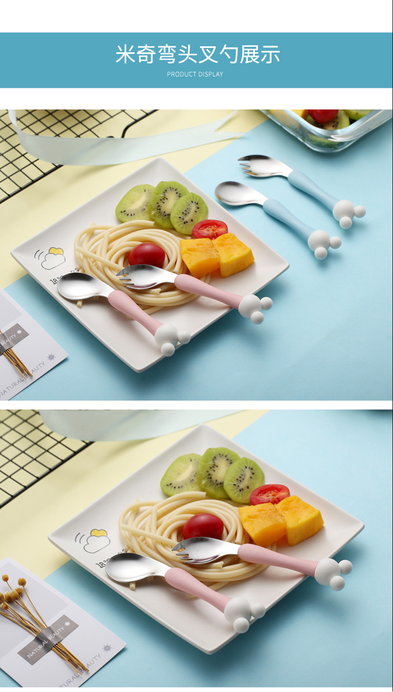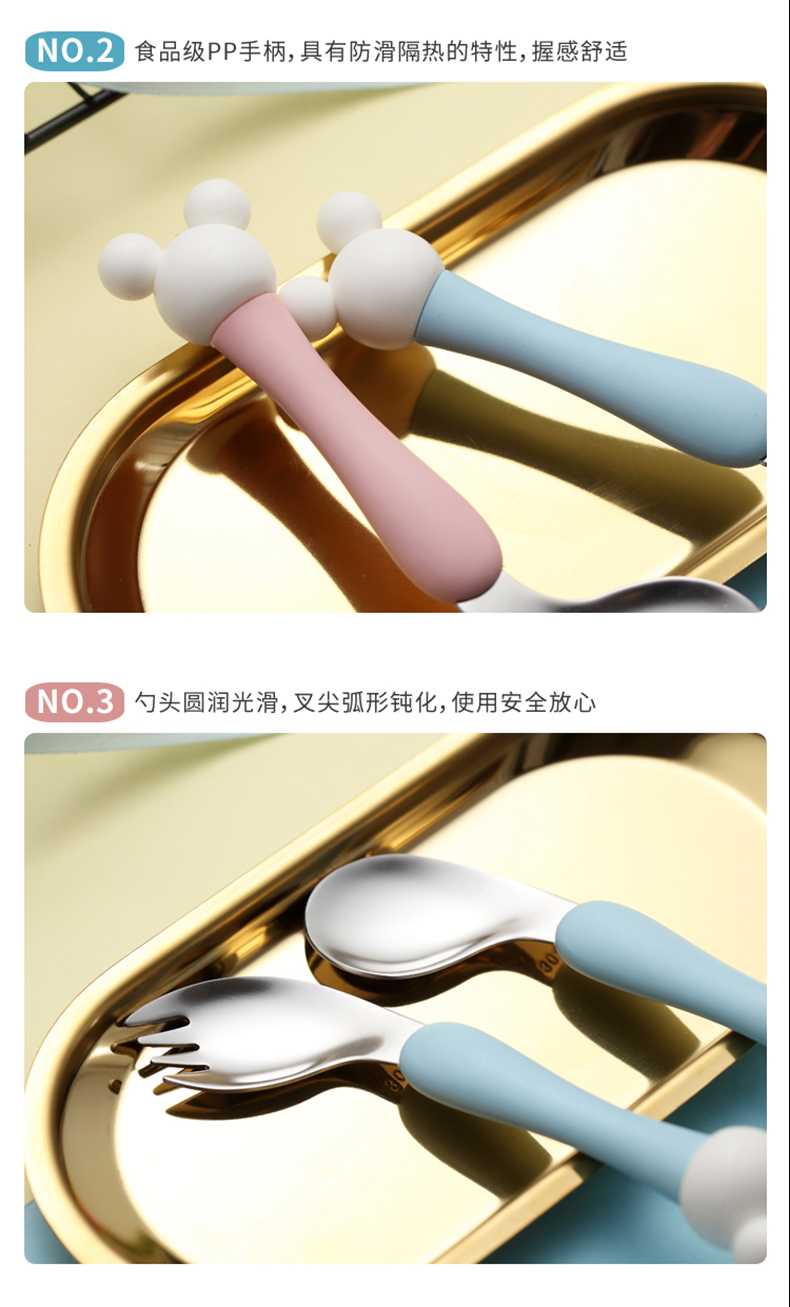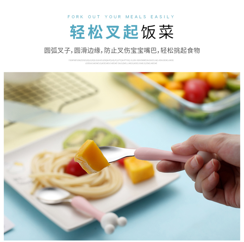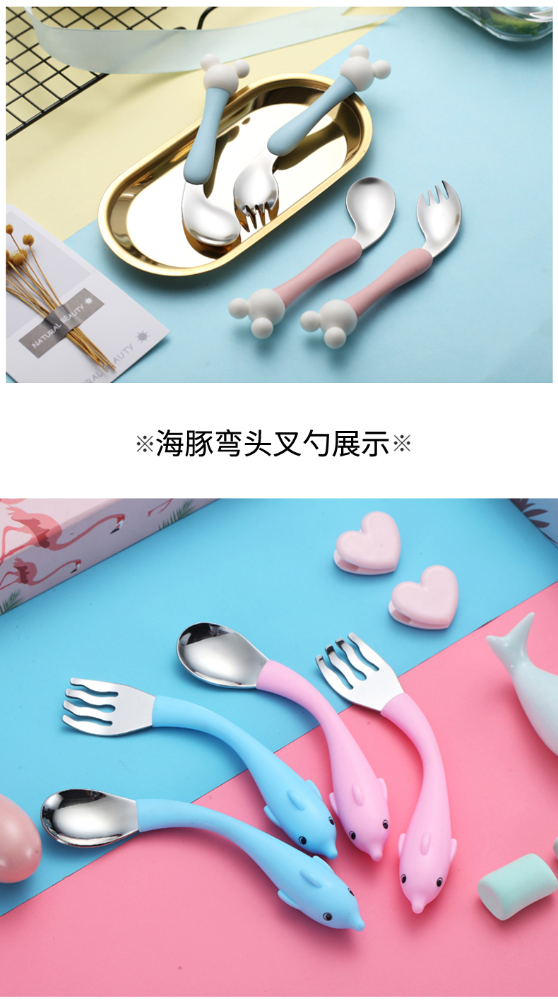 babyalan304不锈钢叉勺弯头勺叉套装弯柄卡通宝宝学吃饭训练勺子
