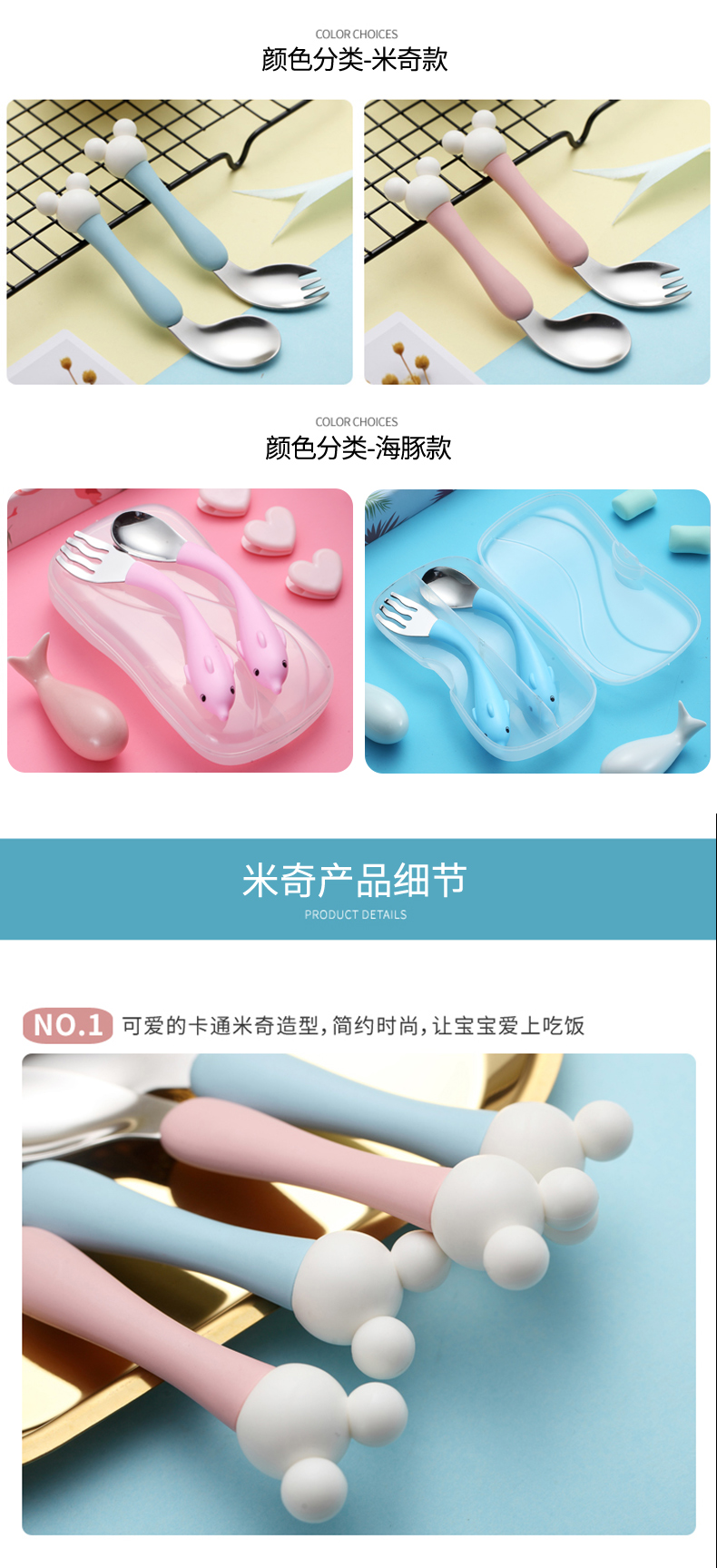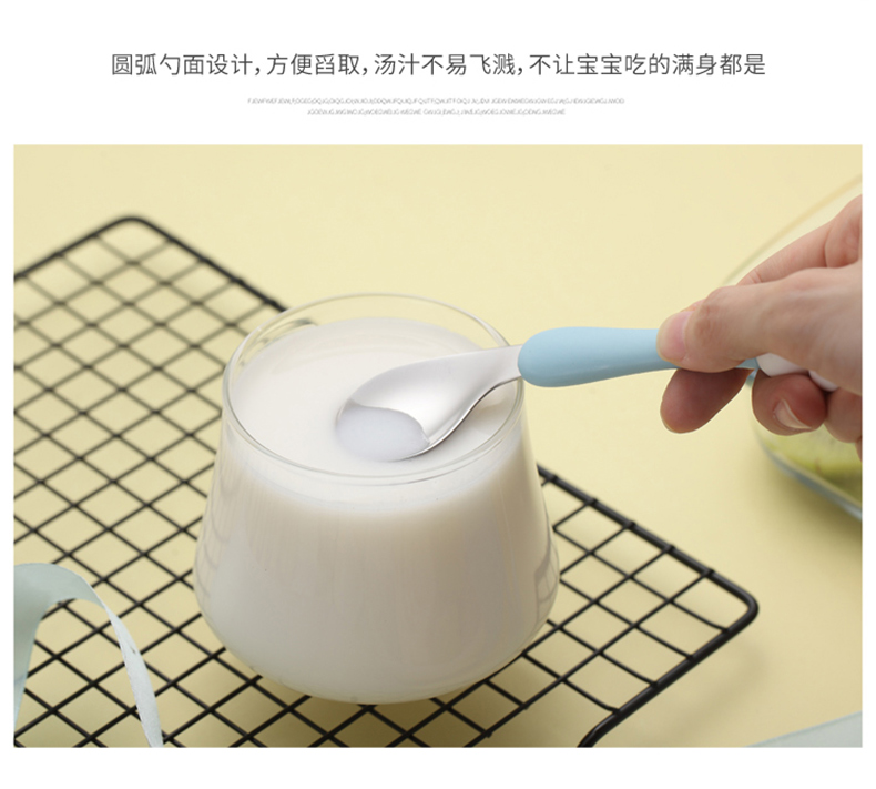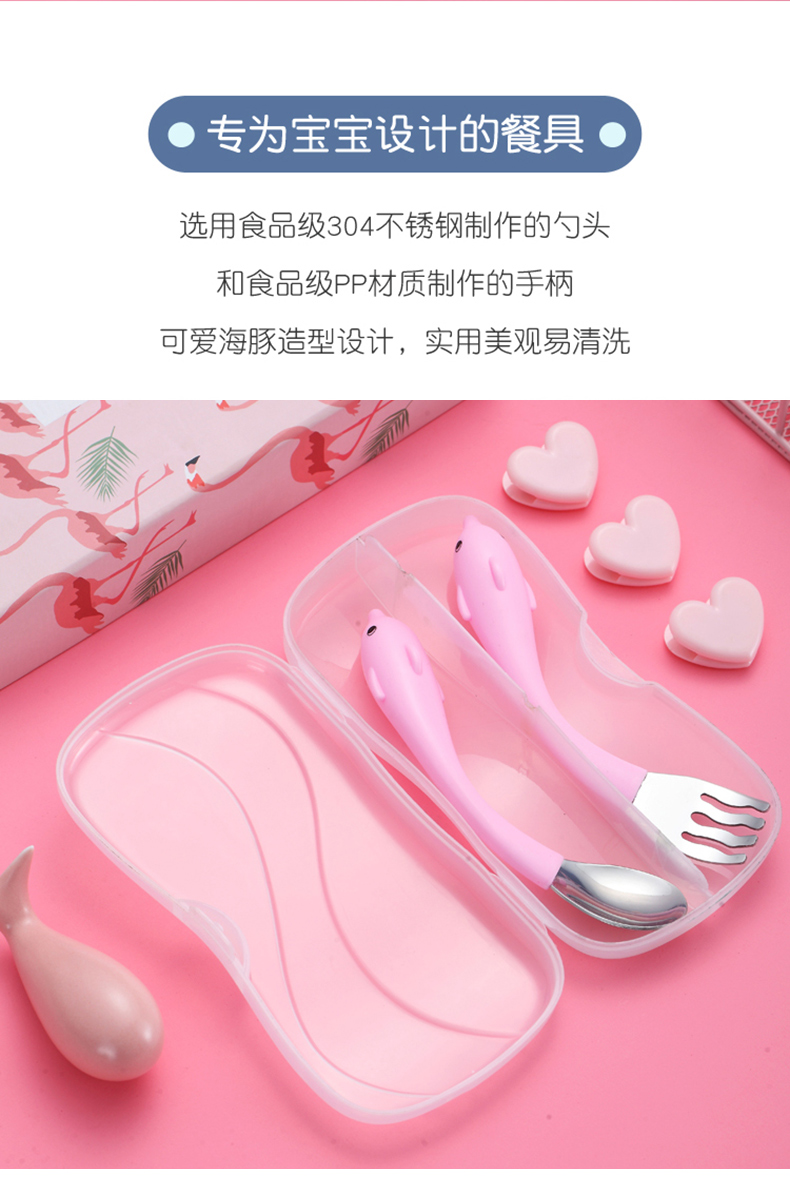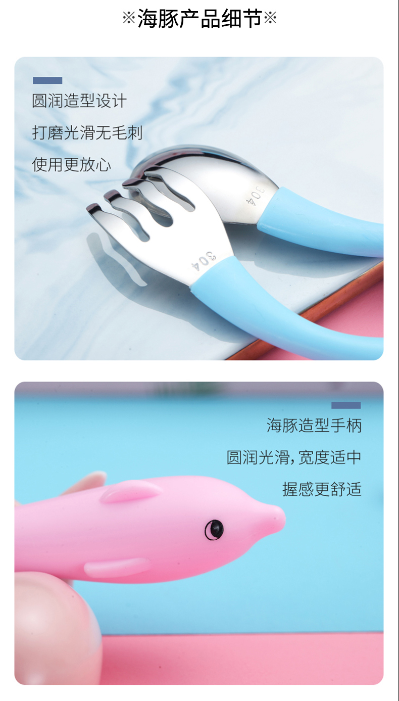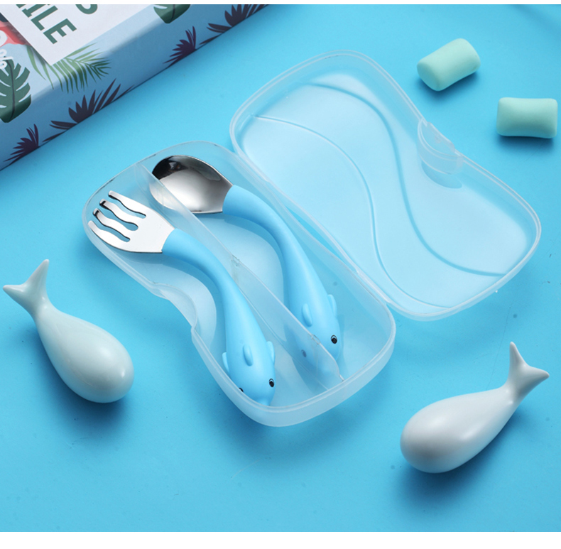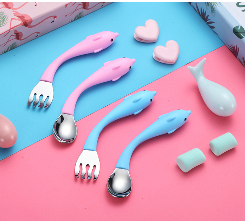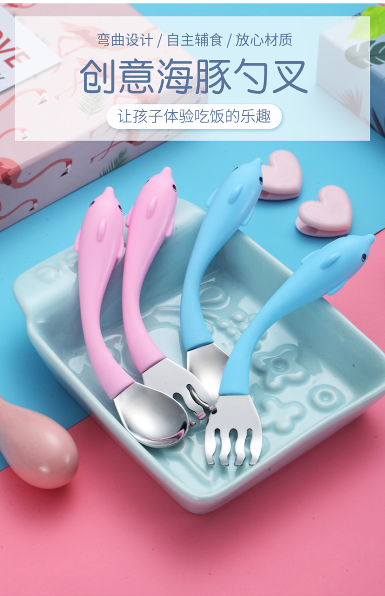 babyalan304不锈钢叉勺弯头勺叉套装弯柄卡通宝宝学吃饭训练勺子