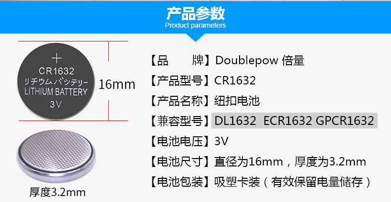 倍量CR1632纽扣电池锂电子3V比亚迪 S6 F3 L3丰田凯美瑞RAV4比亚迪速锐S6汽车钥匙遥控器圆形小电池胎压监测
