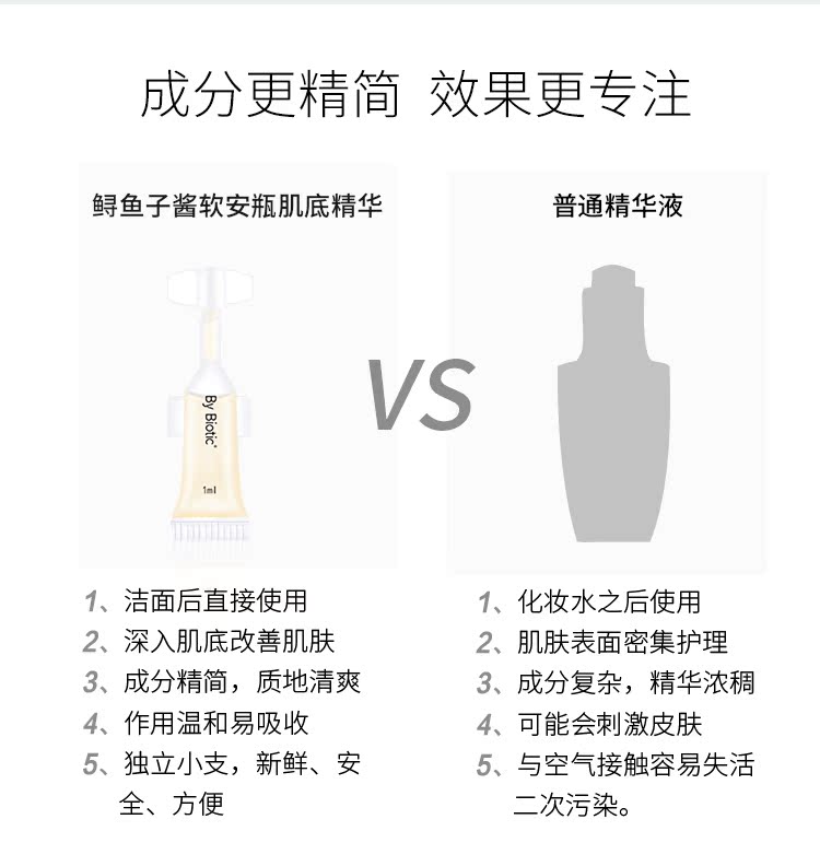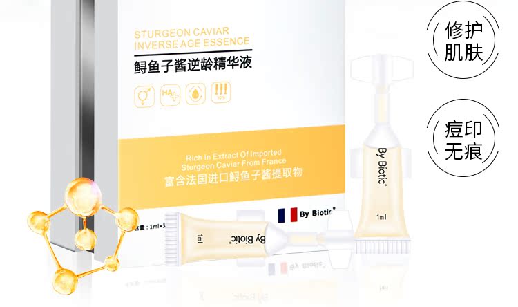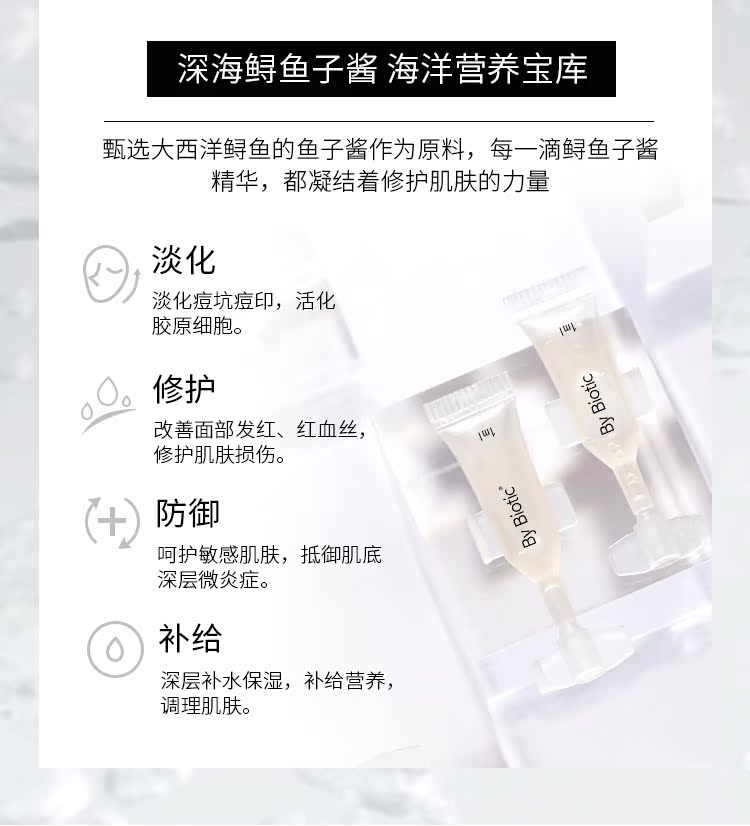 ByBiotic祛痘清印抗衰老面部修复肌底精华液,选用大西洋鲟鱼的黑鱼子酱,天然保湿因子,深层细胞修复,活化胶原细胞,温和不添加,呵护敏感肌,成分更精简,效果更专注,三个皮肤代谢周期即可得到改善