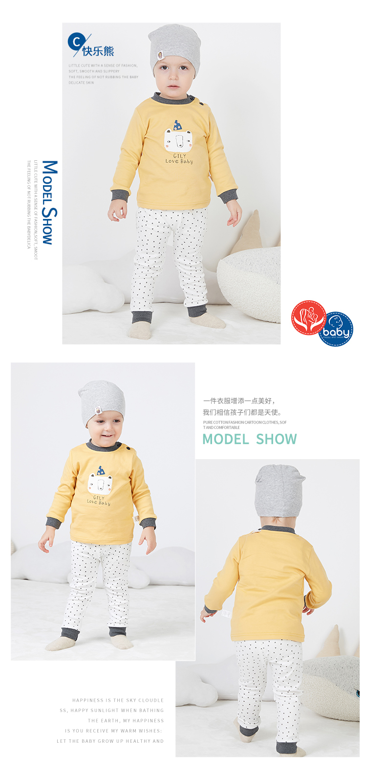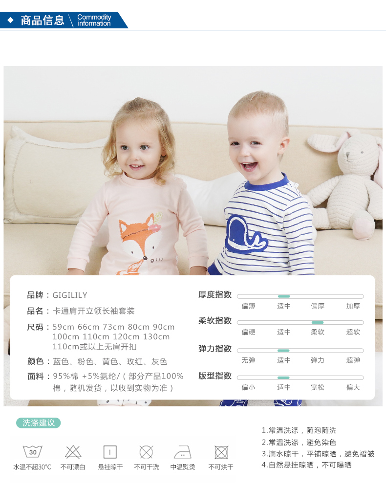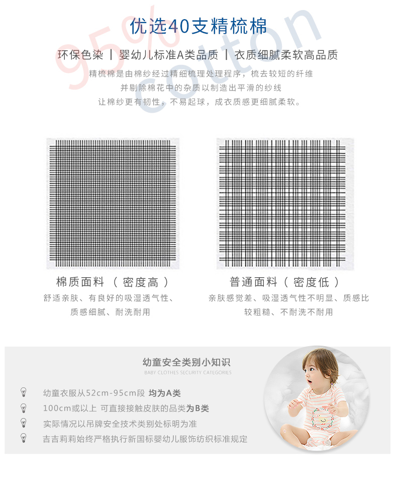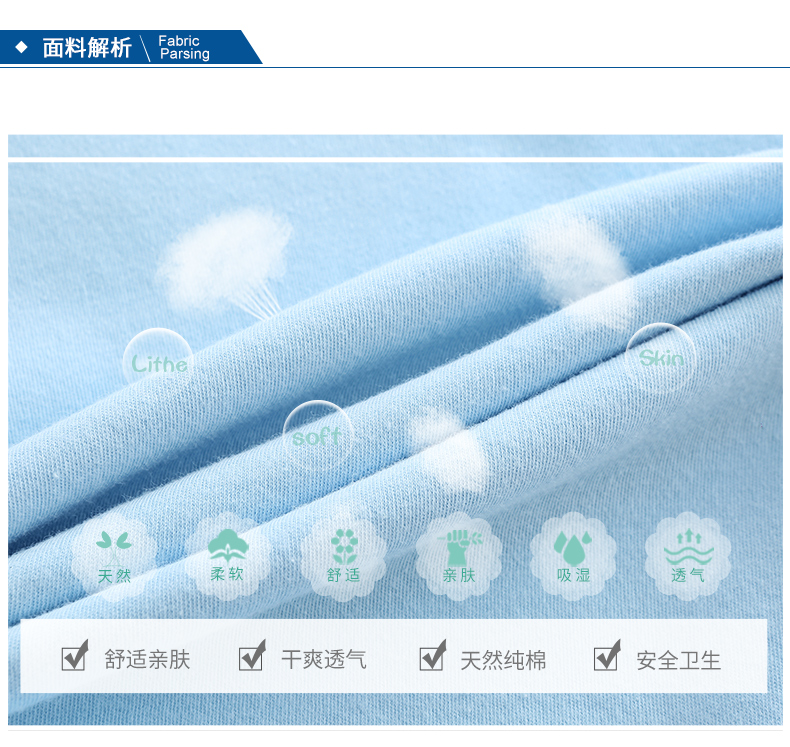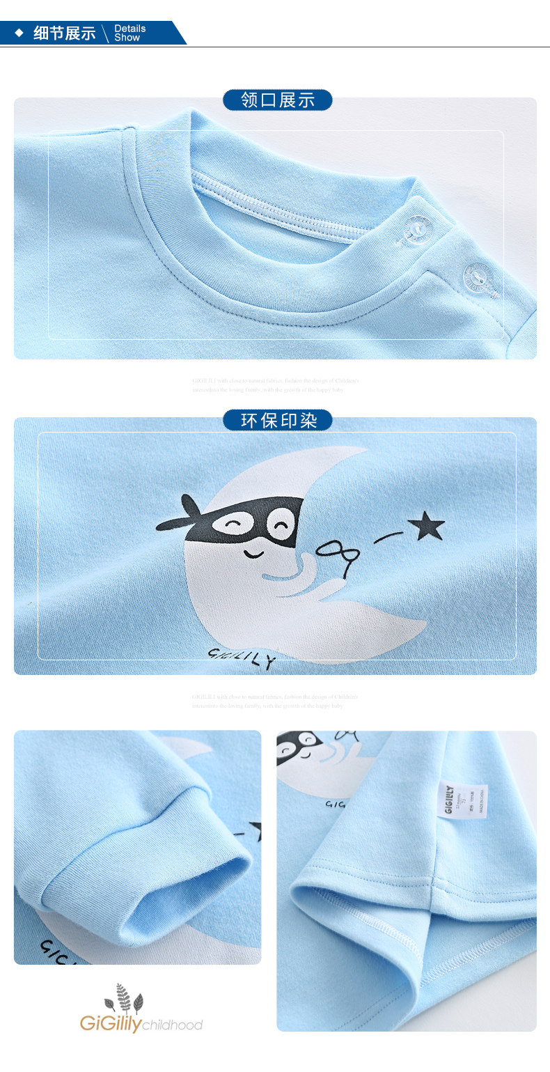 A类纯棉,版型舒适,透气柔软,环保材质,吸湿排汗,经久耐穿,为您的宝宝打造健康贴心的面料。