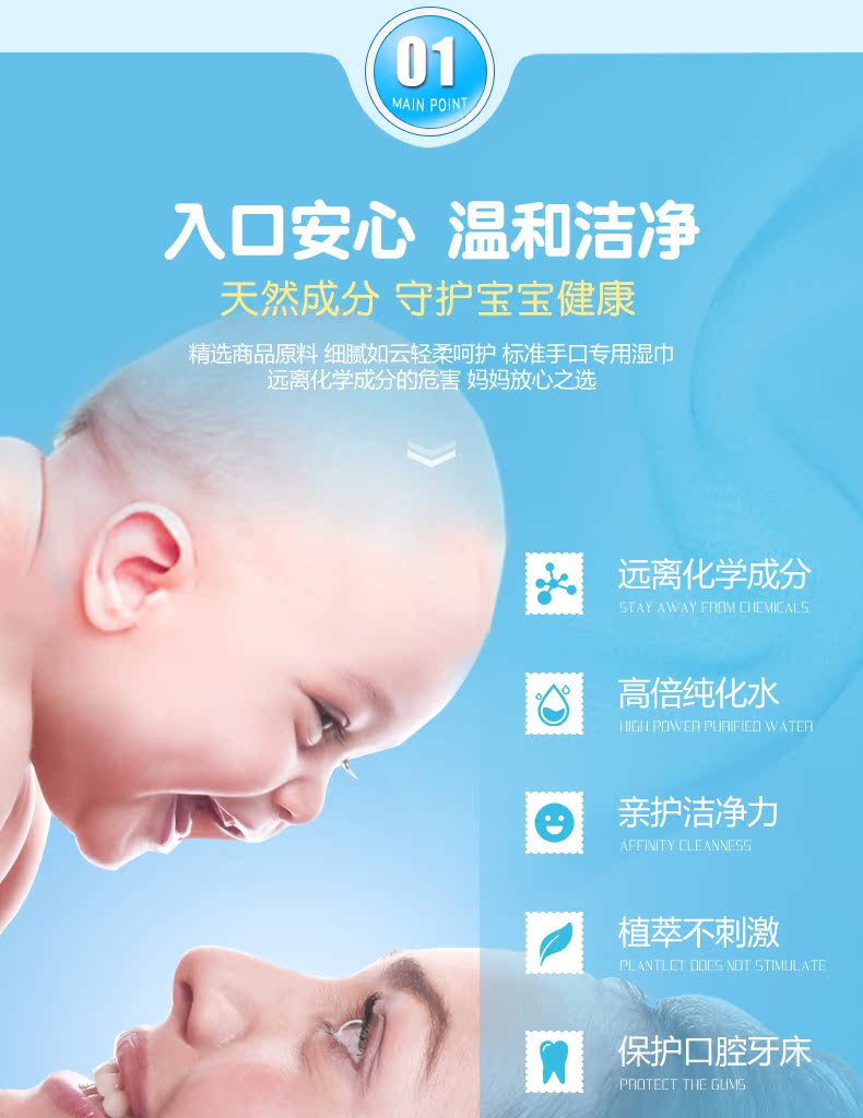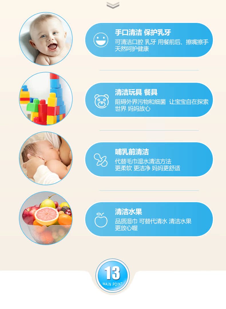 宝倍爱婴儿手口屁专用湿巾,符合安全标准,无荧光无香精,富含燕麦精华,温和水润,抑菌洁净,安全到可以“吃”的湿巾。