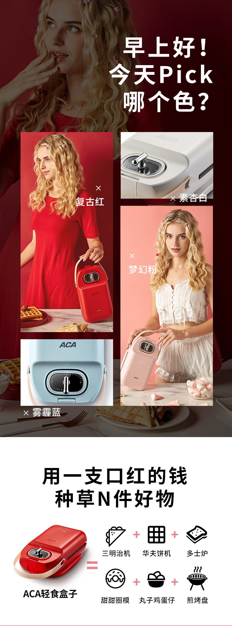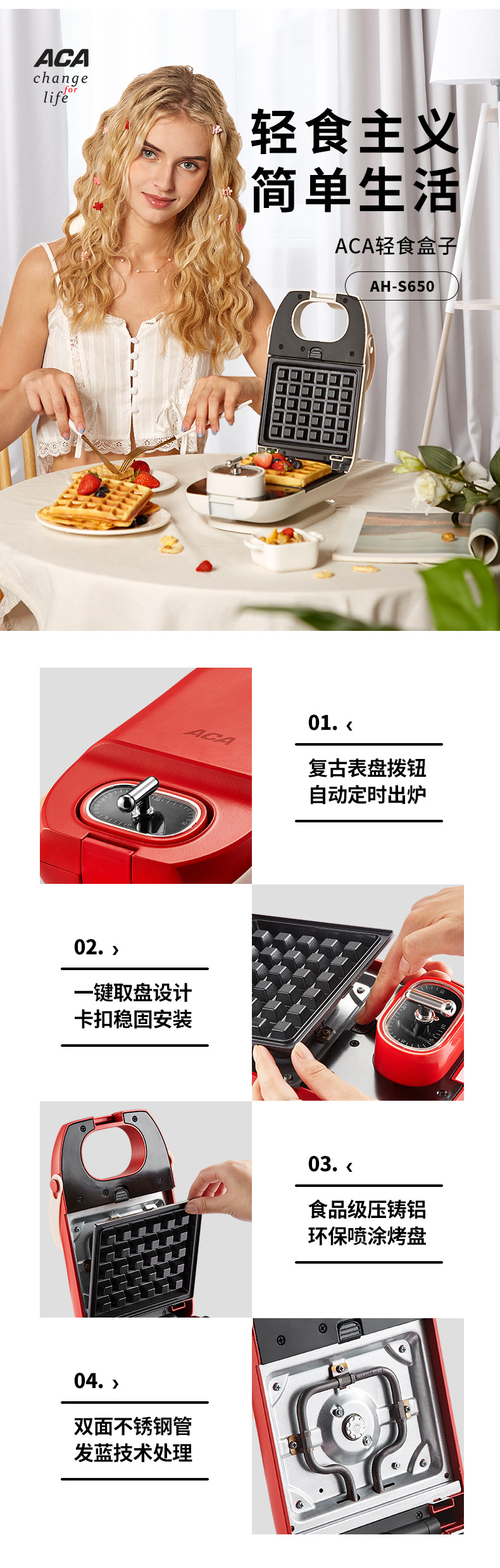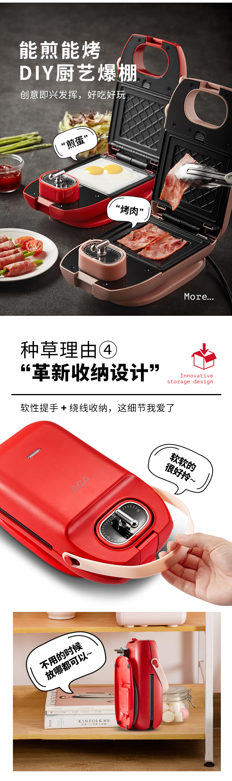 ACA三明治早餐机,轻食机华夫饼机,家用多功能加热吐司压烤机面包机,30分钟定时,5分钟搞定早餐.
