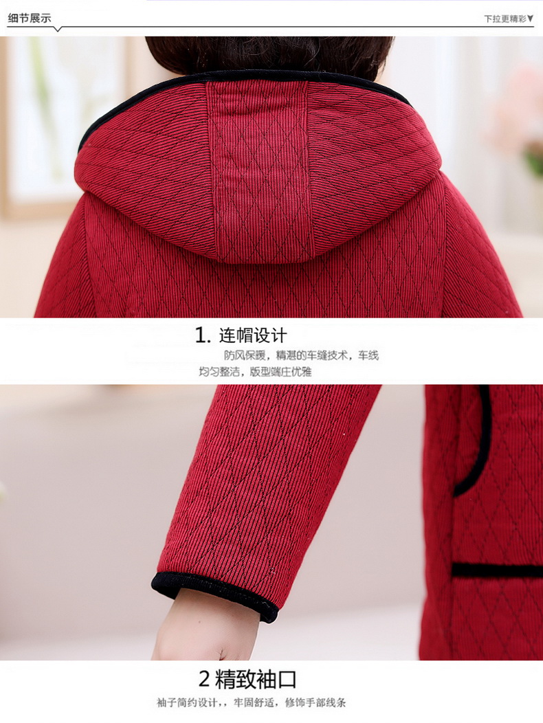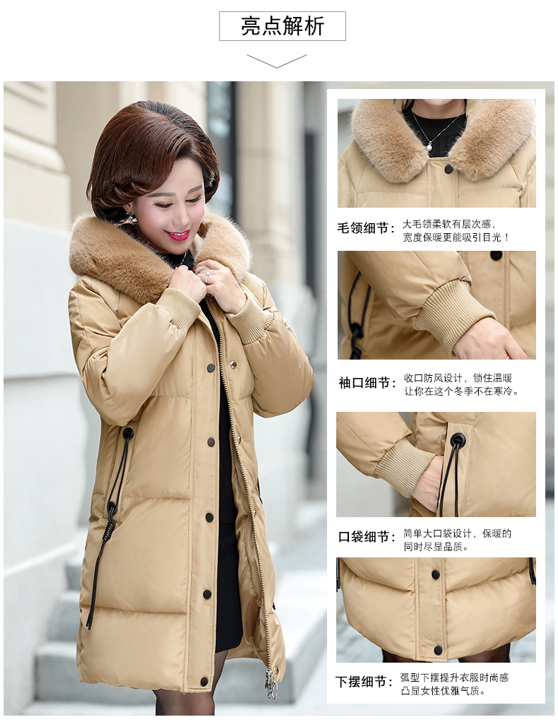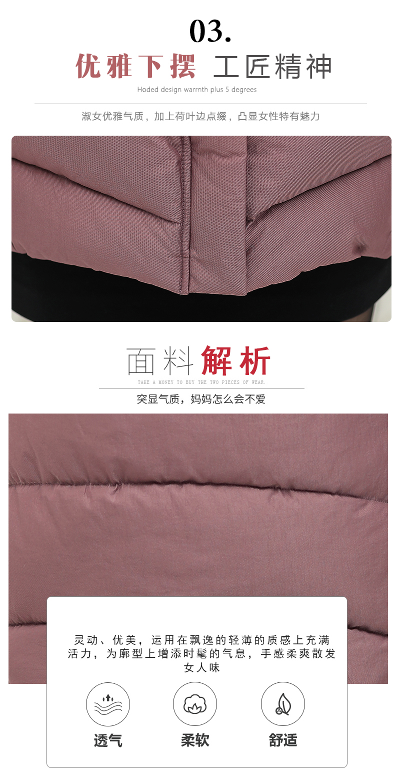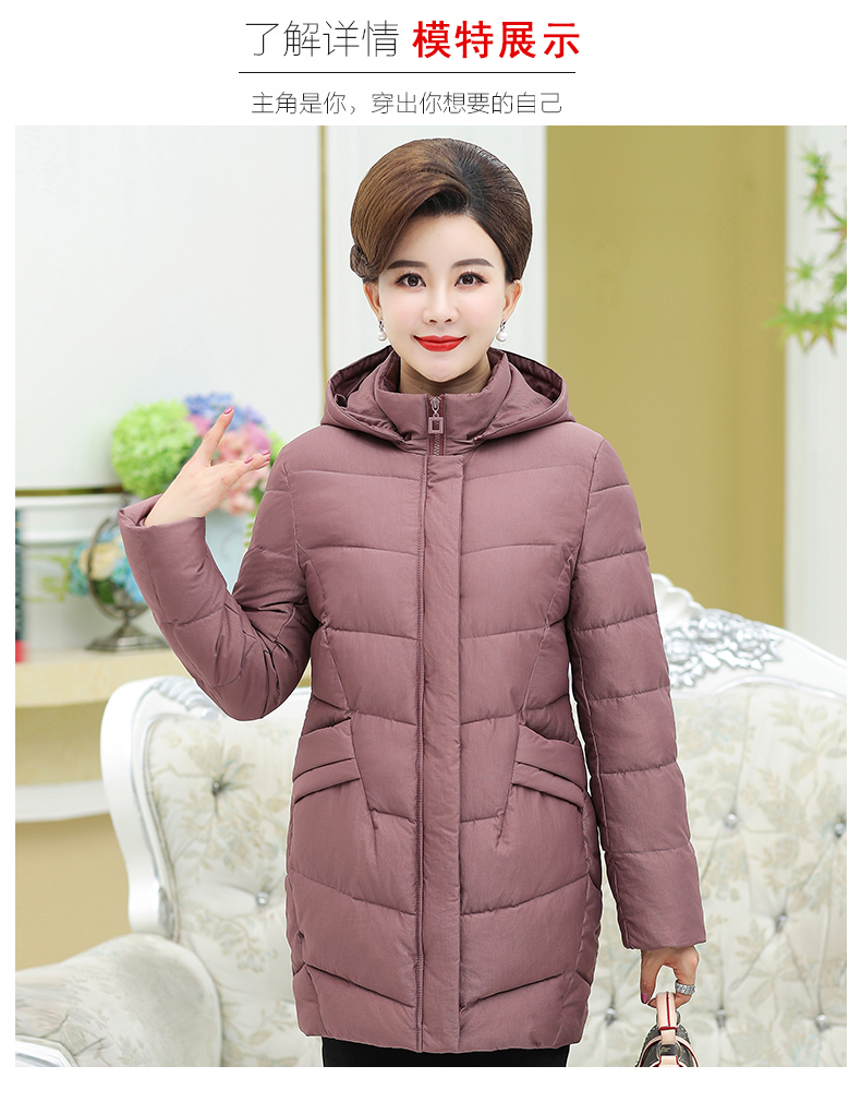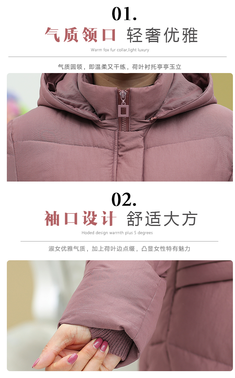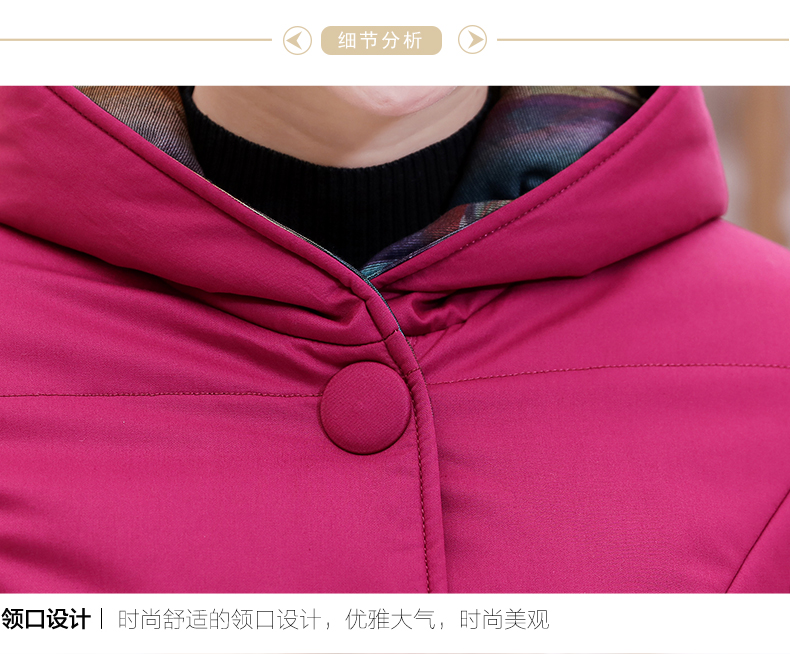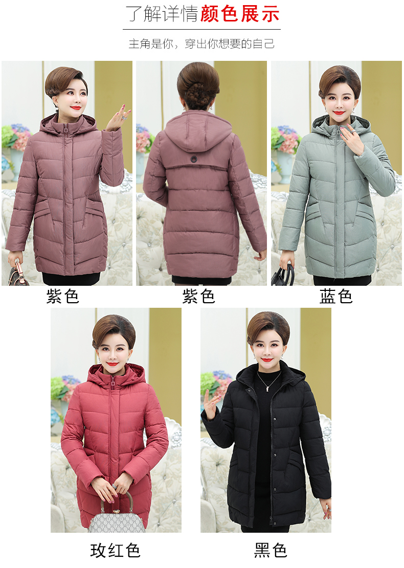 加厚羽绒棉服,中长款洋气妈妈冬装,新款棉袄外套。连帽设计,贴合颈部,舒适保暖。肩部设计走线精细,展出立体美观。袖口设计收缩,防风防寒。