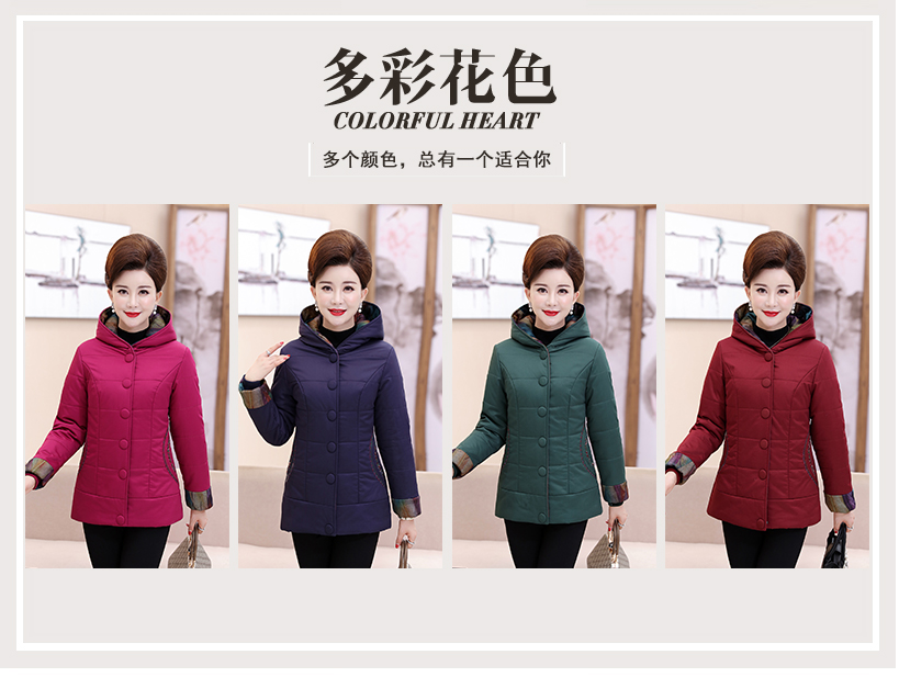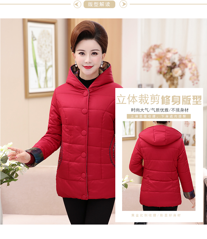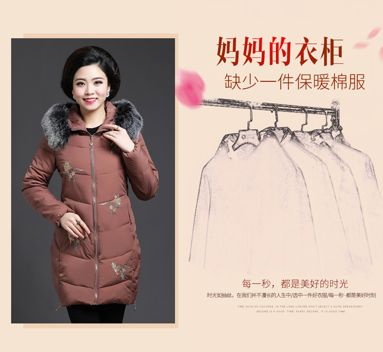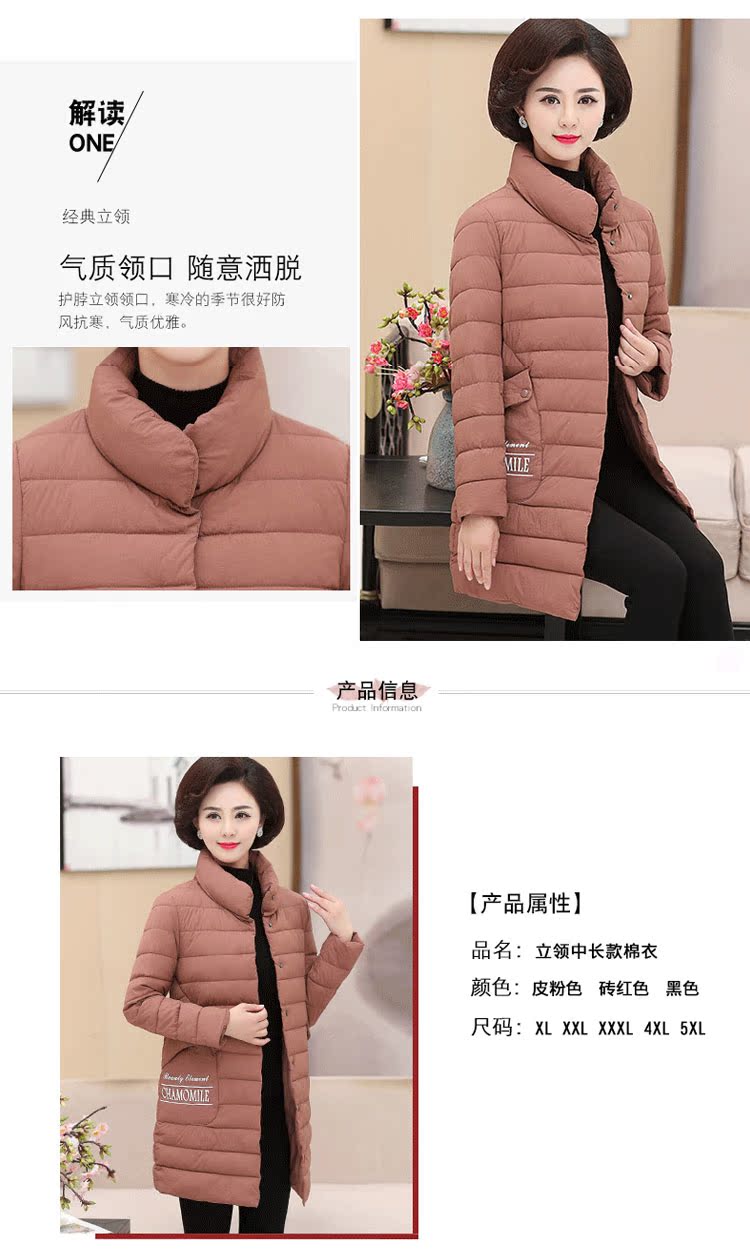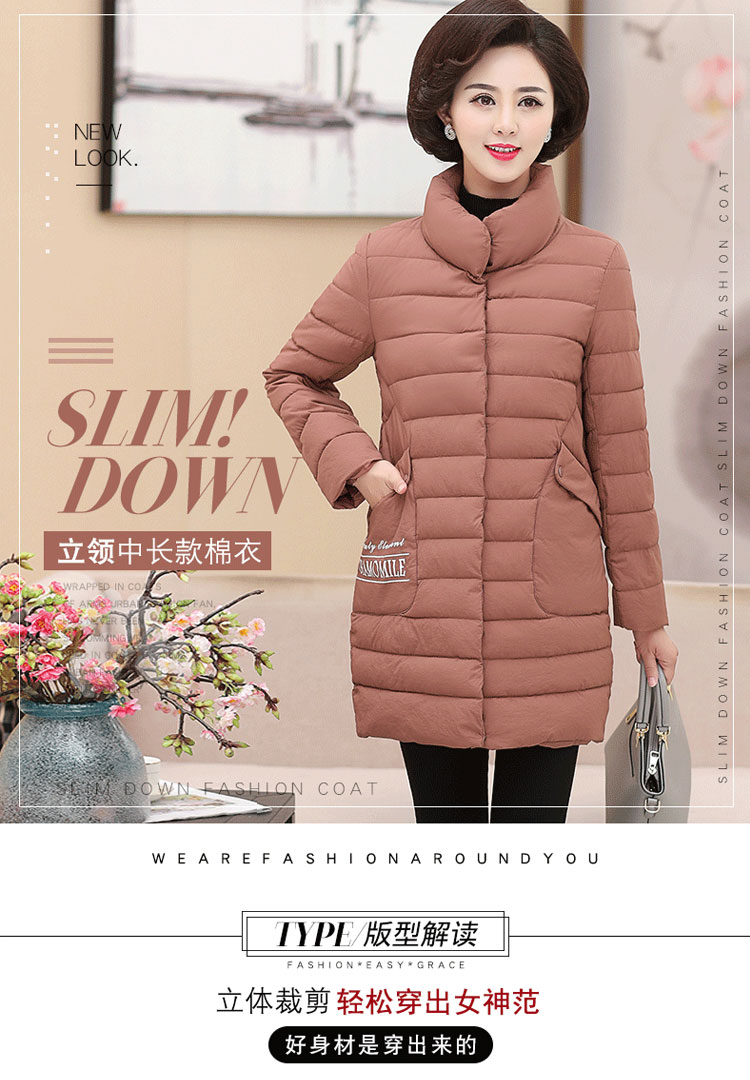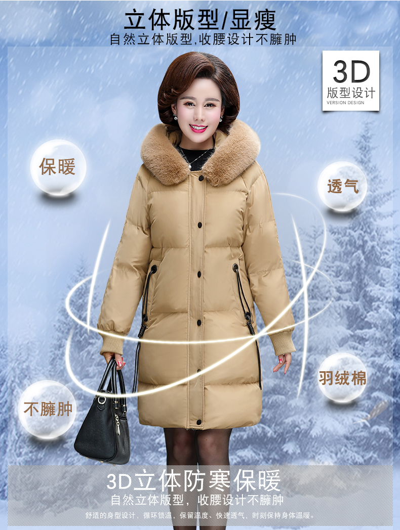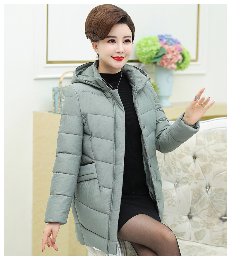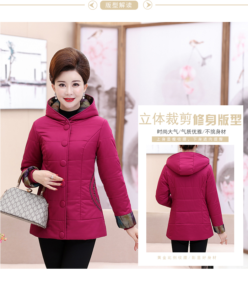 加厚羽绒棉服,中长款洋气妈妈冬装,新款棉袄外套。连帽设计,贴合颈部,舒适保暖。肩部设计走线精细,展出立体美观。袖口设计收缩,防风防寒。