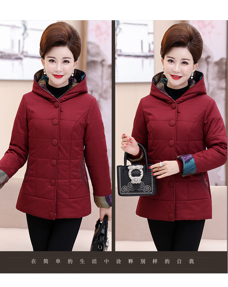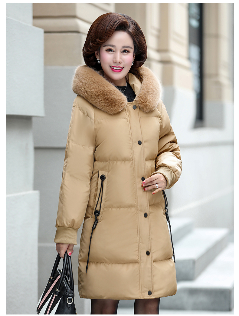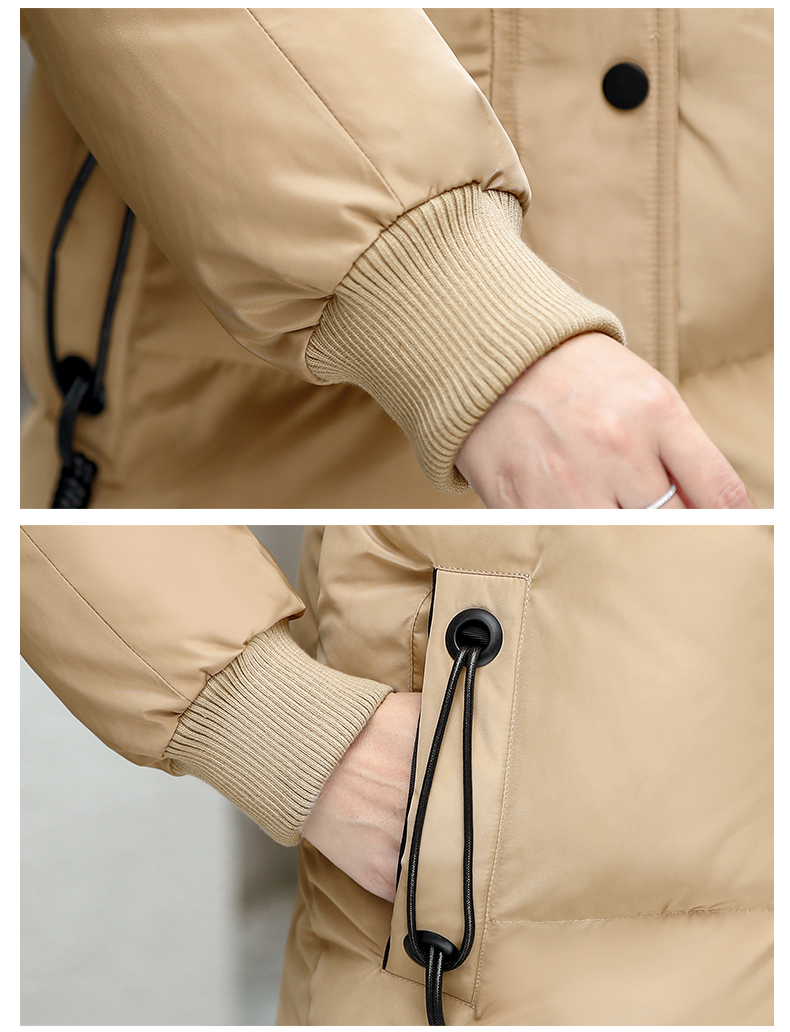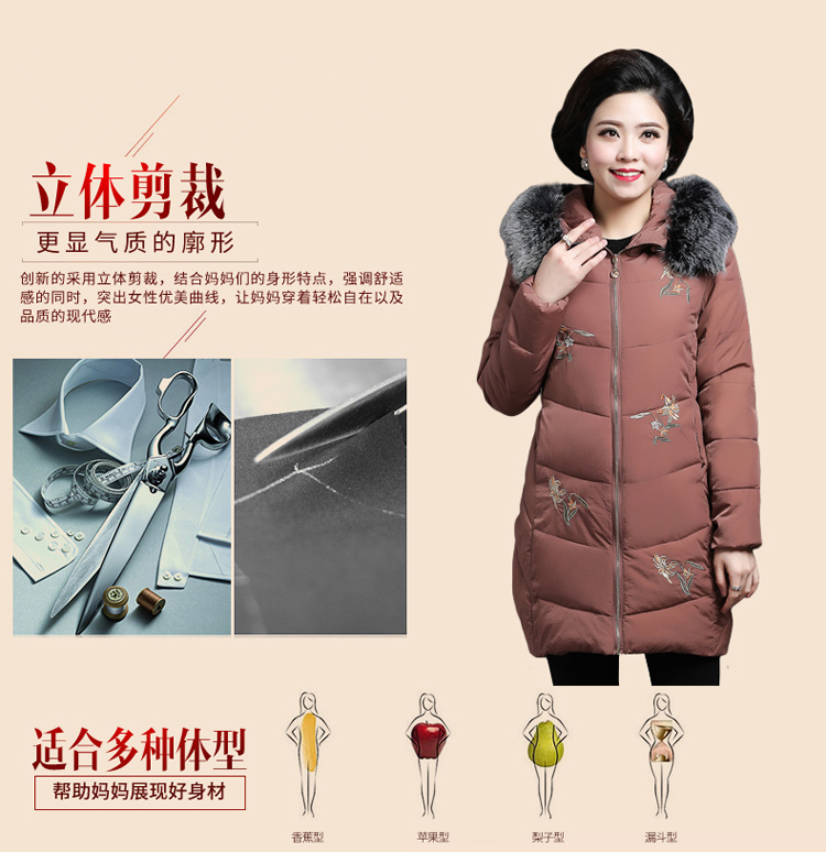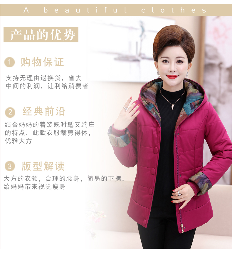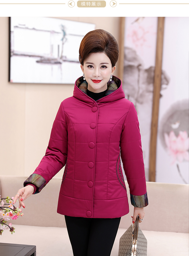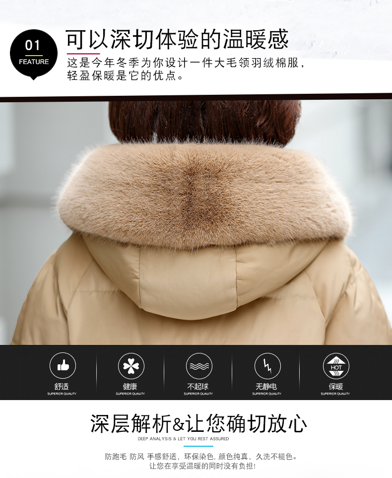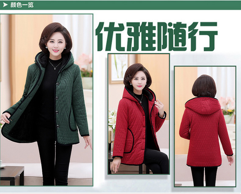 加厚羽绒棉服,中长款洋气妈妈冬装,新款棉袄外套。连帽设计,贴合颈部,舒适保暖。肩部设计走线精细,展出立体美观。袖口设计收缩,防风防寒。