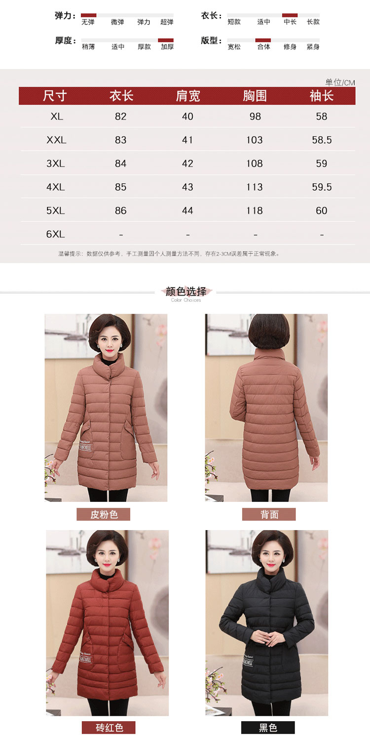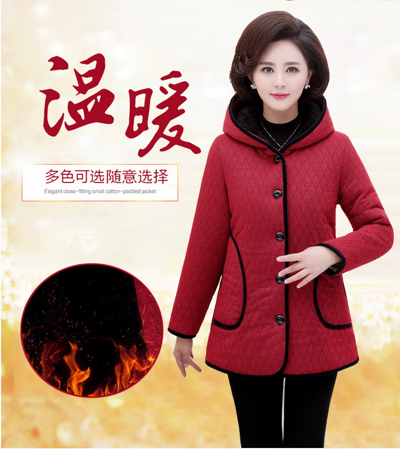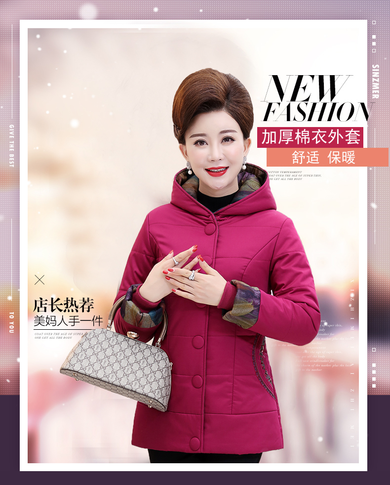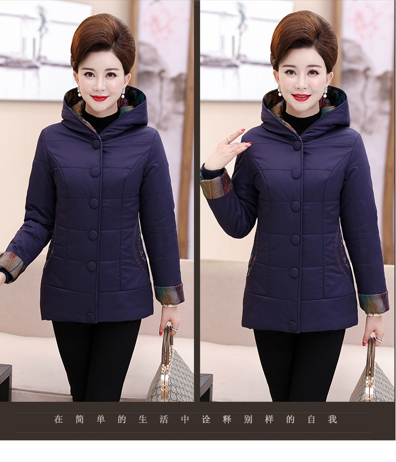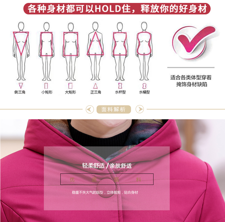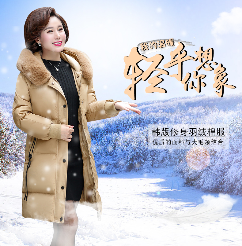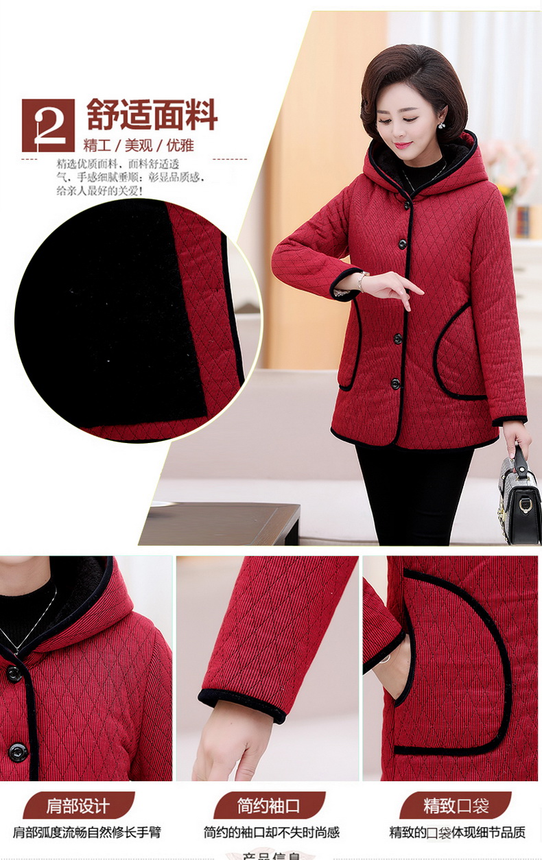 加厚羽绒棉服,中长款洋气妈妈冬装,新款棉袄外套。连帽设计,贴合颈部,舒适保暖。肩部设计走线精细,展出立体美观。袖口设计收缩,防风防寒。