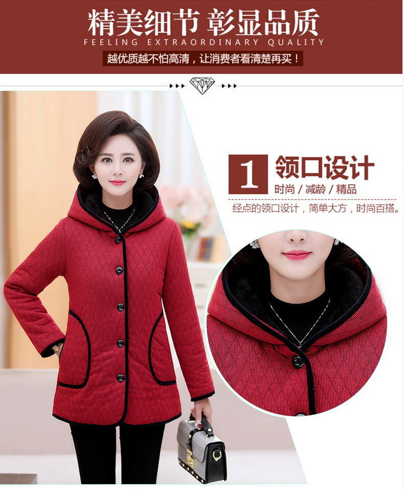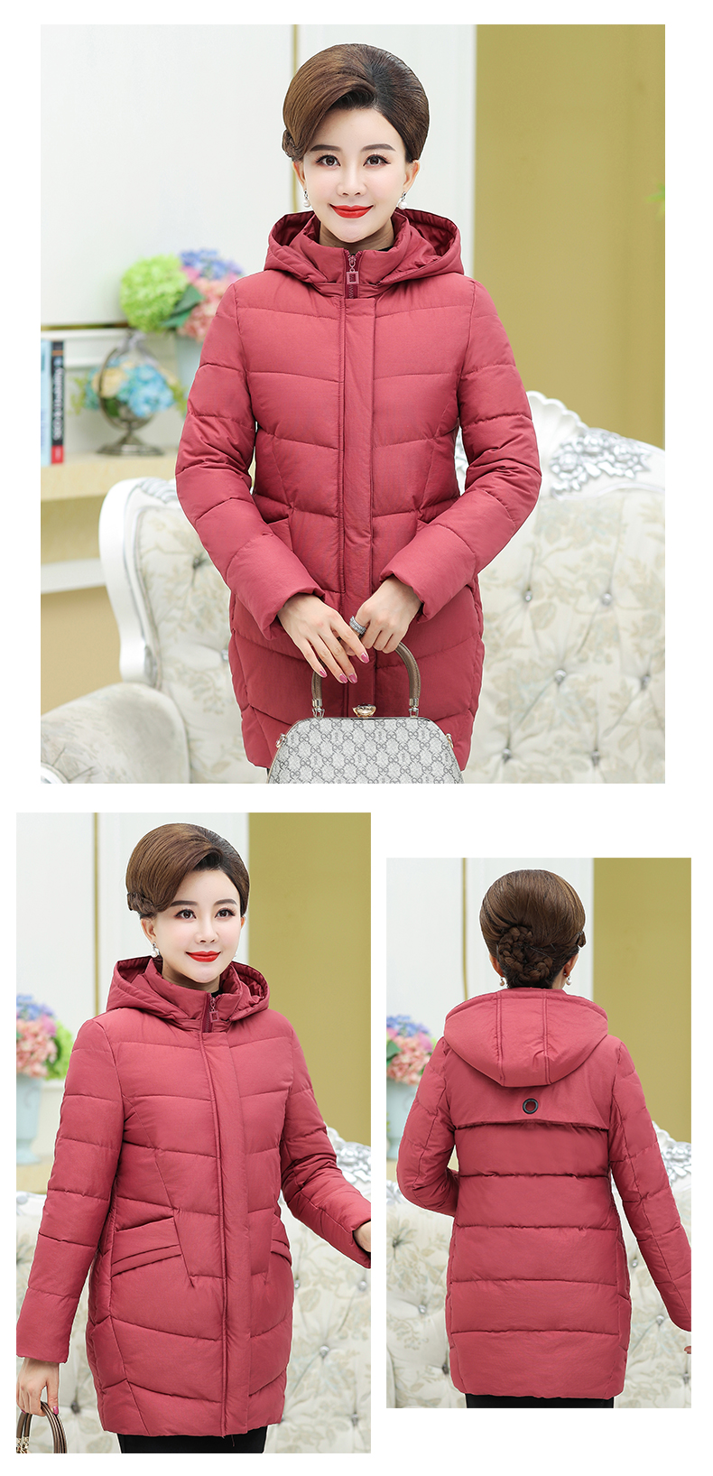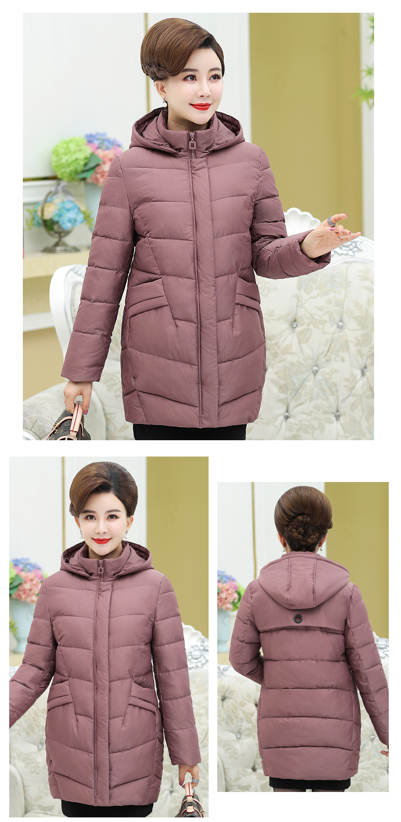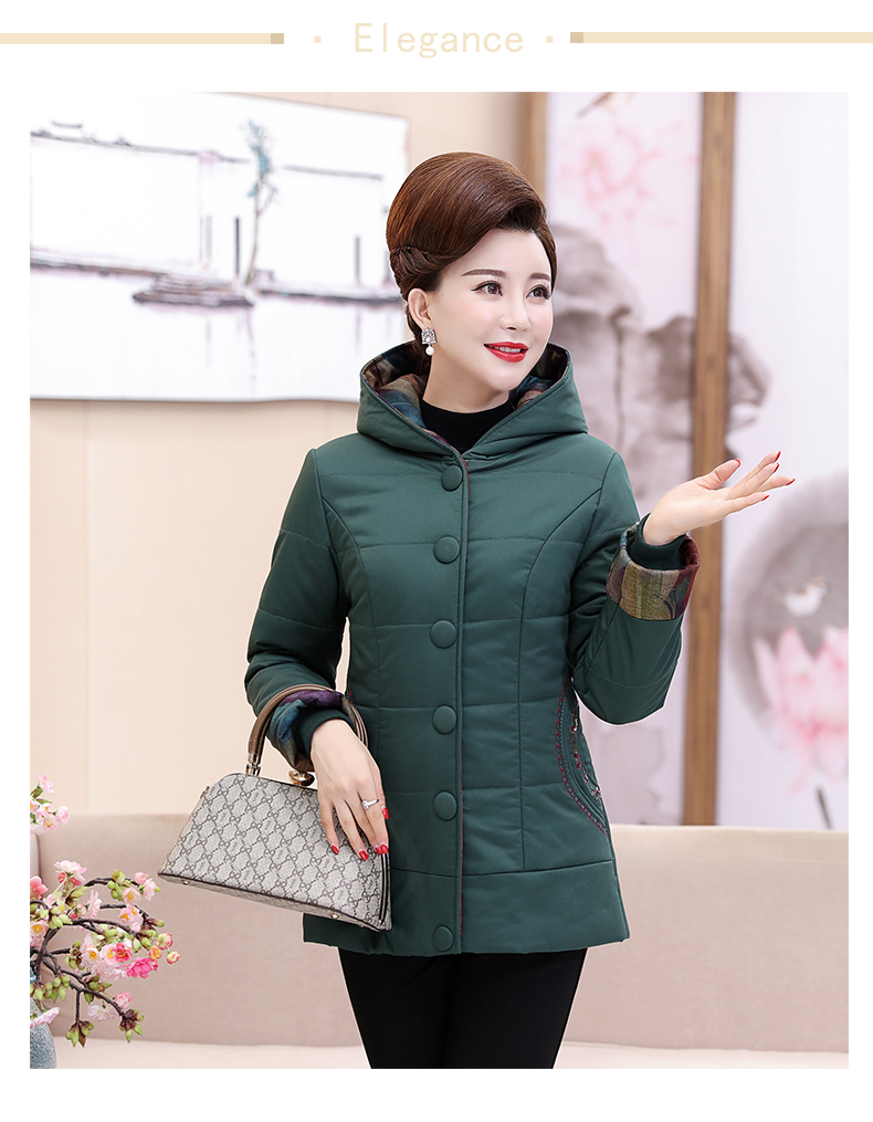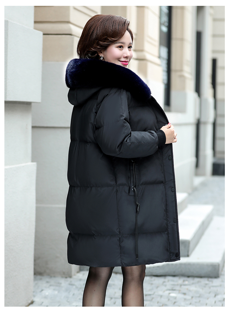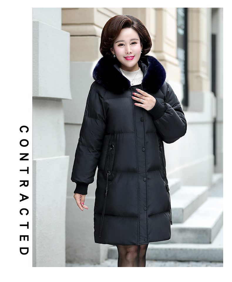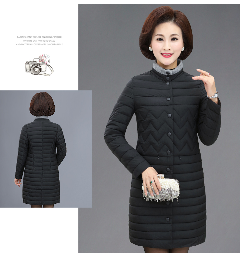 加厚羽绒棉服,中长款洋气妈妈冬装,新款棉袄外套。连帽设计,贴合颈部,舒适保暖。肩部设计走线精细,展出立体美观。袖口设计收缩,防风防寒。