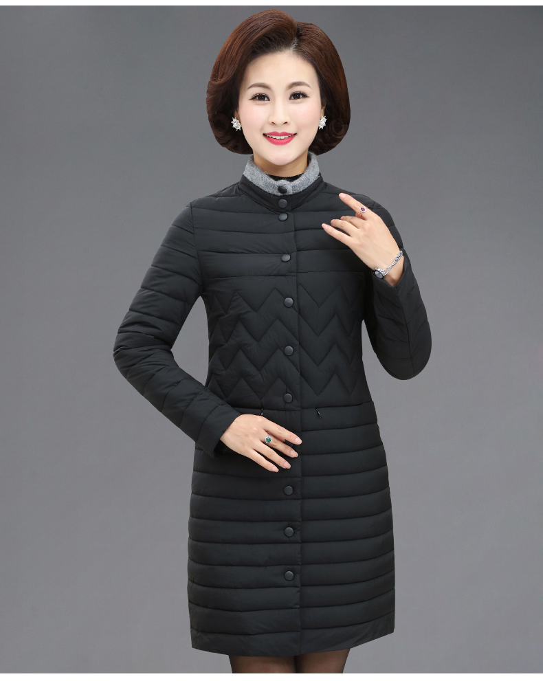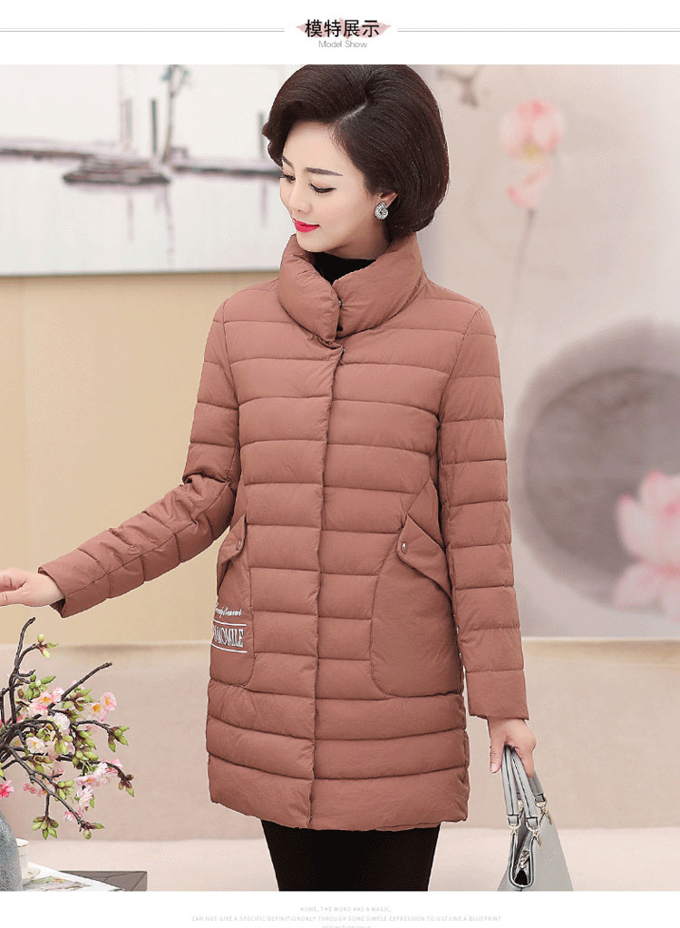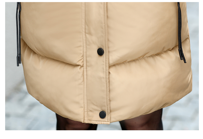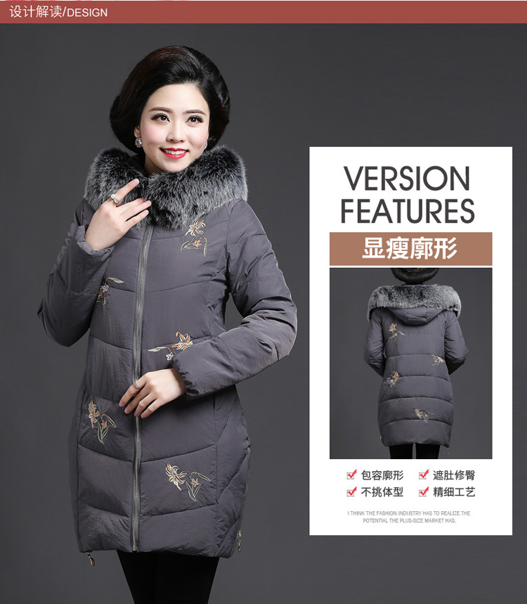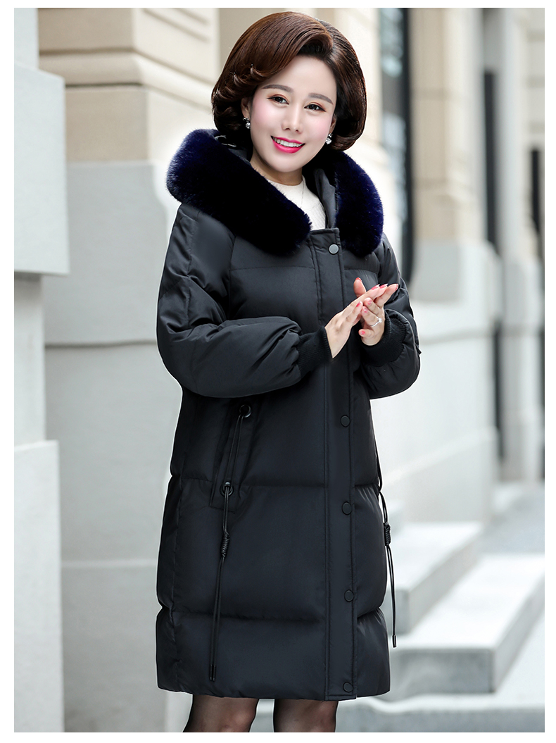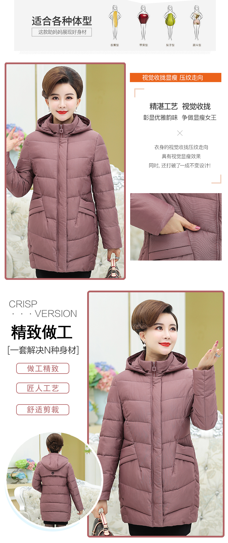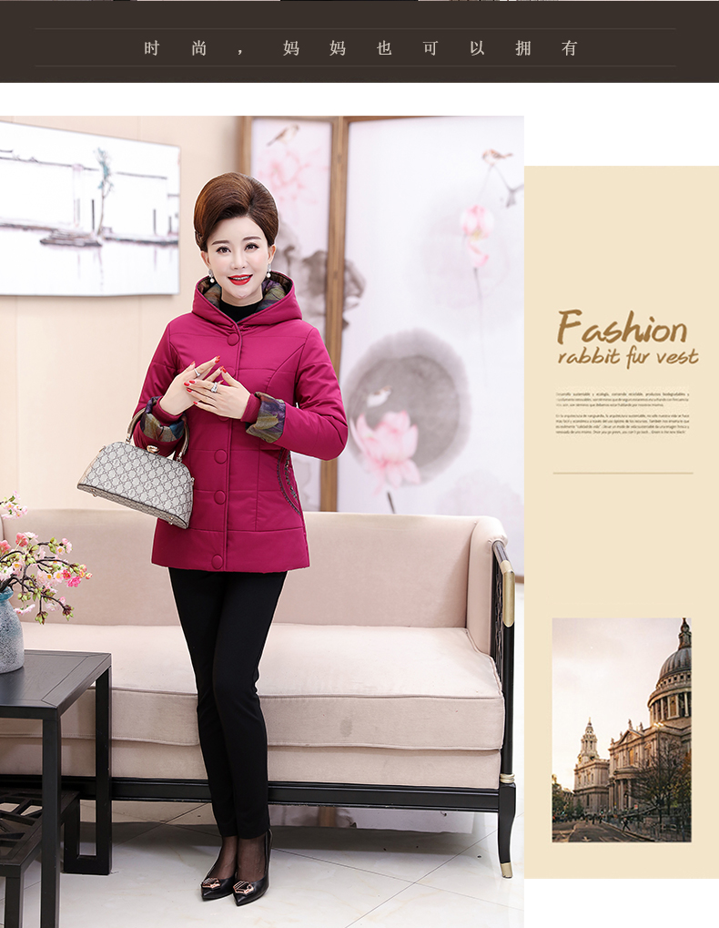 加厚羽绒棉服,中长款洋气妈妈冬装,新款棉袄外套。连帽设计,贴合颈部,舒适保暖。肩部设计走线精细,展出立体美观。袖口设计收缩,防风防寒。