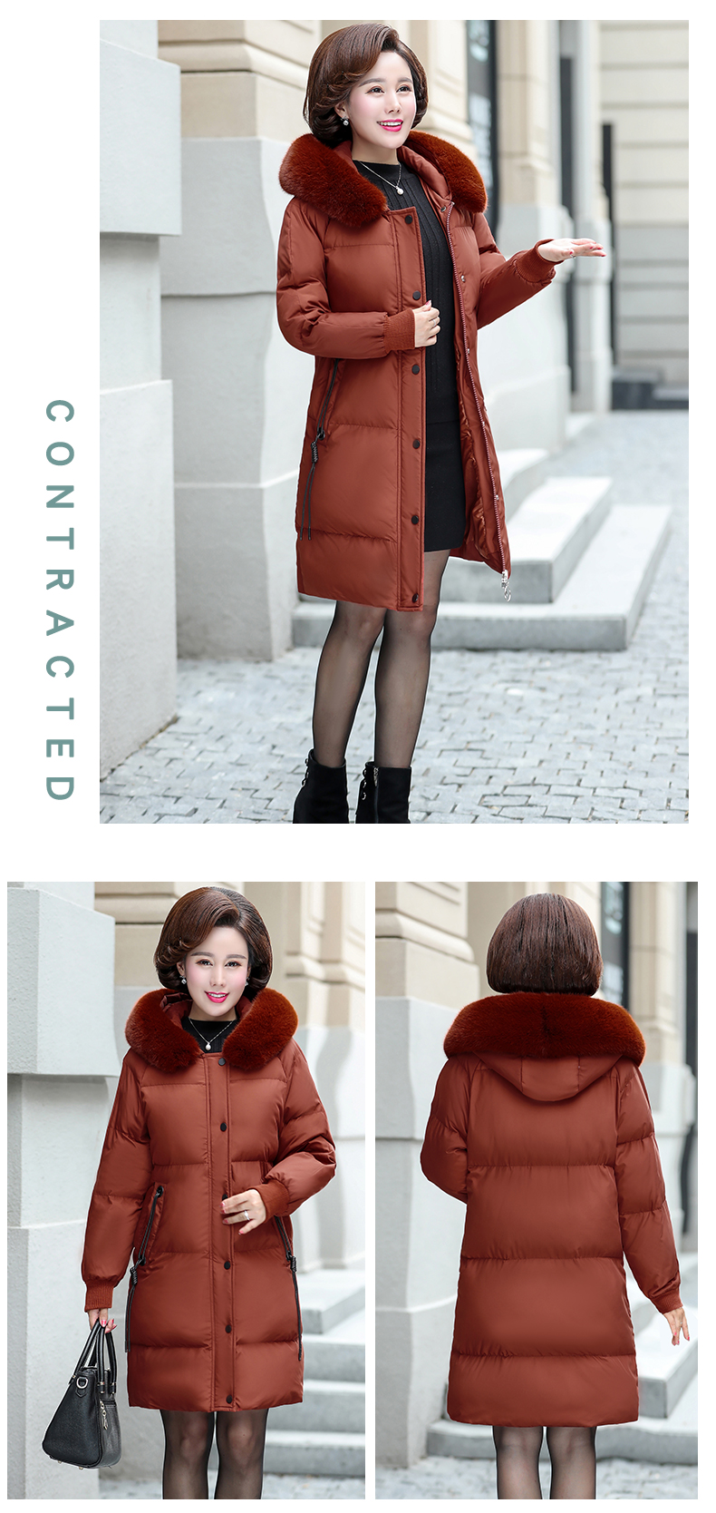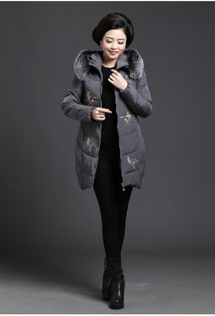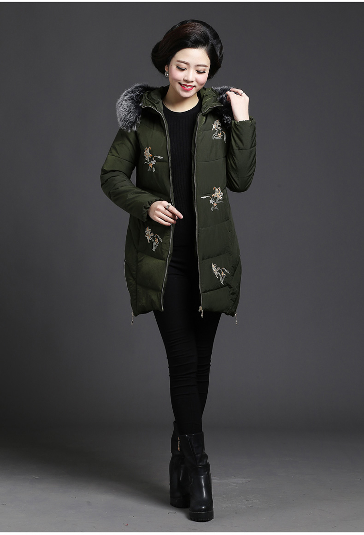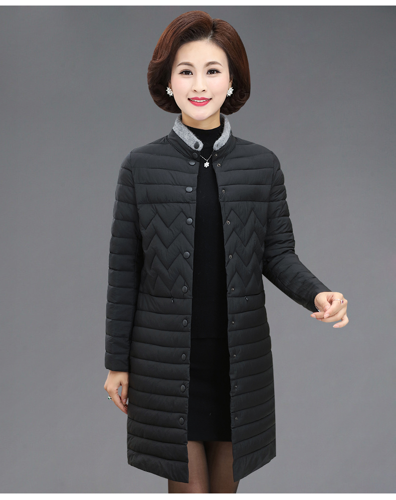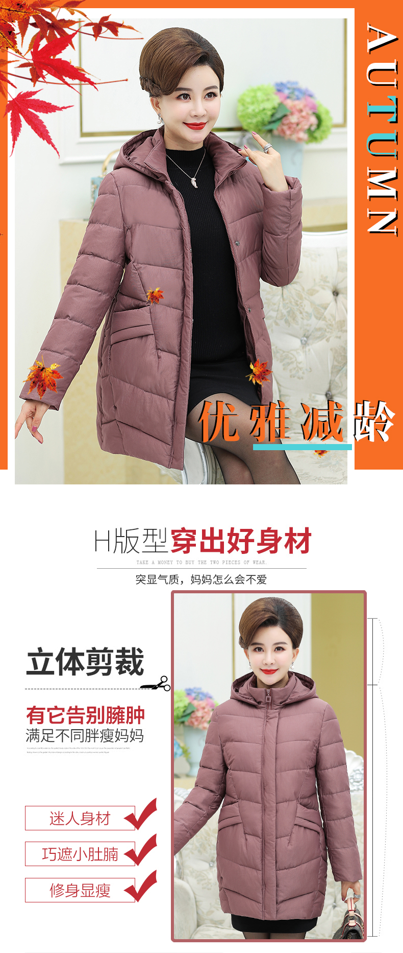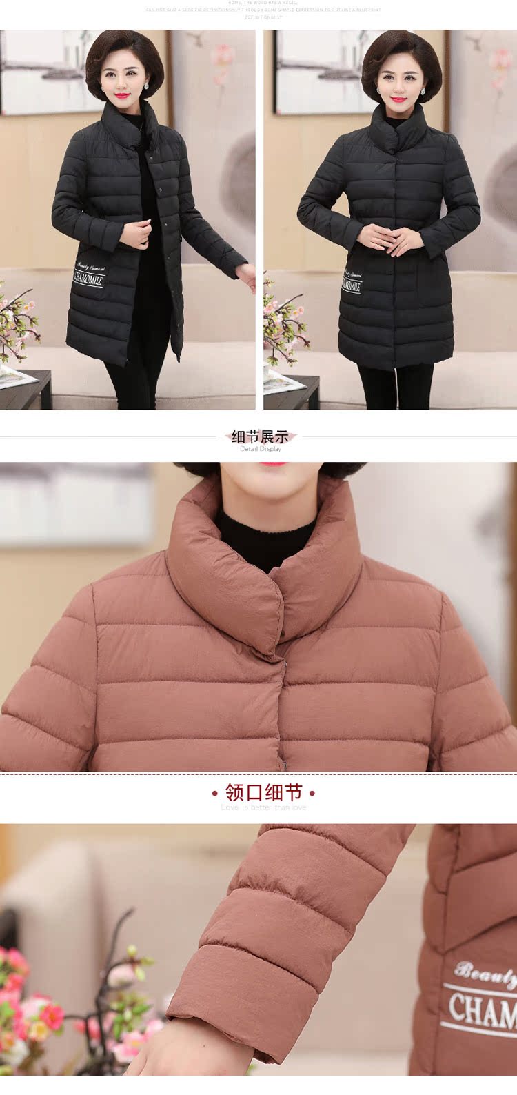 加厚羽绒棉服,中长款洋气妈妈冬装,新款棉袄外套。连帽设计,贴合颈部,舒适保暖。肩部设计走线精细,展出立体美观。袖口设计收缩,防风防寒。