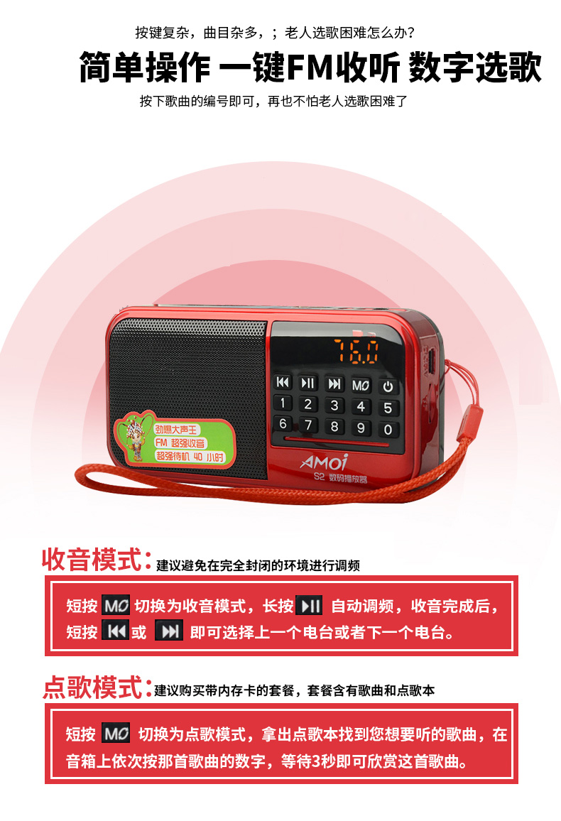 便携小巧收音机,方便实用,插卡插U盘功能多,数字按键选曲操作简单,是老人家休息娱乐好帮手。【赠运费险】