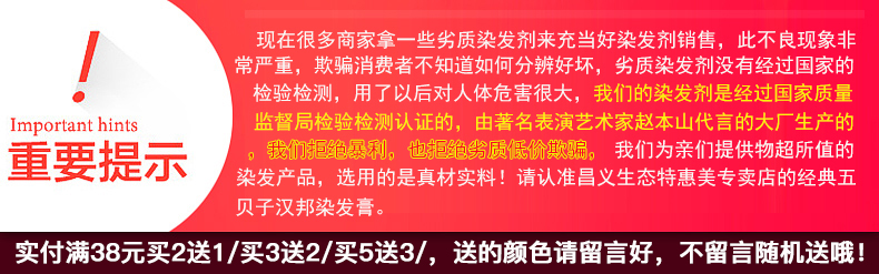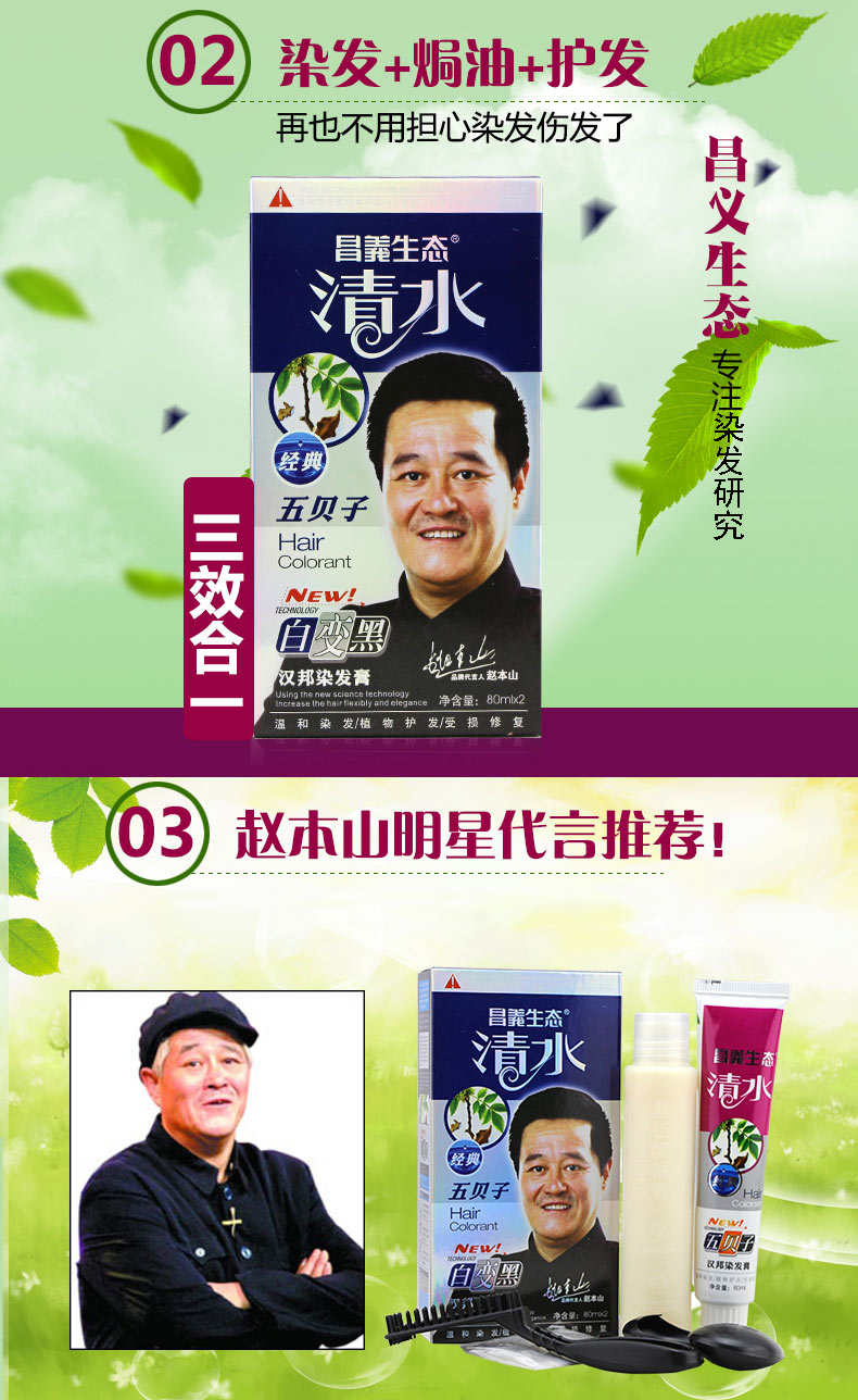 赵本山倾情代言,值得信赖,清水配方,温和天然,不沾头皮,黑发焗油三效合一,15色任你挑选,下单即送梳子、手套、耳罩,到手既可以放心使用!
