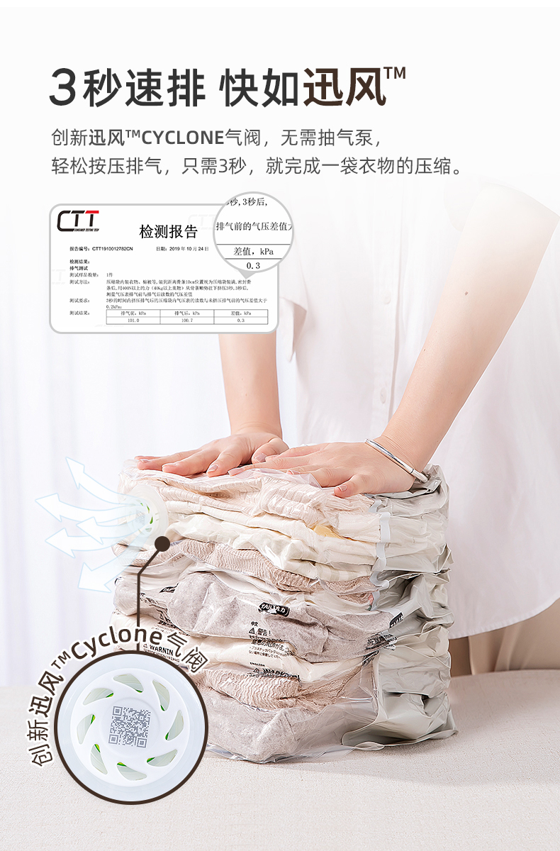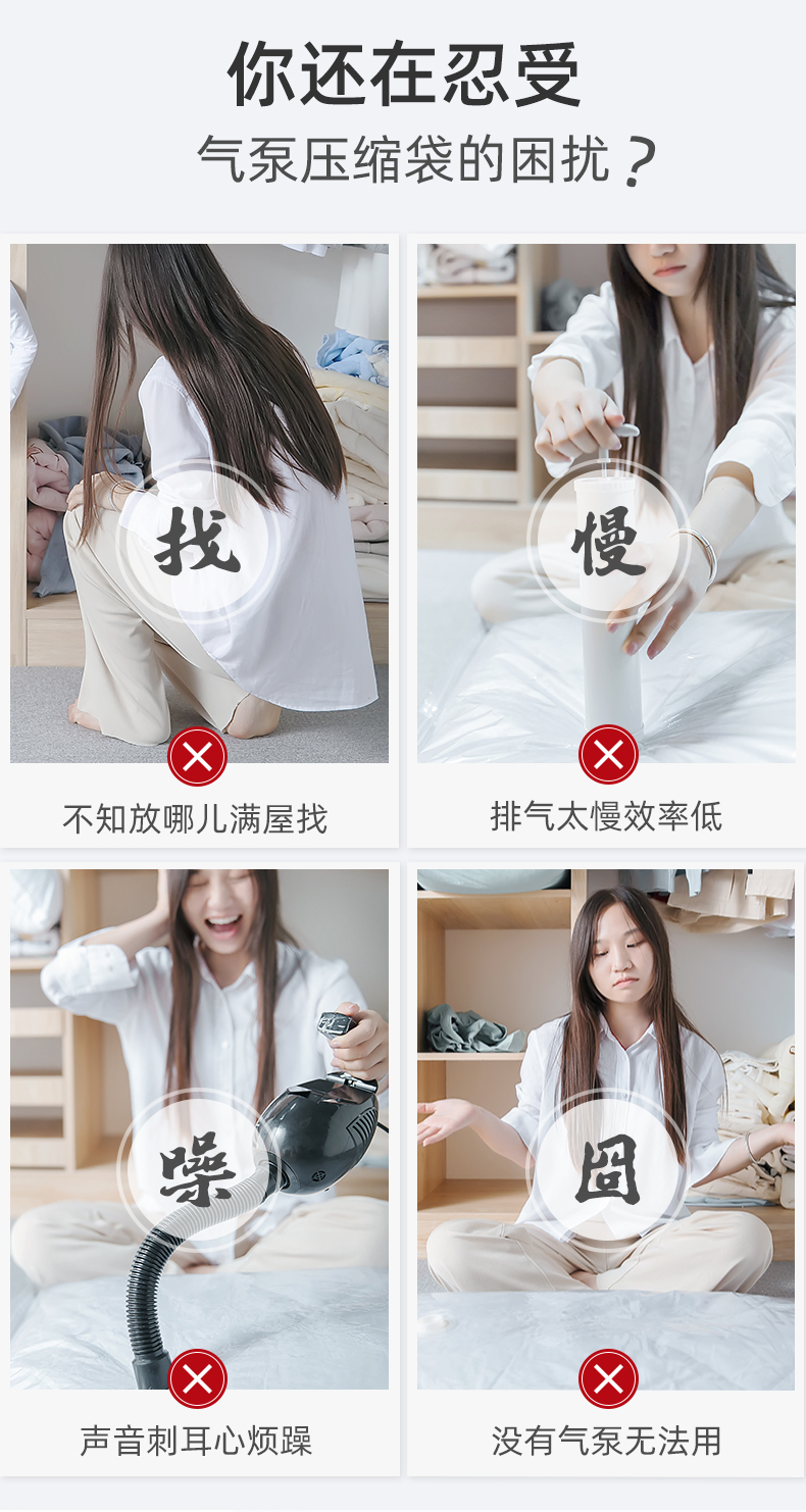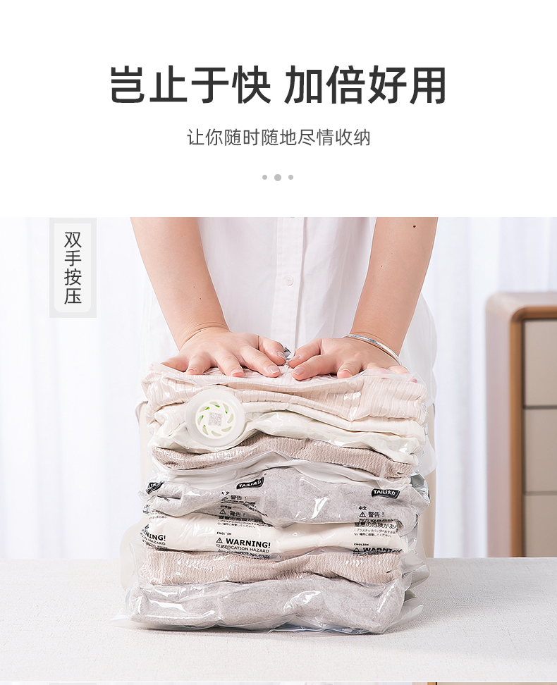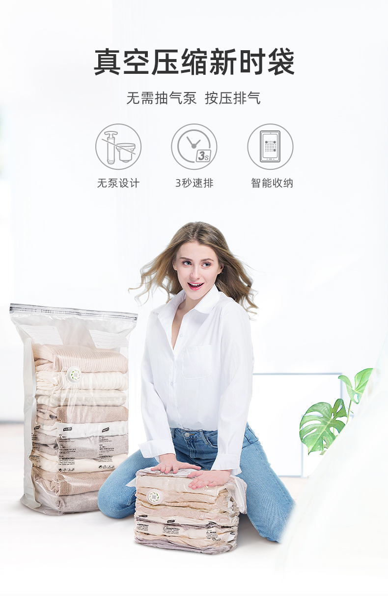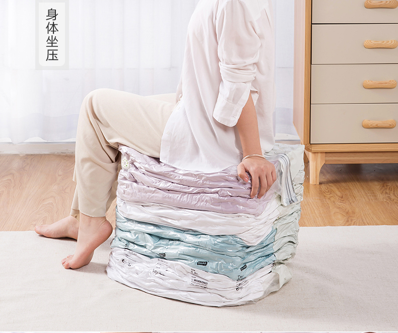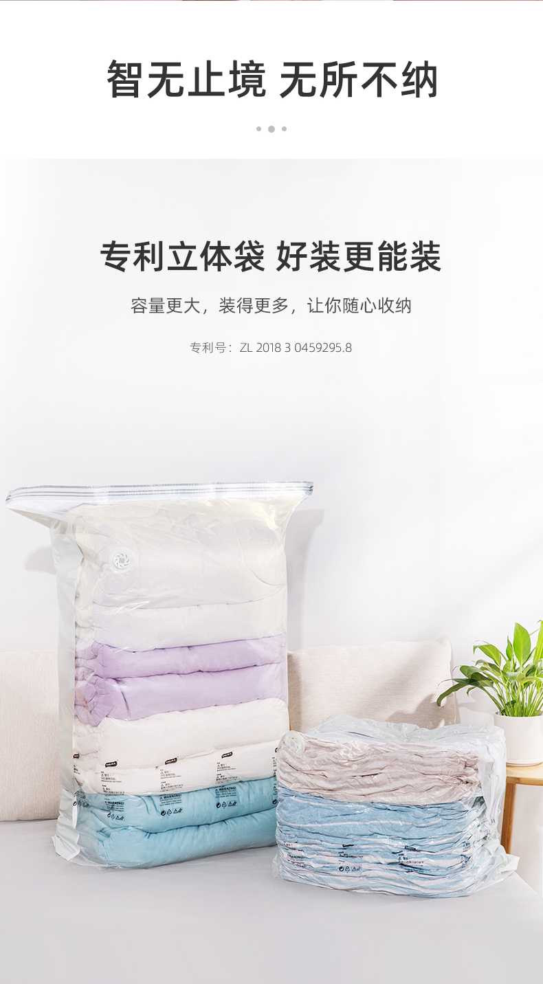 居家收纳必备,好叠放,省空间。按压排气,无需抽气泵,仅需八秒,轻松收纳。悬浮气阀,排气更快速,高分子材质,透明好分辨,封口更轻松!【赠运费险】