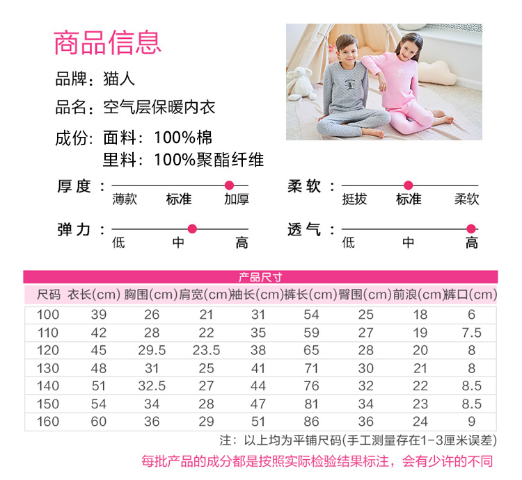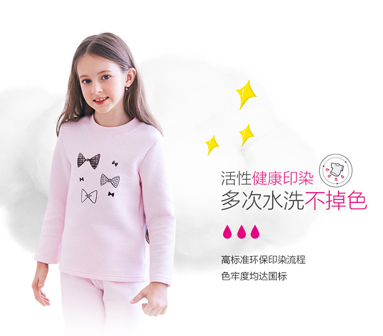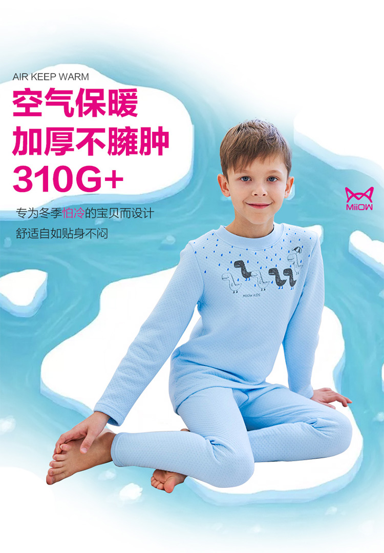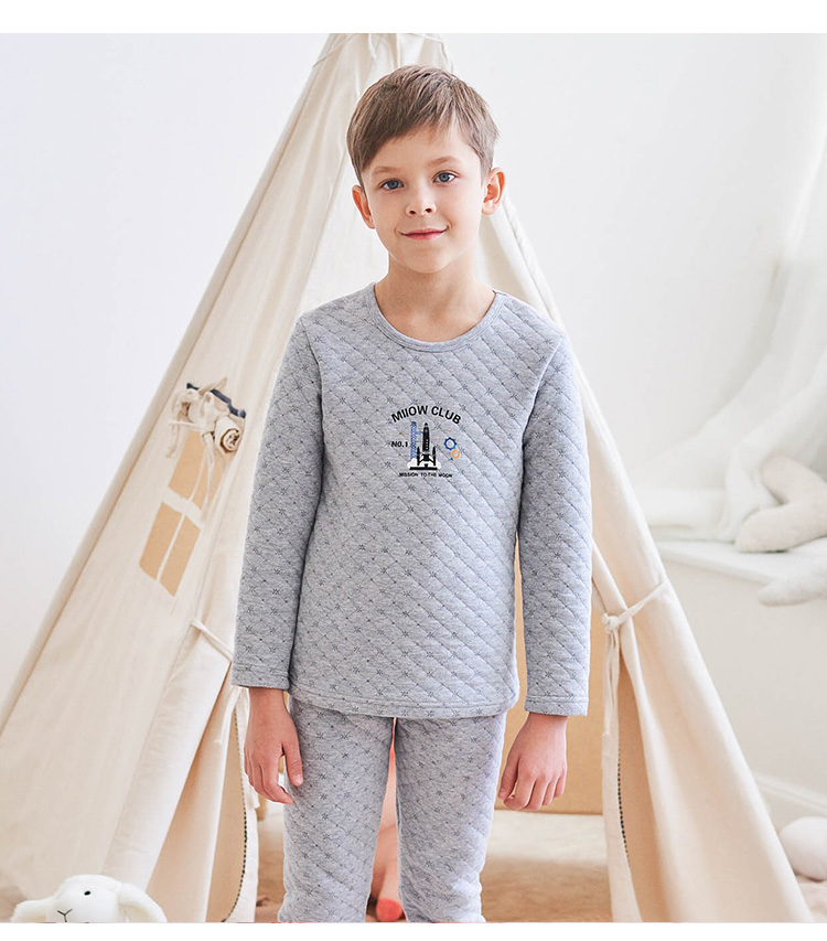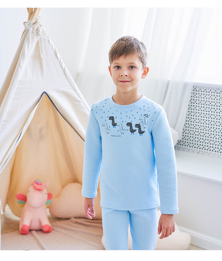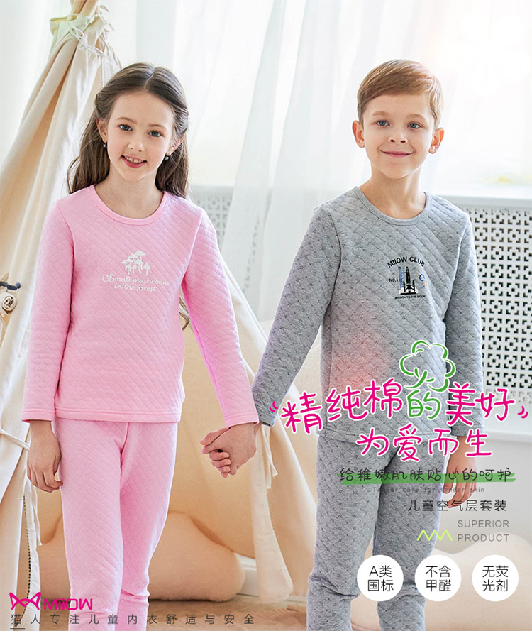 猫人儿童三层保暖内衣套装夹棉男童女孩全棉中大童秋衣秋裤纯棉