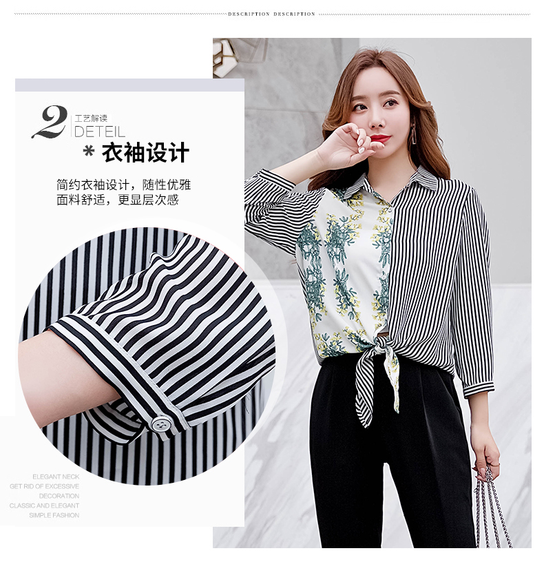时尚打底衫2019早秋新款七分袖印花上衣韩版宽松条纹拼接休闲衬衣