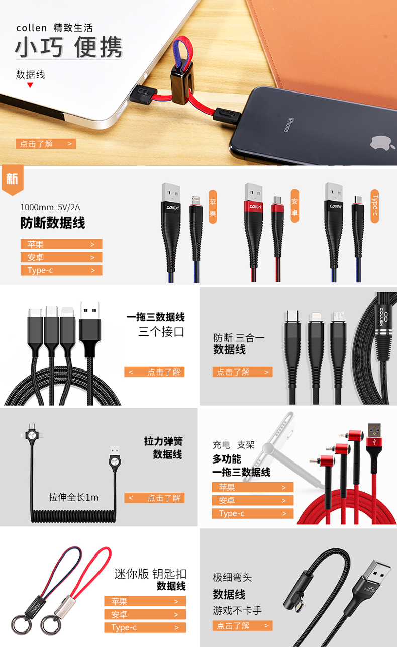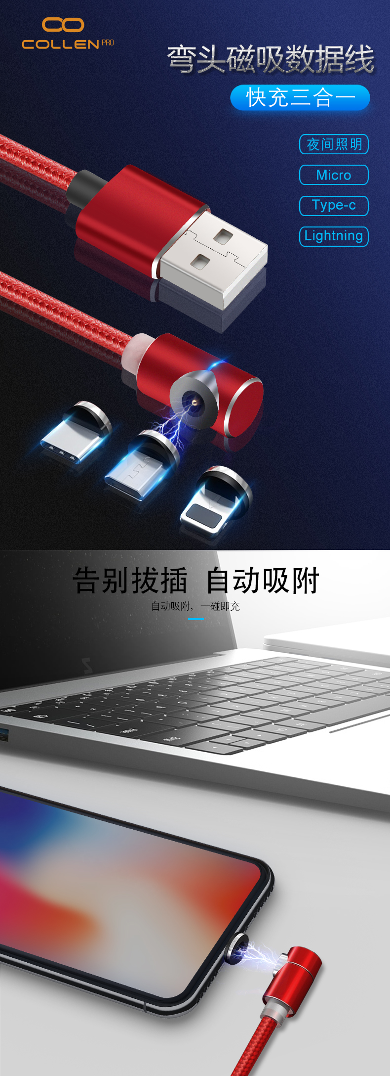 三合一充电线华为Type-C安卓车载苹果XR声控弯头一拖三磁吸数据线