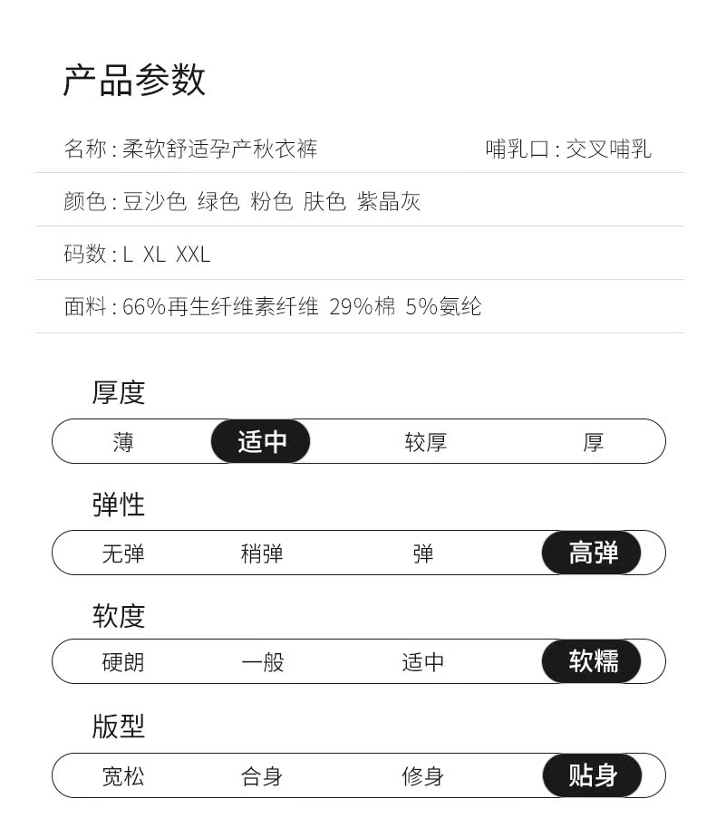 【推荐理由】内置背心设计喂奶方便,不尴尬。水洗不变形弹力又贴身款式。交叉式哺乳,多次都不会变形,质量绝对好!40支精梳棉,30D高弹氨纶,裤子松紧设计,孕期产后都可以穿。