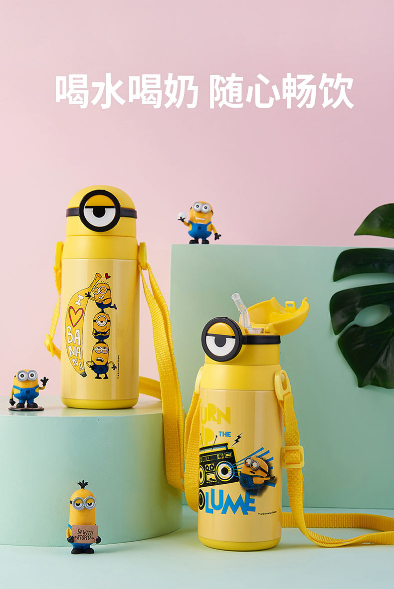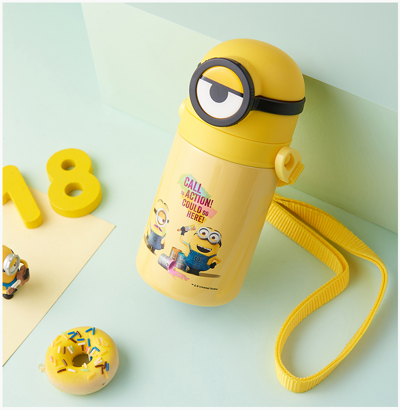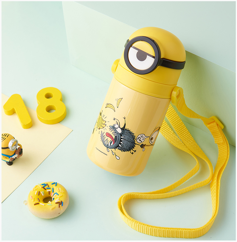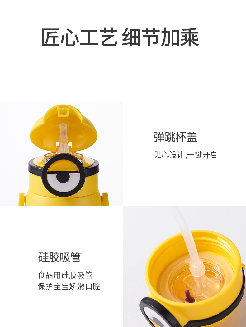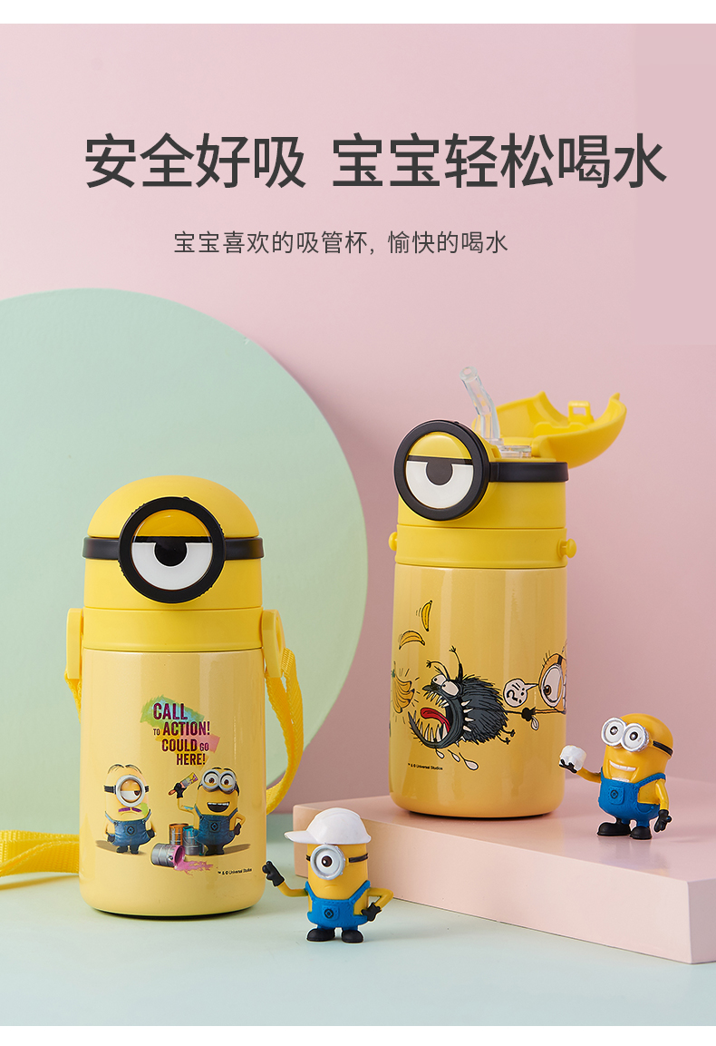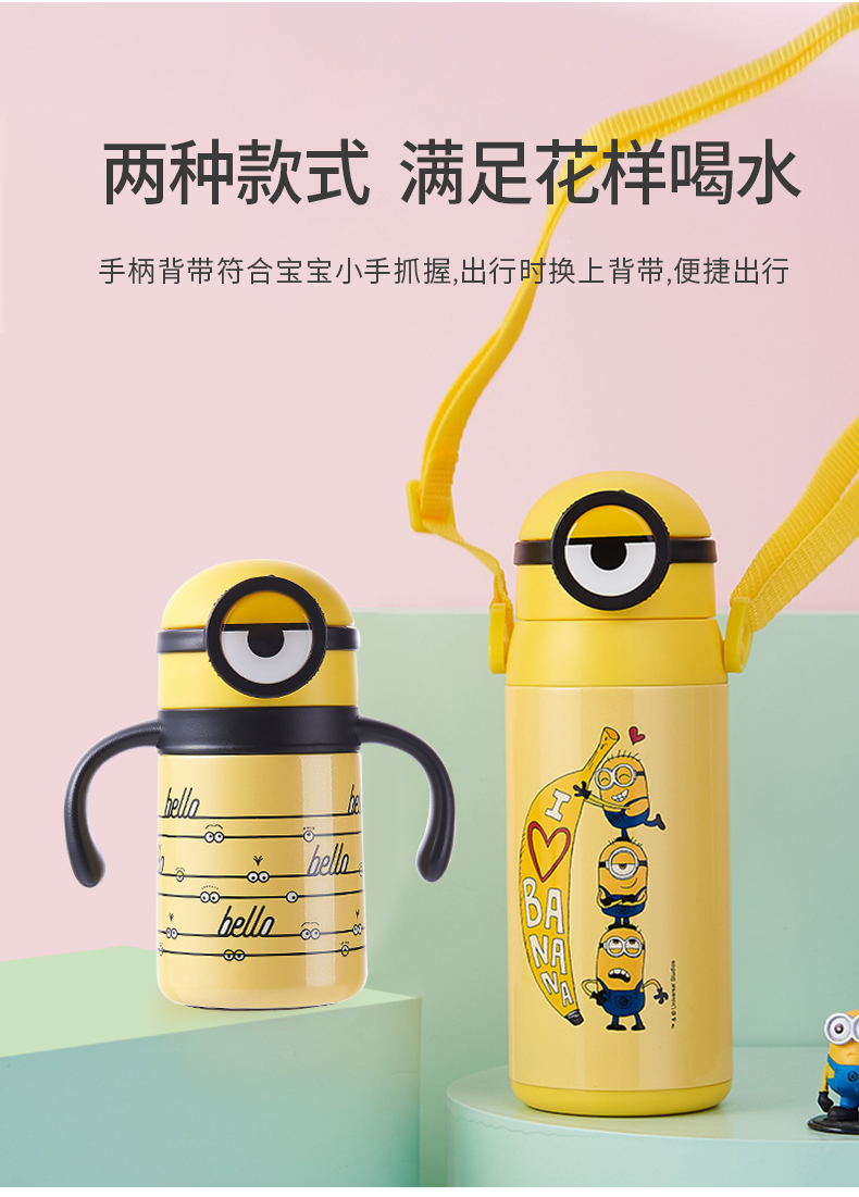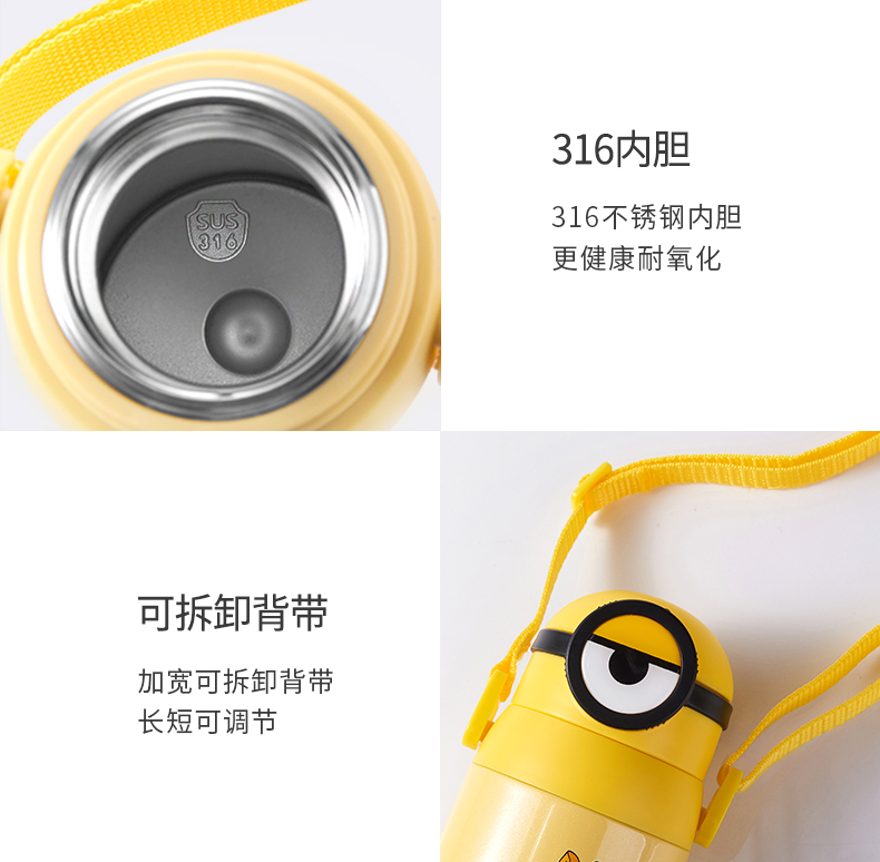 医用级316材质,Tritan内盖,小黄人萌酷设计,防呛设计,专用水壶背带,易握手柄,童真色彩,一见倾心,翻盖设计,防尘防漏,多色可选,让宝宝爱上喝水【赠运费险】