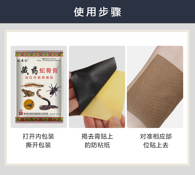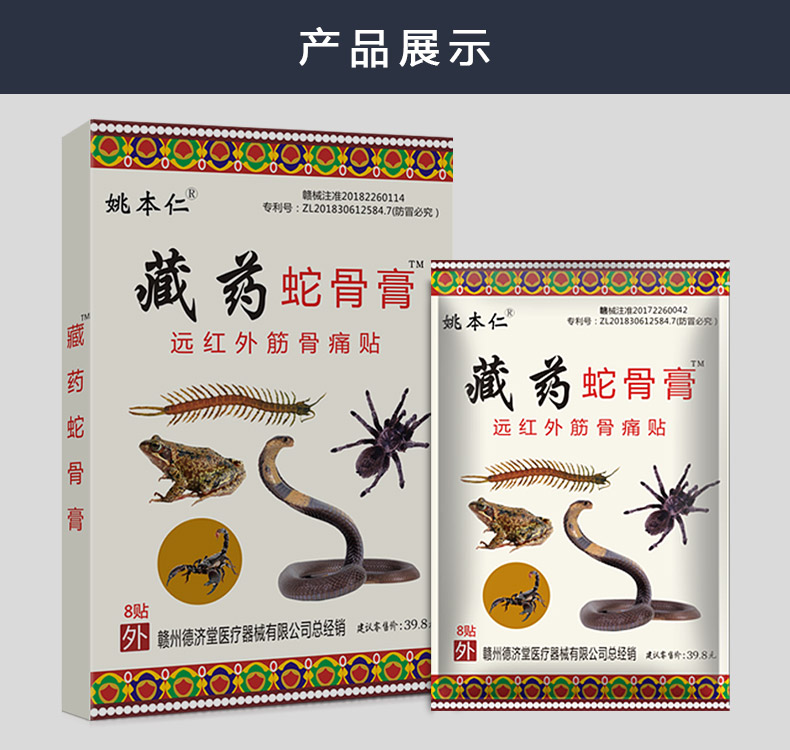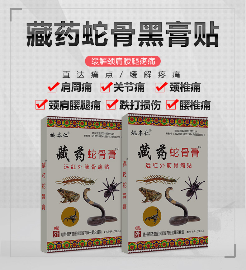 【姚本仁旗舰店药店同售】藏药蛇骨贴舒筋活络、祛风镇痛,主治肩周炎、关节痛、腰间盘突出、颈椎痛、风湿痛等。藏药蛇骨贴渗透力强,有效成分直达痛点