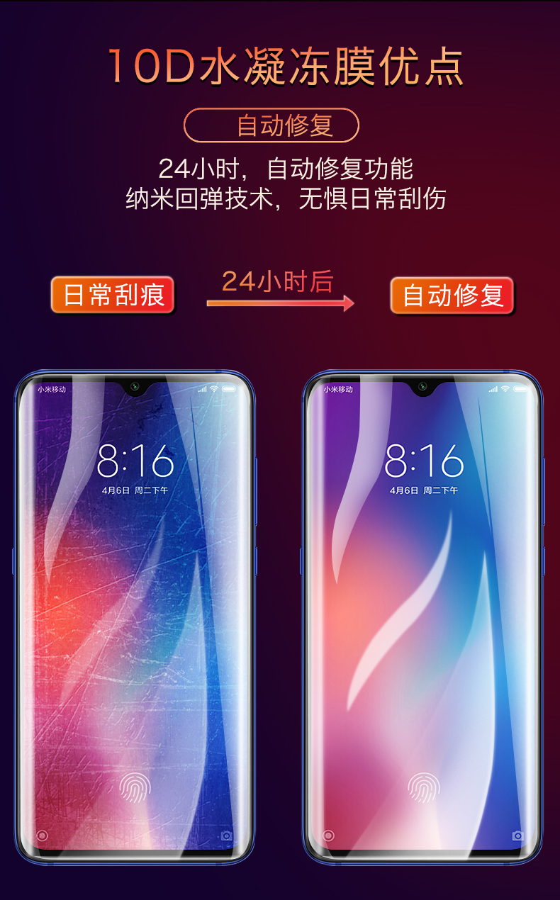 【三片装+神器】真1D水凝膜。全屏覆盖,告别碎屏,采用纳米融合技术,24小时内划痕自动修复完整!抗蓝光,保护眼睛,无白边,无气泡,无需喷水!还原裸机手感!!