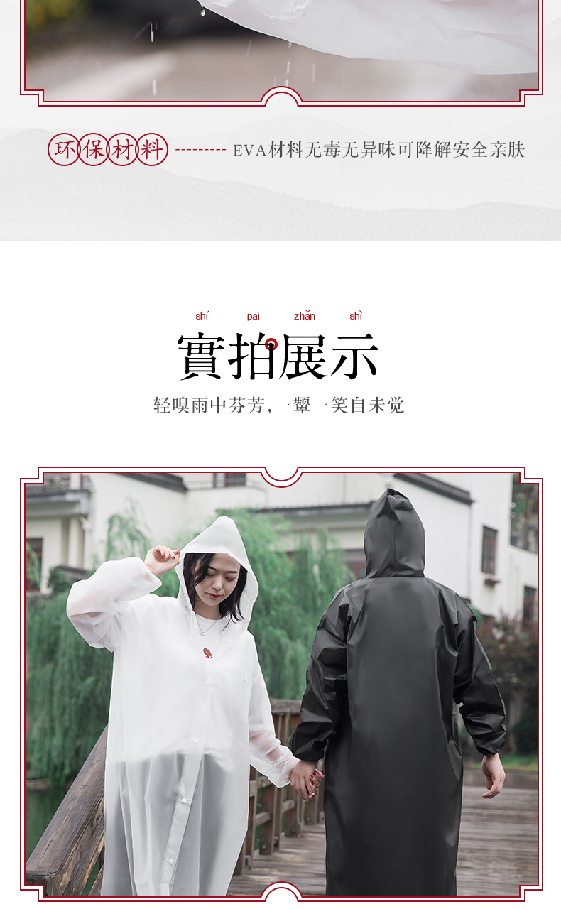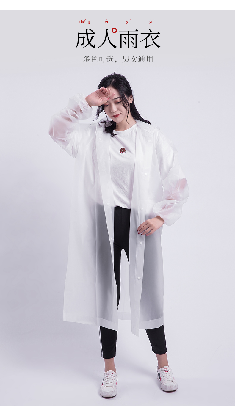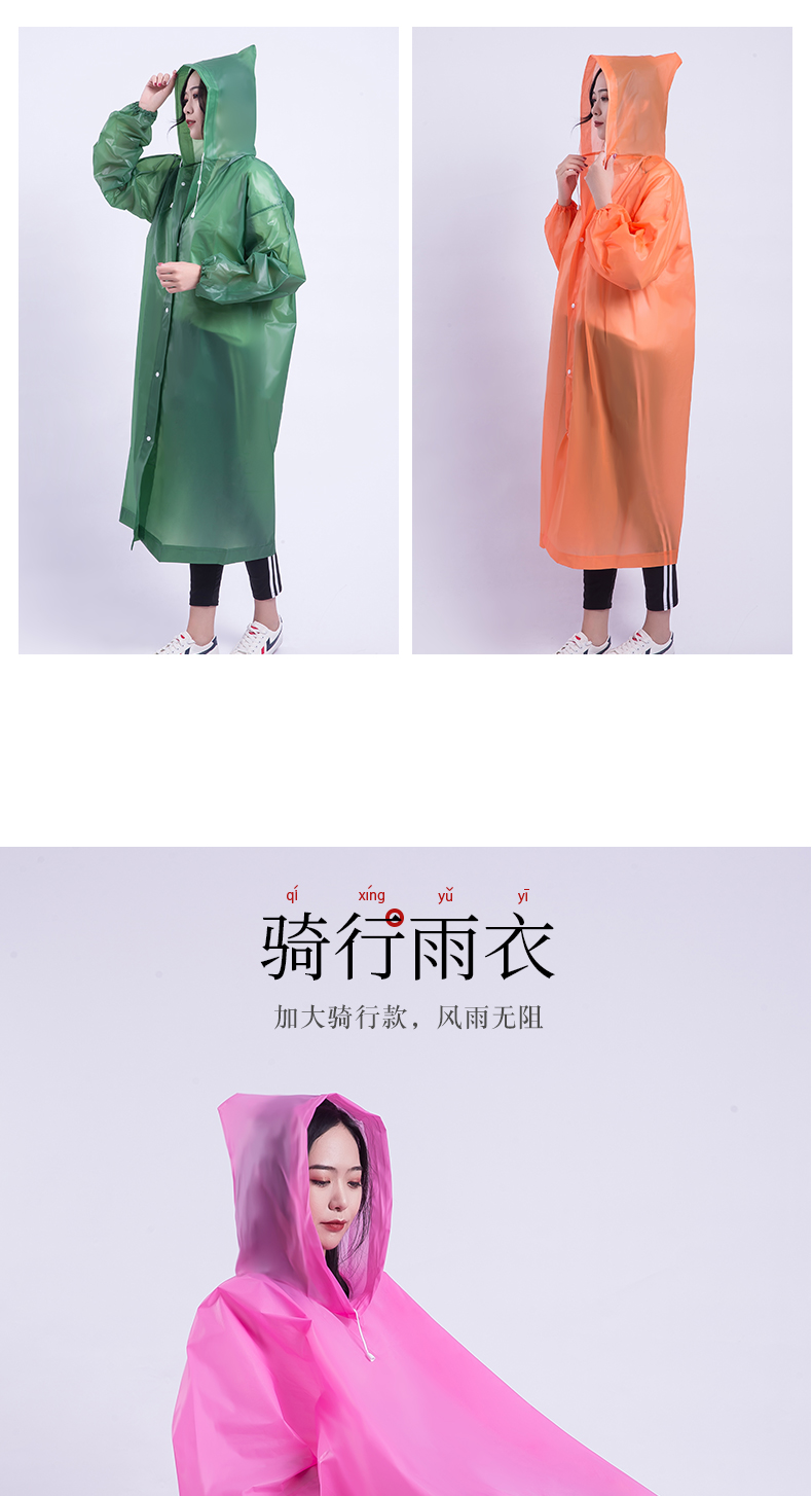 时尚加厚款男女通用,无限次使用,无毒EVA透明材质,柔韧轻薄耐用!全方位挡水挡风;透气不闷人,携带方便!
