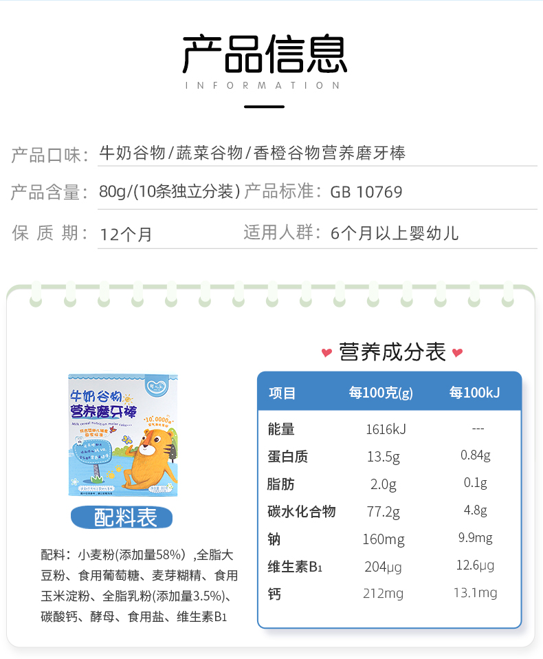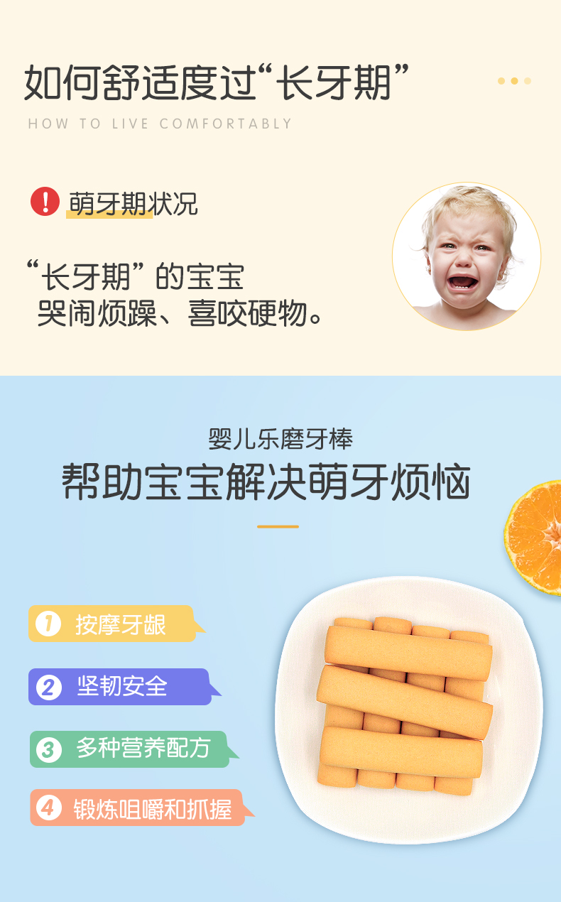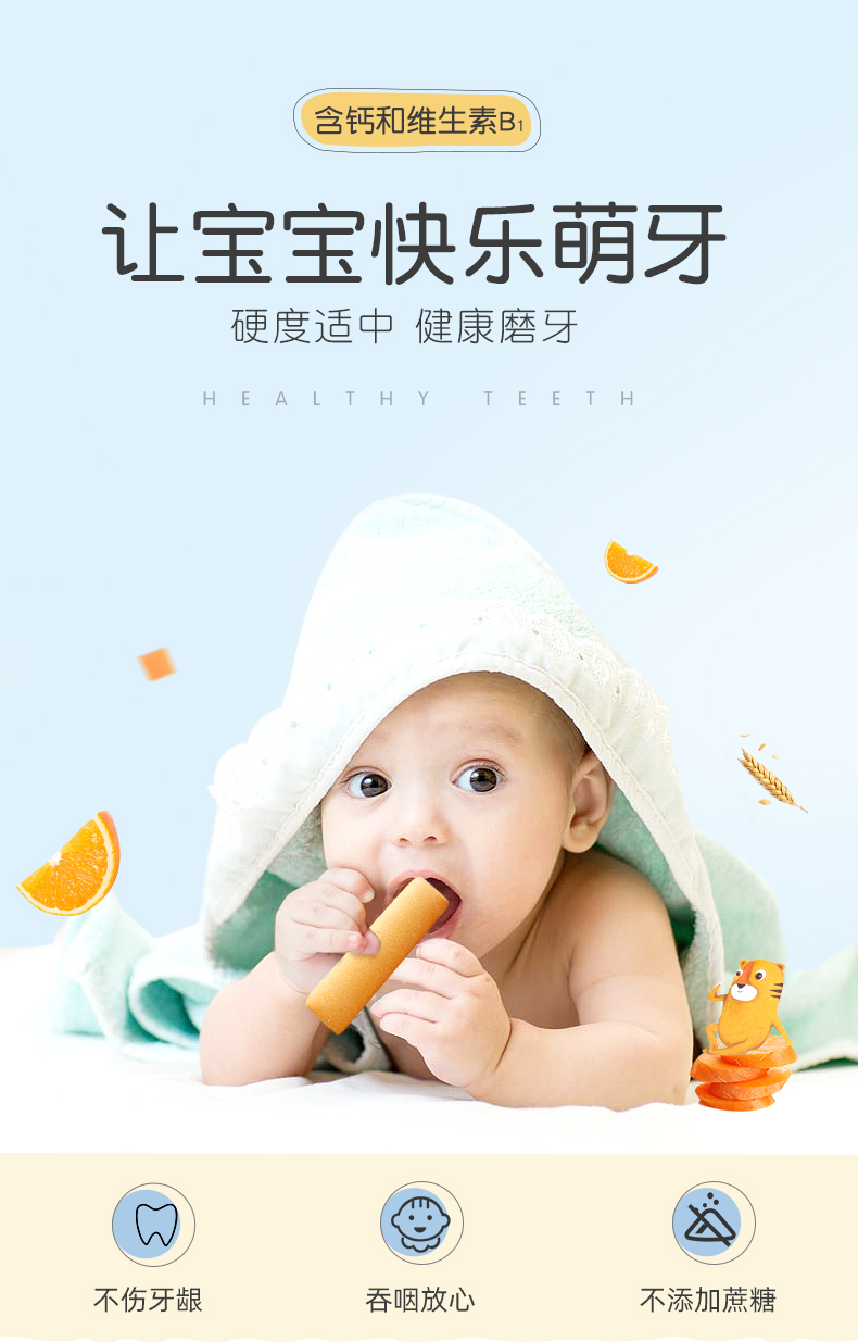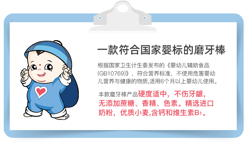 【一款符合国家婴标的磨牙棒】磨牙好伴侣,高钙磨牙棒。硬度适中,不伤牙龈。无添加,无防腐。有效按摩牙床,刺激乳牙萌出。70年母婴品牌,精致呵护宝宝健康成长。【赠运费险】
