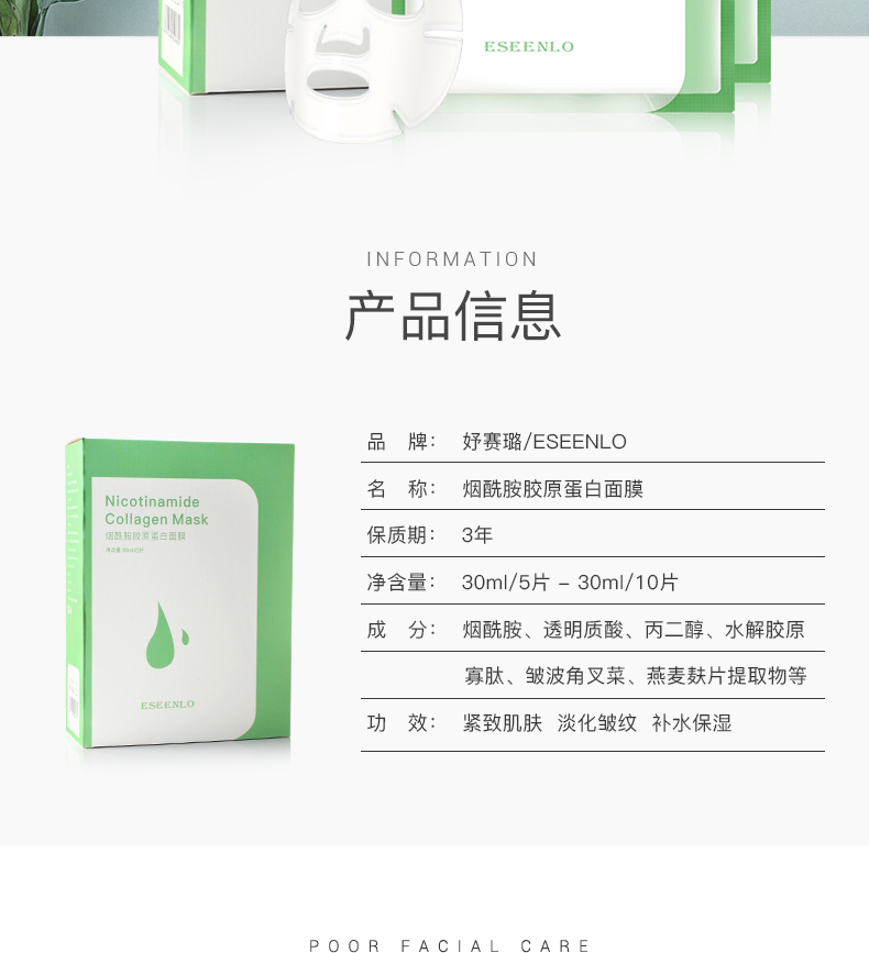 妤赛璐烟酰胺胶原蛋白面膜,透明补水保湿滋养亮白提紧致,脸部护理不佳各种问题各种解决,整张胶原蛋白敷在脸上,肌肤嫩到发光~