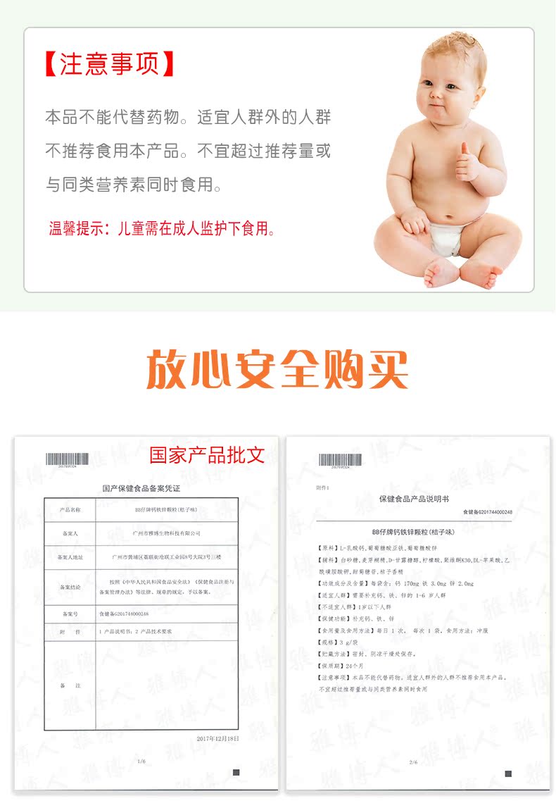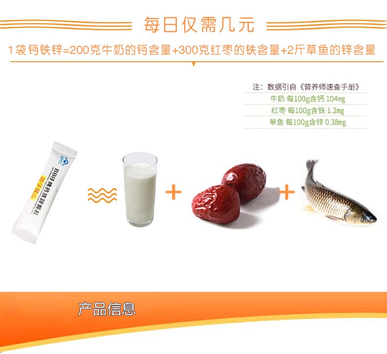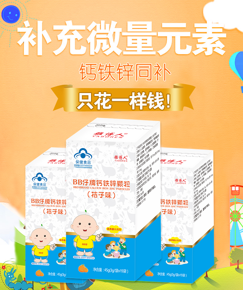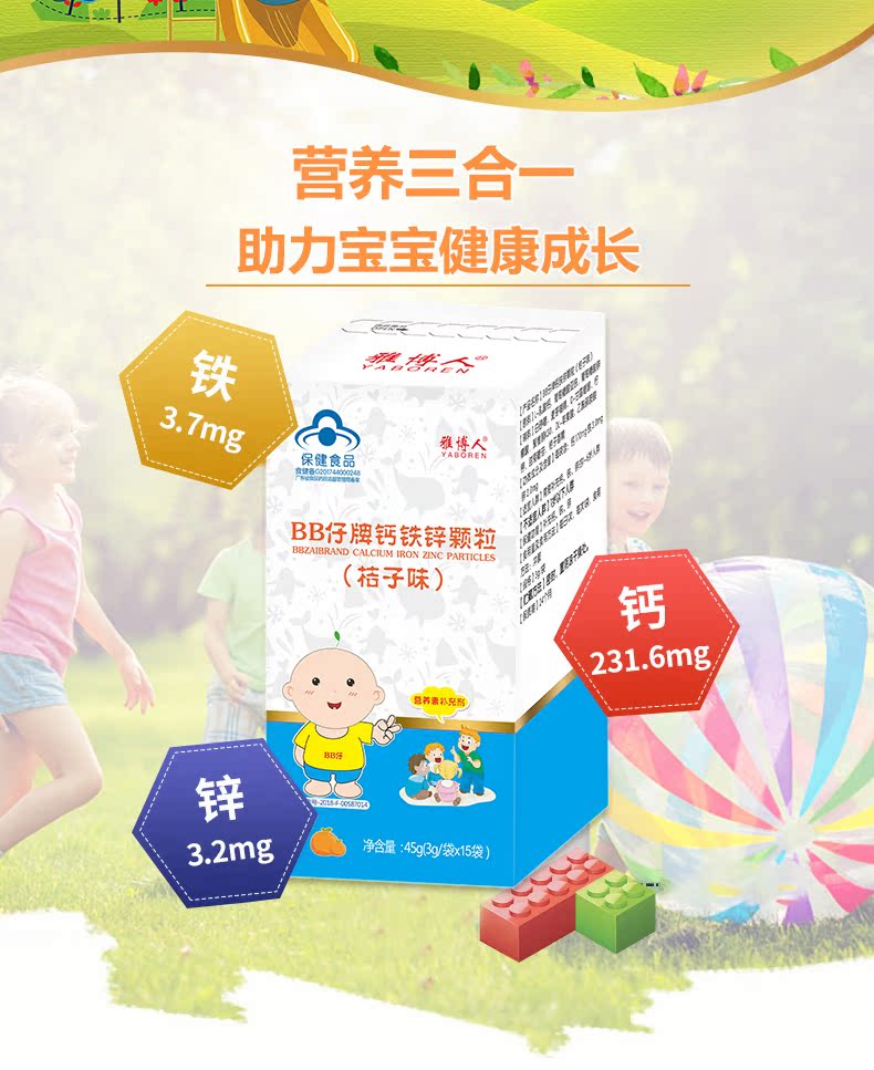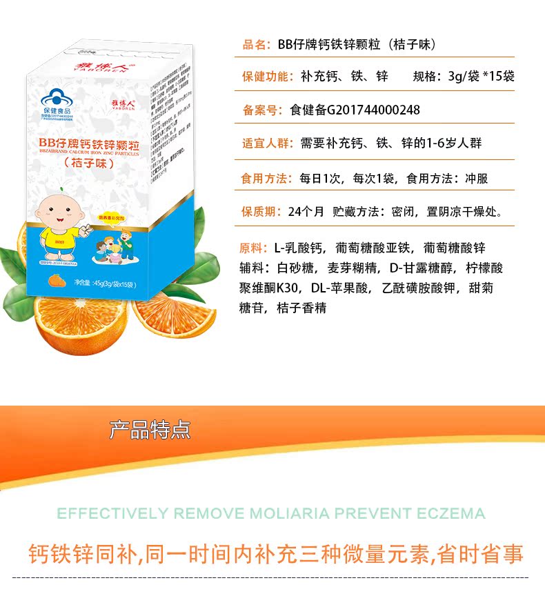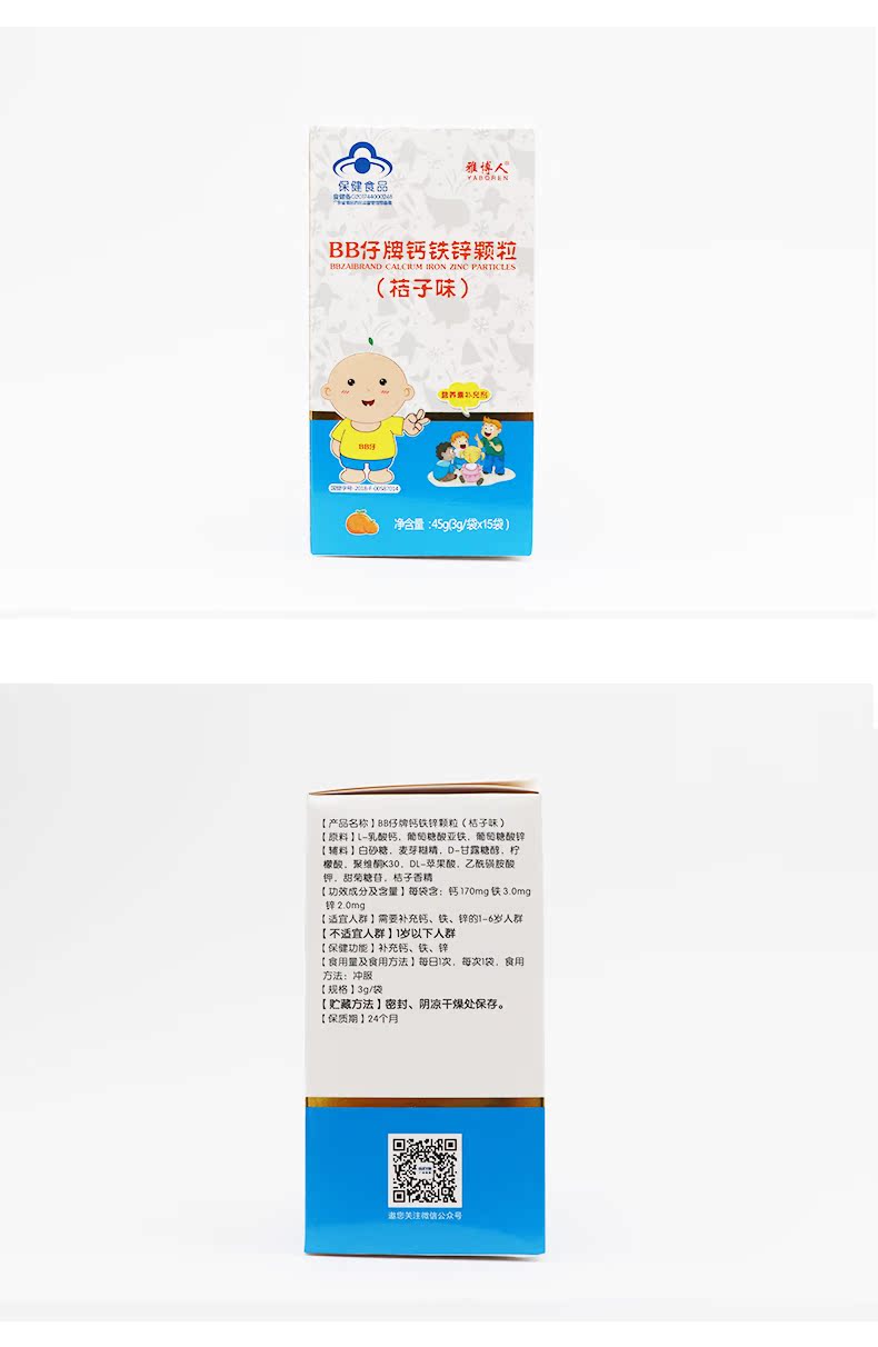 【橘子味BB仔牌钙铁锌颗粒】3g/袋*15袋,每日一次,每次一袋,钙,铁,锌,营养三合一,助力宝宝健康成长,就给宝宝选择最棒的!
