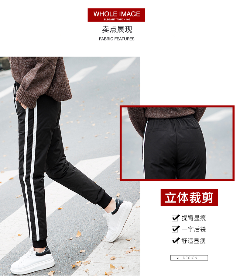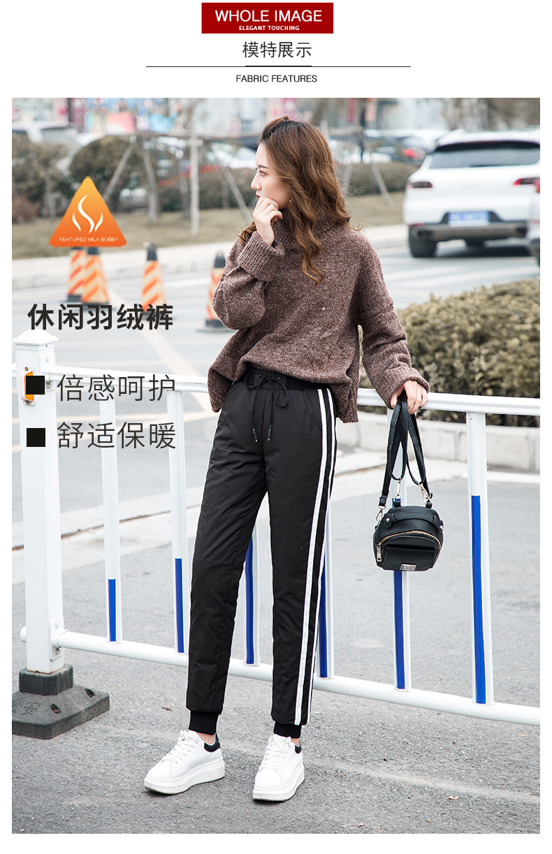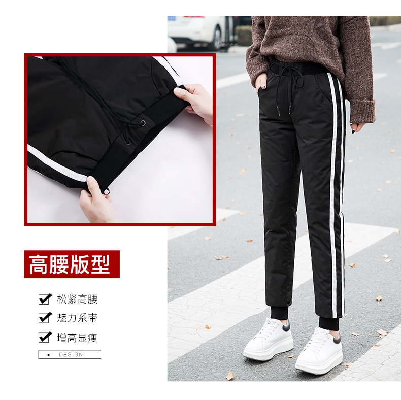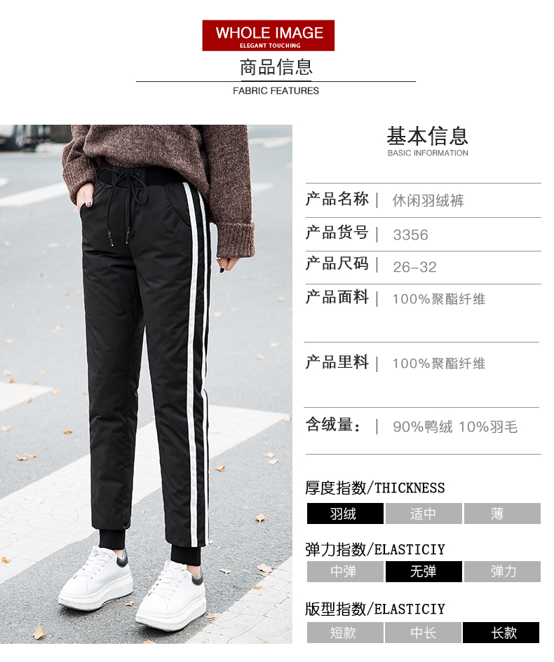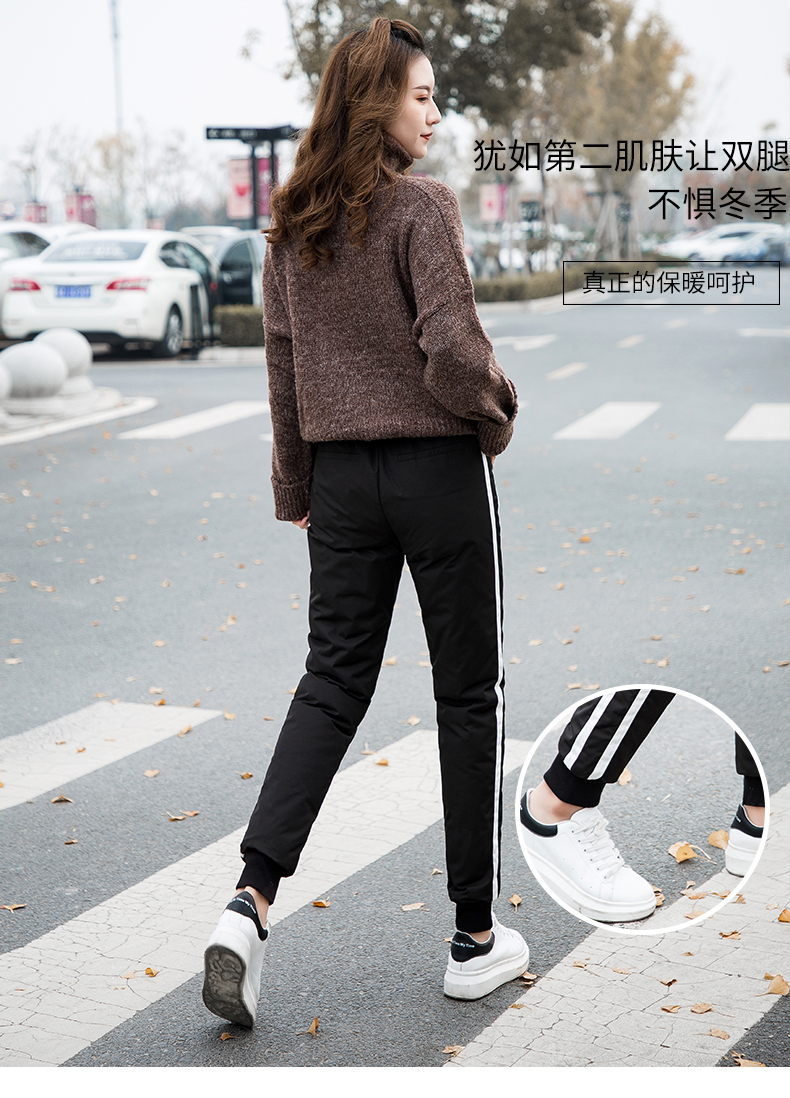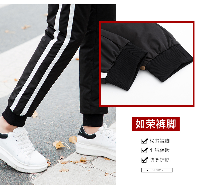 【降温了!下单趁早】精选鸭腹大朵绒,90含绒量,轻盈琐温,防风保暖不钻绒,舒适保暖,显瘦不臃肿,松紧腰设计,束口裤脚,侧边条纹运动休闲!显瘦保暖,一条搞定!冬天不怕冷~