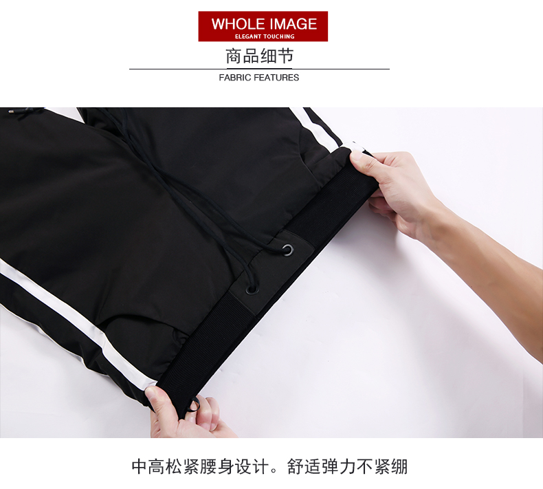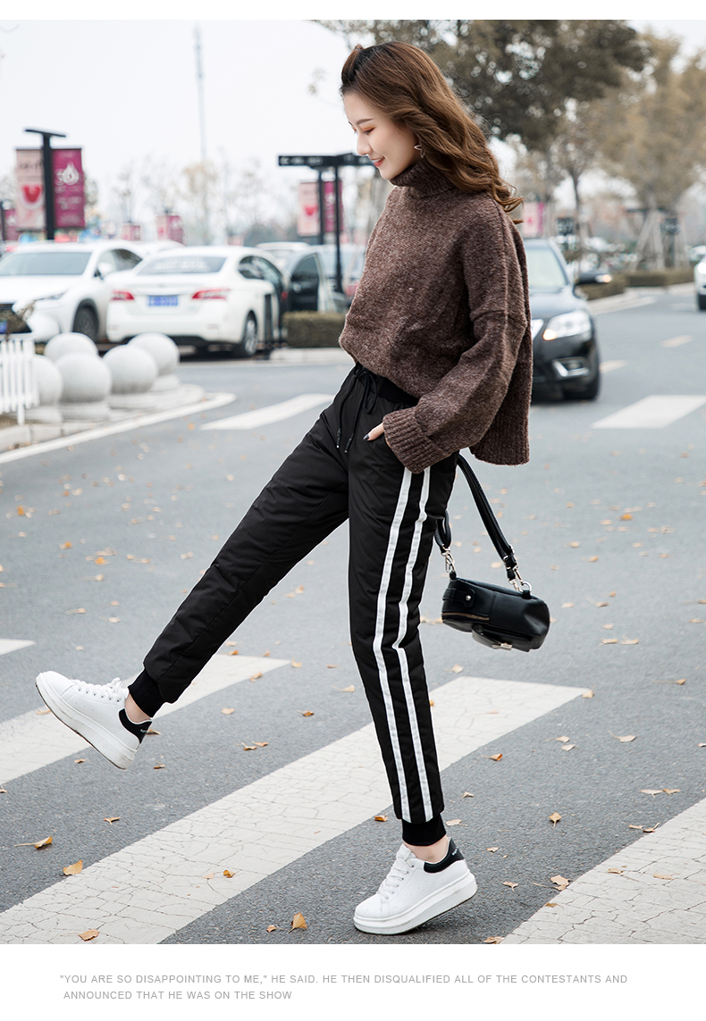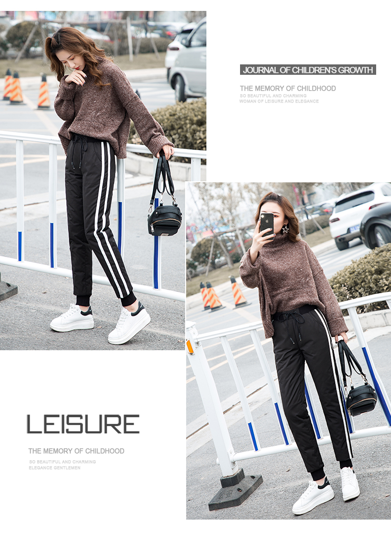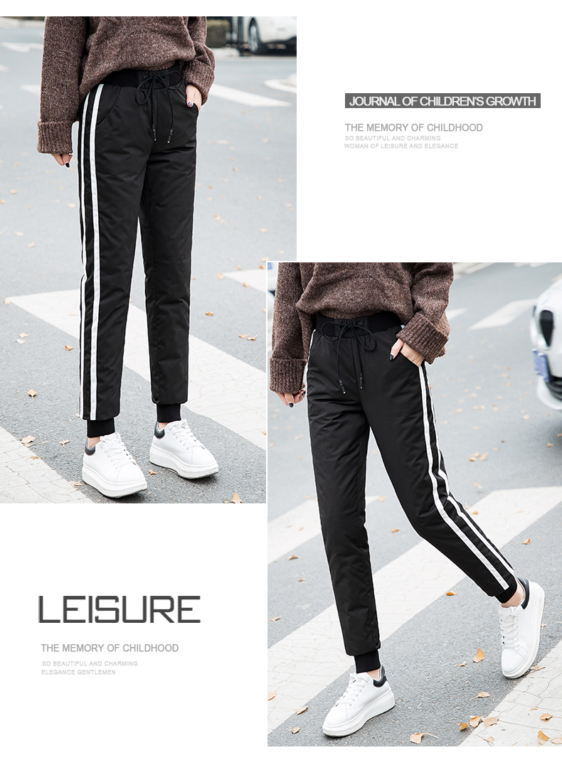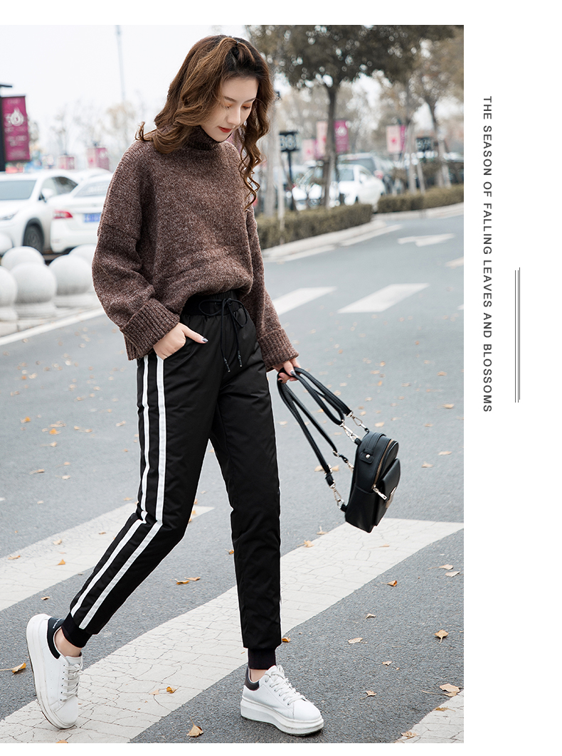 【降温了!下单趁早】精选鸭腹大朵绒,90含绒量,轻盈琐温,防风保暖不钻绒,舒适保暖,显瘦不臃肿,松紧腰设计,束口裤脚,侧边条纹运动休闲!显瘦保暖,一条搞定!冬天不怕冷~