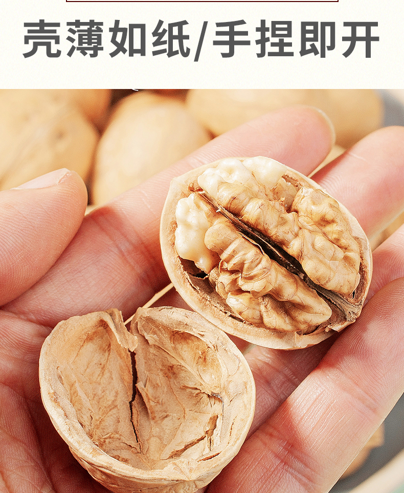 薄皮核桃,今年新货,新疆薄皮核桃,手捏即开,皮薄果肉饱满,越嚼越香,新鲜香脆,圆润饱满,营养价值高,健康零食