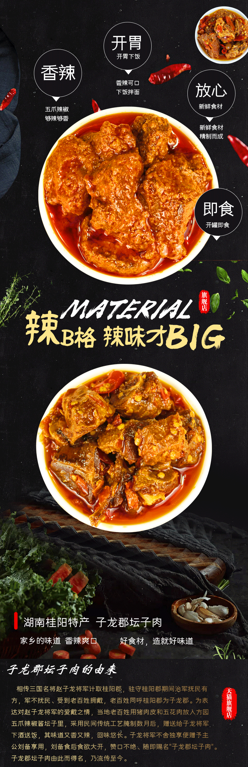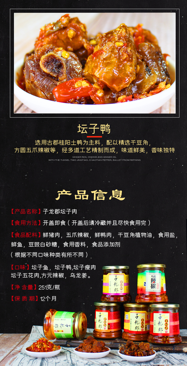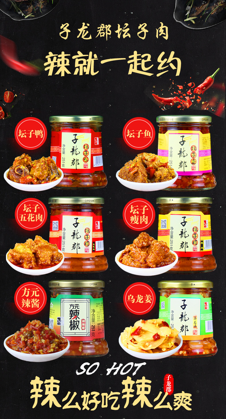 【推荐理由】子龙郡旗舰店,专业做坛子肉,湖南桂阳特产,多种口味,任您选择,五爪辣椒,够辣够香,全部采用新鲜食材精致而成,开胃神器,看着口水都掉下来了,吃完还想吃,根本停不下来!!