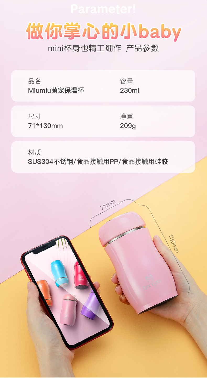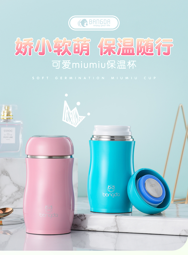 邦达原创设计,可爱miumiu保温杯,304不锈钢内胆,保温更持久,底部防滑,360度密封防漏,5种颜色任你挑选,小身材大容量,包包轻松装下,成为你随身携带的小温暖【赠运险费】