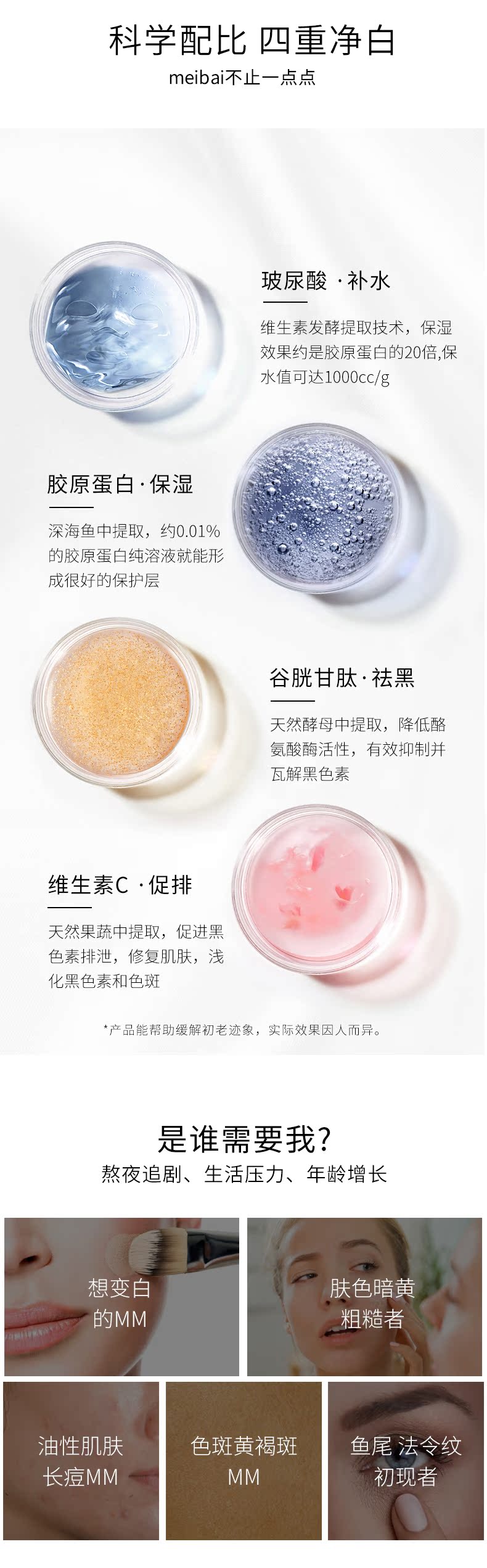 全效焕白配方,吃1补6,特添加SOD焕白因子,辅助淡化黑色素,提亮肤色,延缓皮肤衰老,整体改善肤质,令肌肤焕白新生!