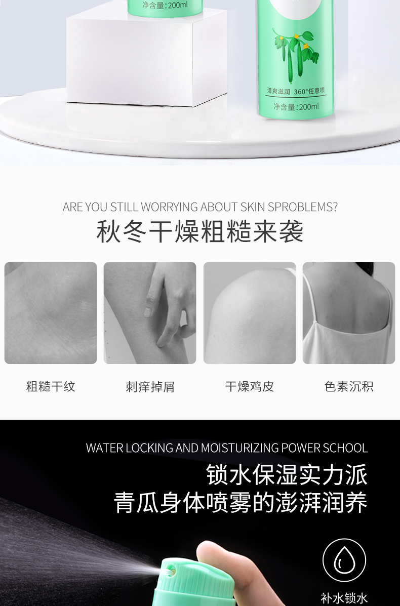 清爽青瓜配方,补水控油,紧致肌肤;舒缓干痒,抑制冬天干燥掉屑,持续保湿8到24小时~