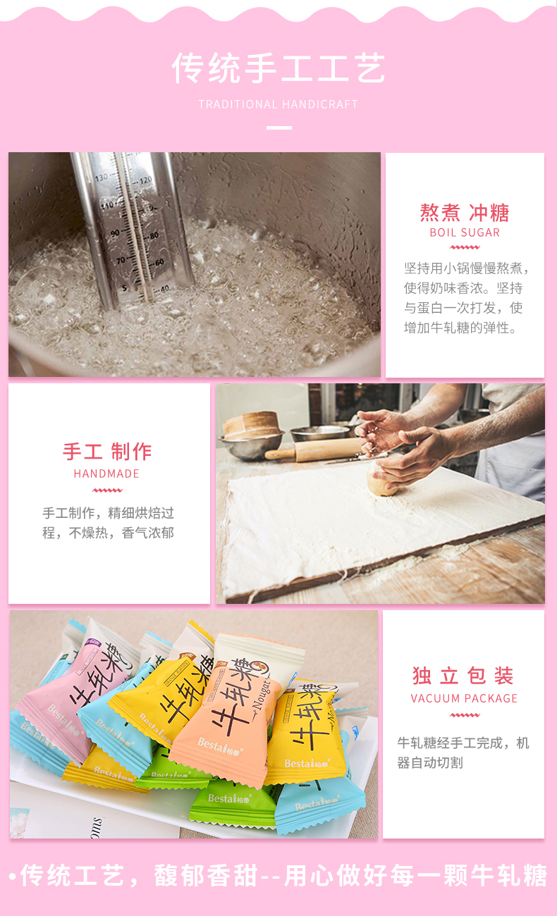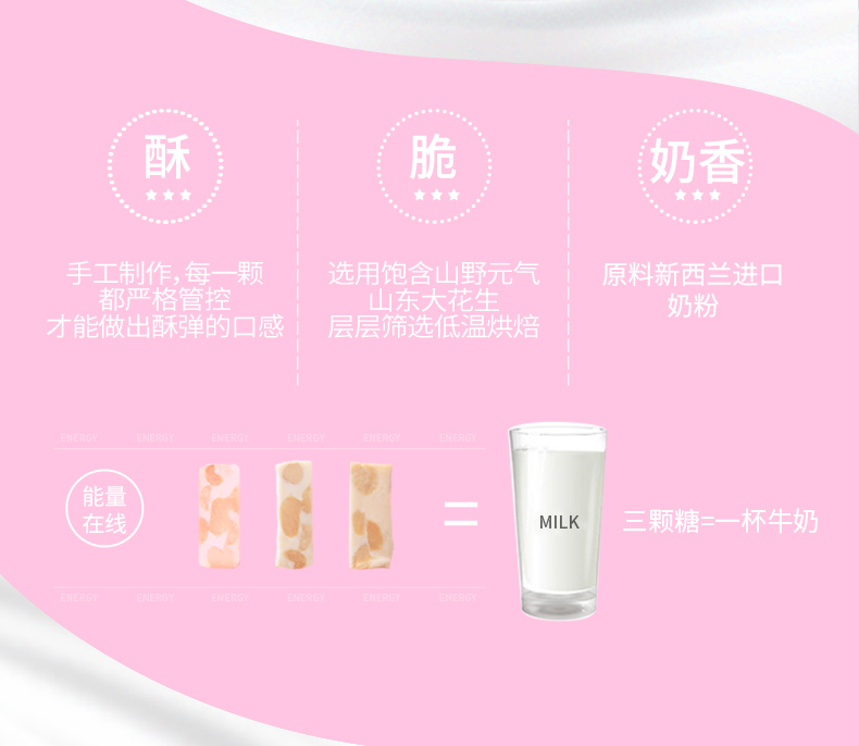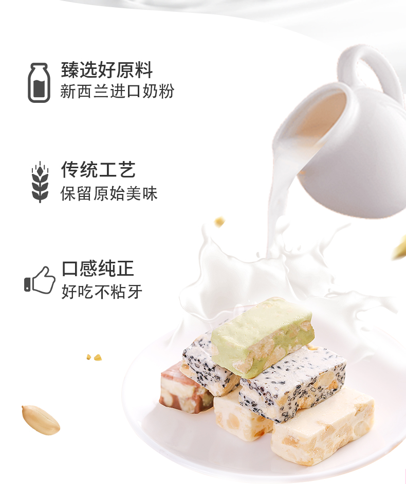 选用新西兰进口奶粉,包含山野元气的山东大花生,层层筛选,低温烘焙,每一口都有脆响的快感。口感纯正,好吃不粘牙。