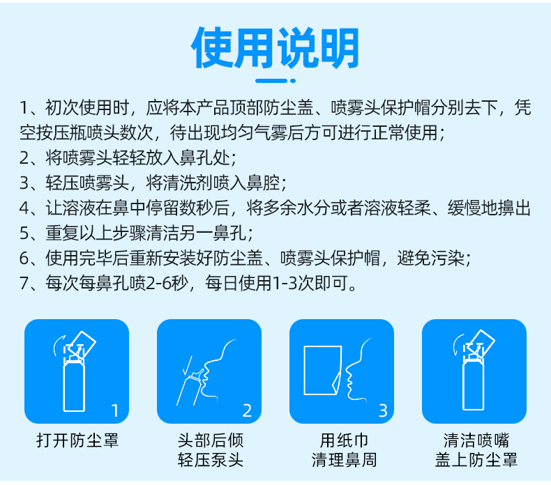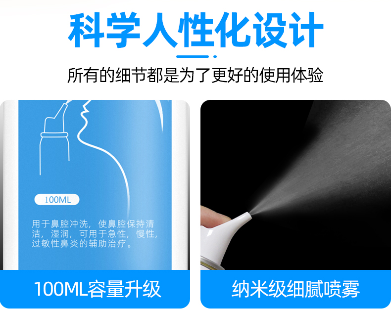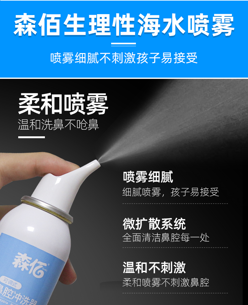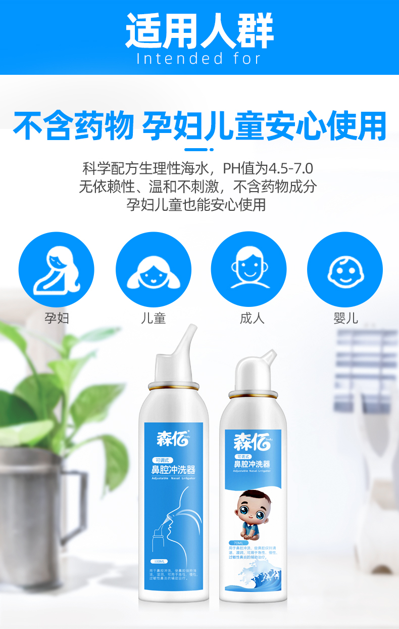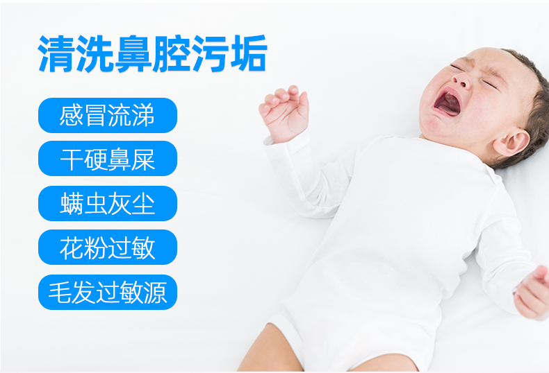 温和不刺激,适用于鼻腔干燥,鼻腔创面清洗,独特的圆润无锐角喷嘴,喷雾柔和,不呛鼻,不伤鼻腔,宝宝使用更舒适
