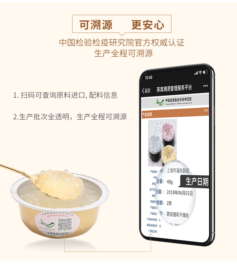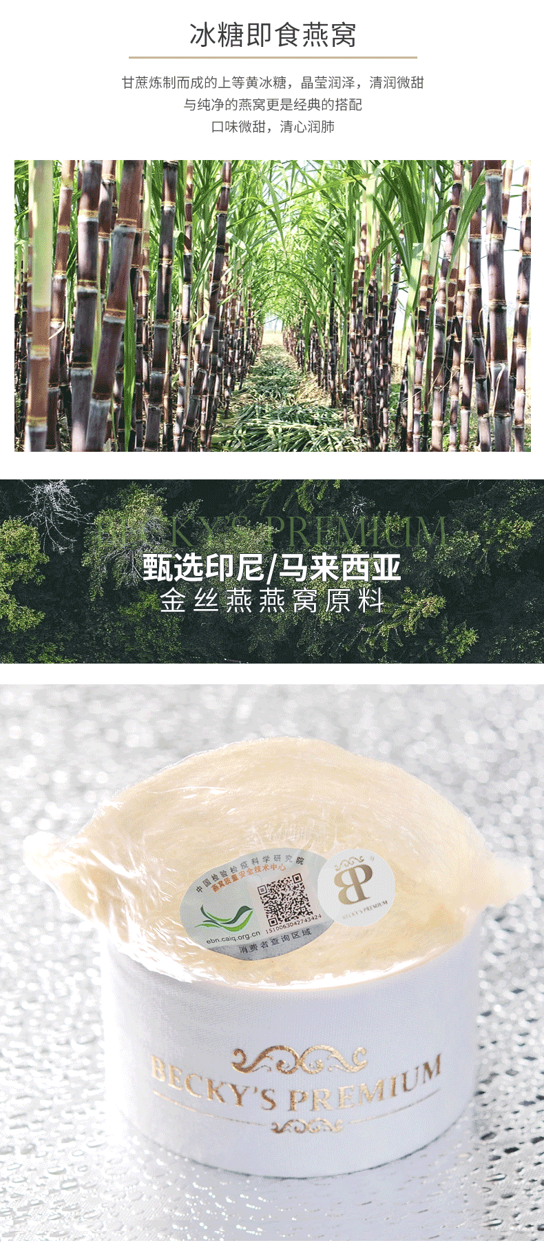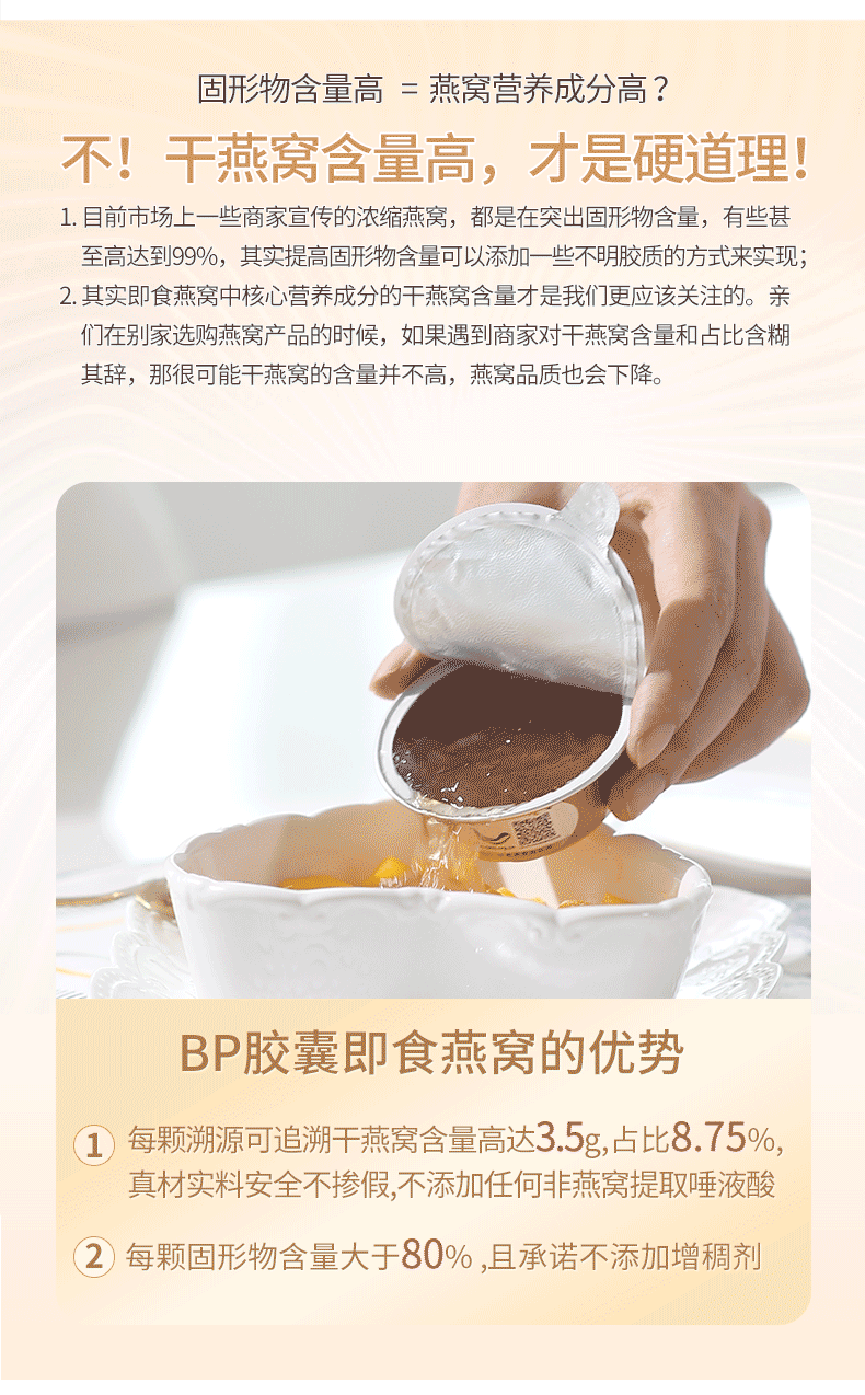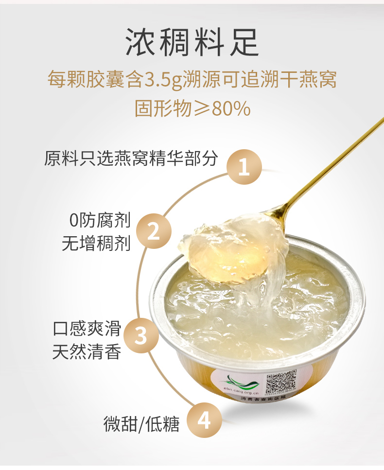 固形物含量≧80%,全溯源,孕妇深度滋补便携,选用马来西亚进口红树林燕窝,口口有料,传承百年工艺,零脂肪,无添加,低糖健康,营养有料,口感顺滑,好喝无负担!