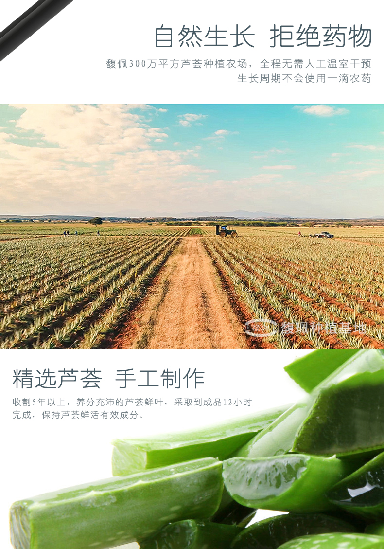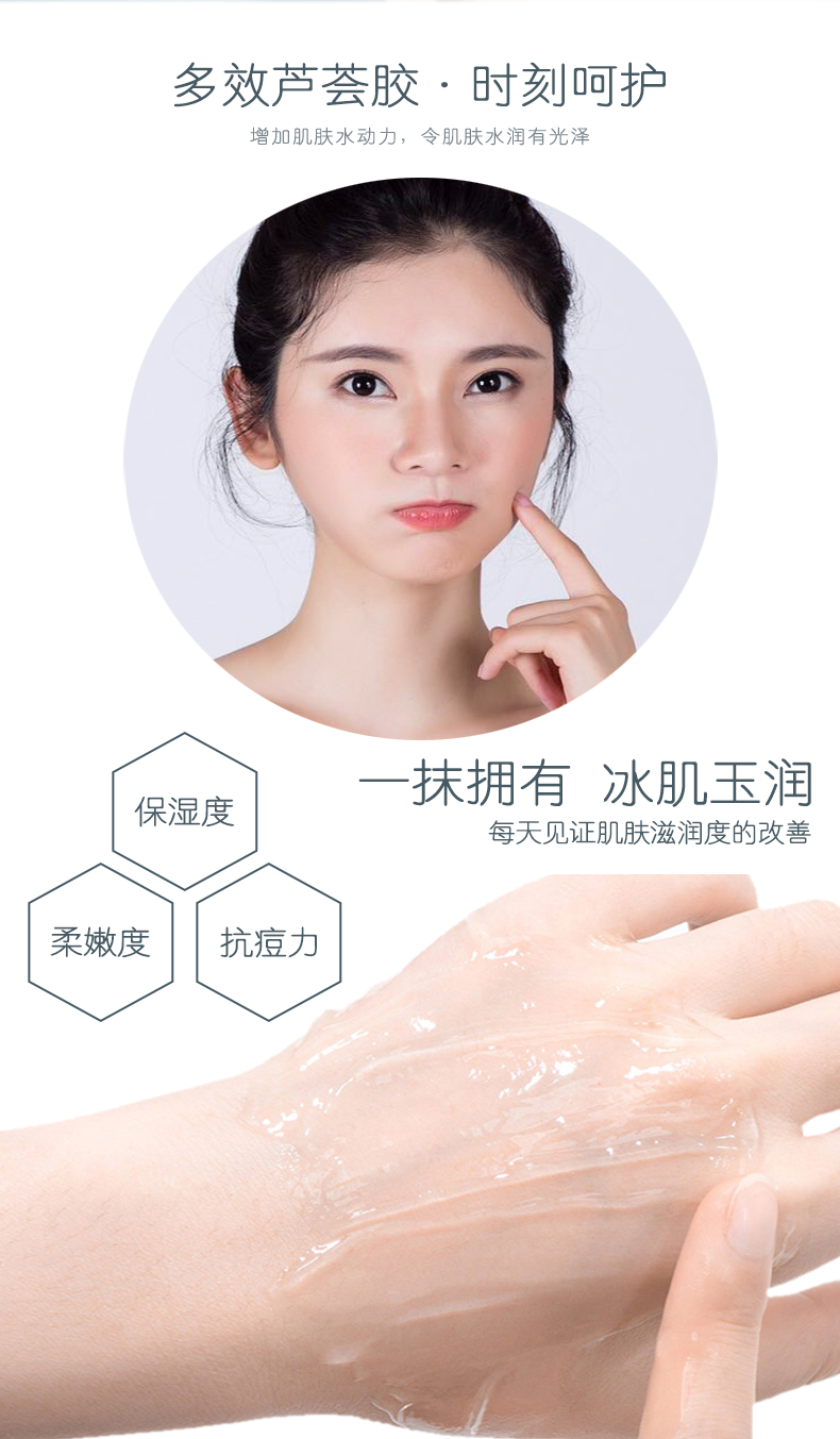 含天然芦荟胶液,晒后修护,去痘印痘痕,镇定补水,换季护肤,让皮肤更加细腻柔滑。
