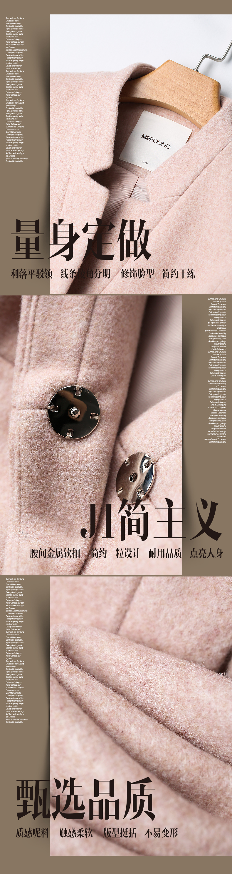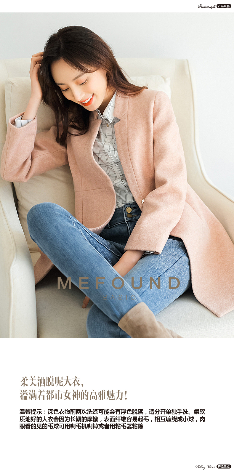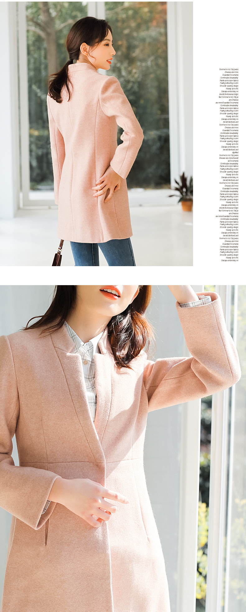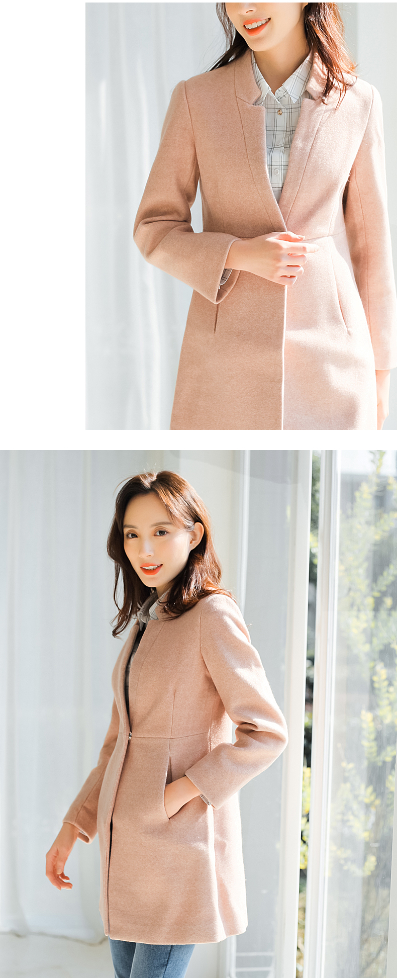 柔美洒脱呢大衣,溢满着都市女神的高雅魅力;利落平驳领,线条棱角分明,修饰脸型,简约干练;腰间金属钦扣,简约一粒设计;质感呢料,触感柔软,版型挺括,不易变形;快快抢购哦~
