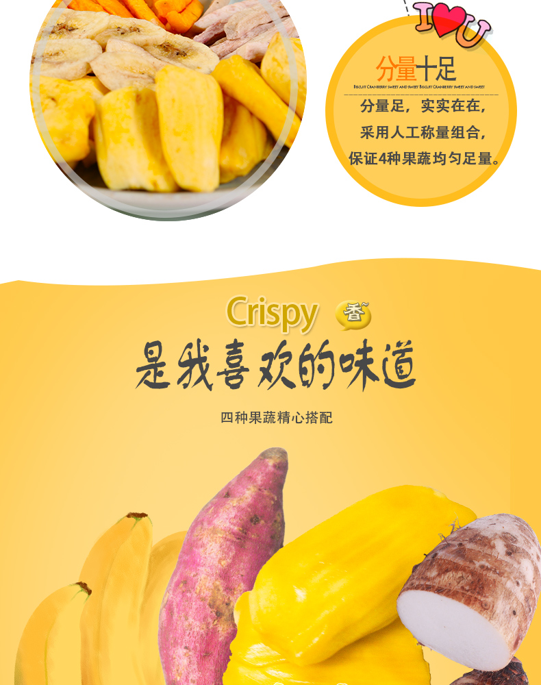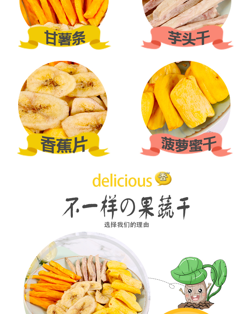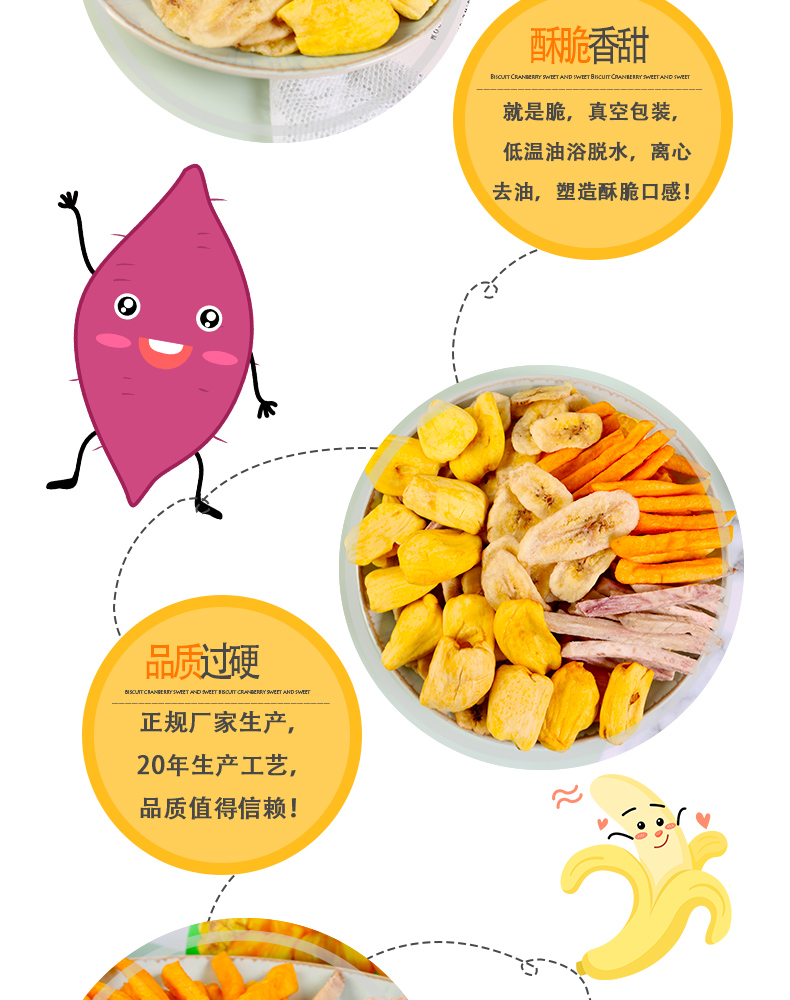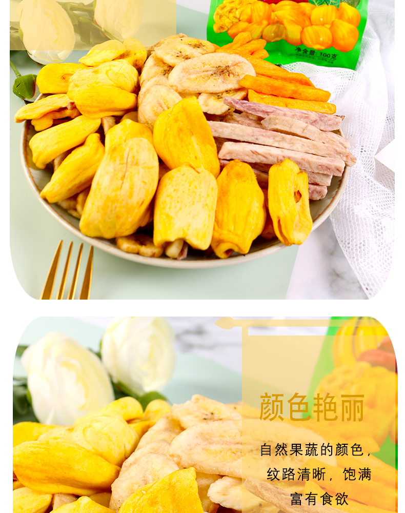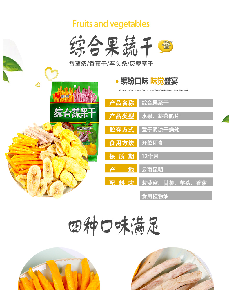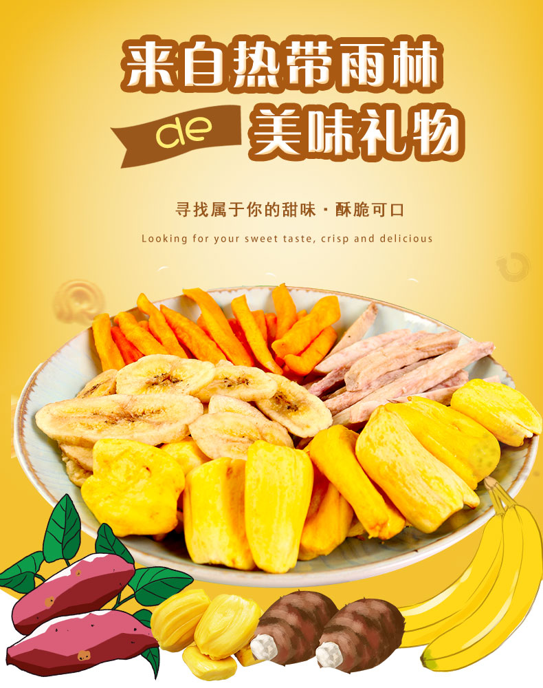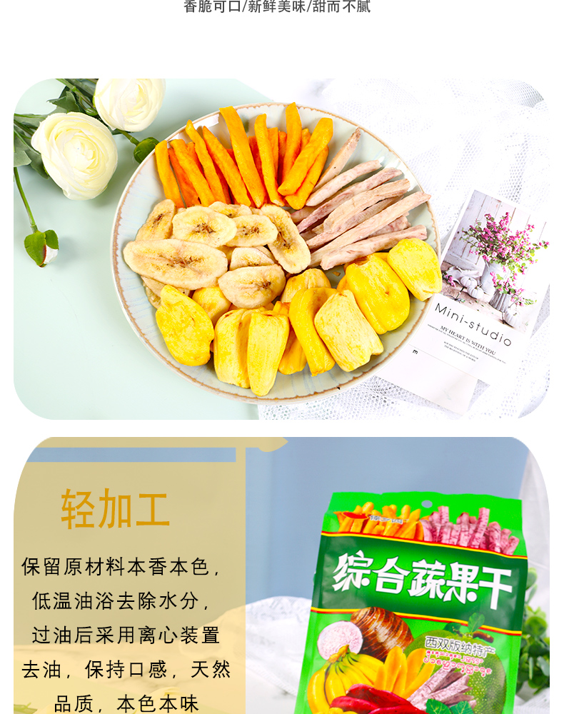 选自西双版纳热带优质果蔬,无添加、无色素,自然好味道。低温油浴脱水,离心去油,塑造酥脆口感!