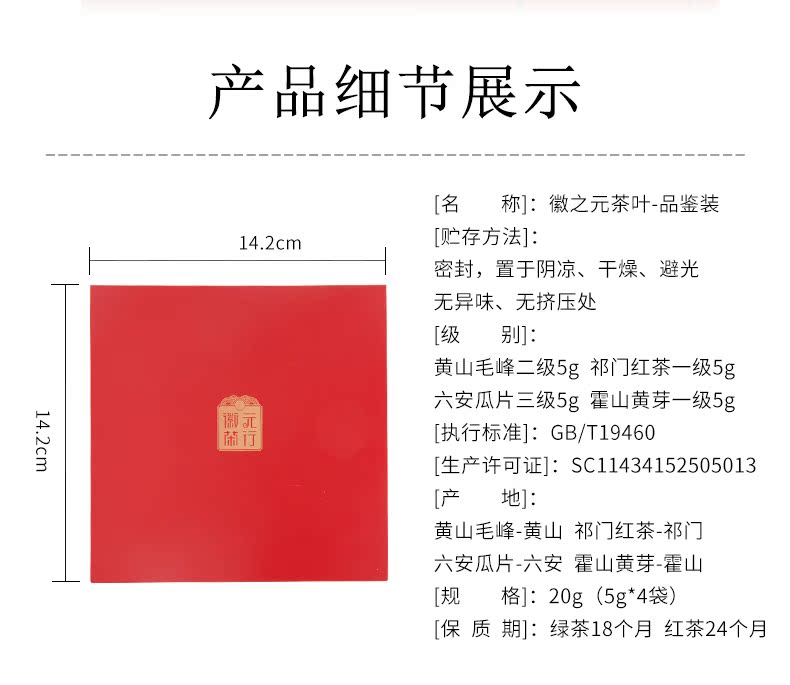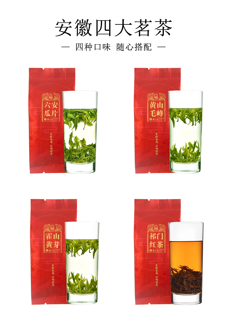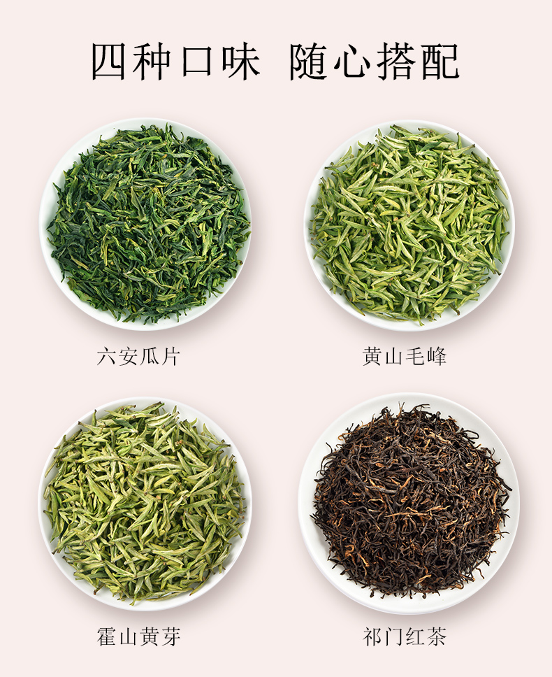 黄山毛峰,祁门红茶,霍山黄芽,六安瓜片品鉴组合装。小袋包装,外装礼盒,尽显玲珑,四种口味随心搭配,黄山毛峰,鲜爽回甘,六安瓜片清香高爽,霍山黄芽,清爽持久.