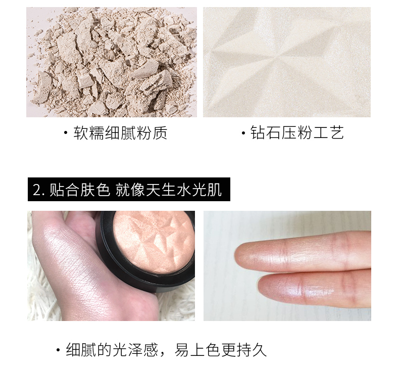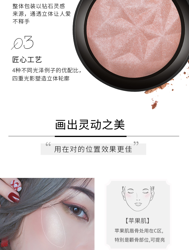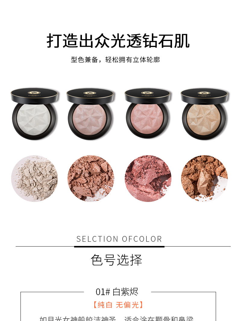 金钻奢耀高光粉,打造出众光透钻石肌,烘焙烤粉,匠心工艺,型色兼备,轻松拥有立体轮廓。