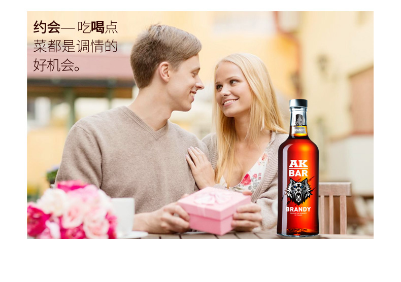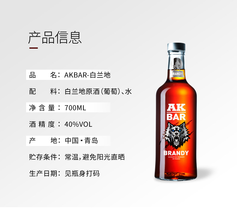 AKBAR白兰地,香醇口感,醇和浓郁,尽显格调,色清如水晶,香醇如幽兰,约会聚餐必备!