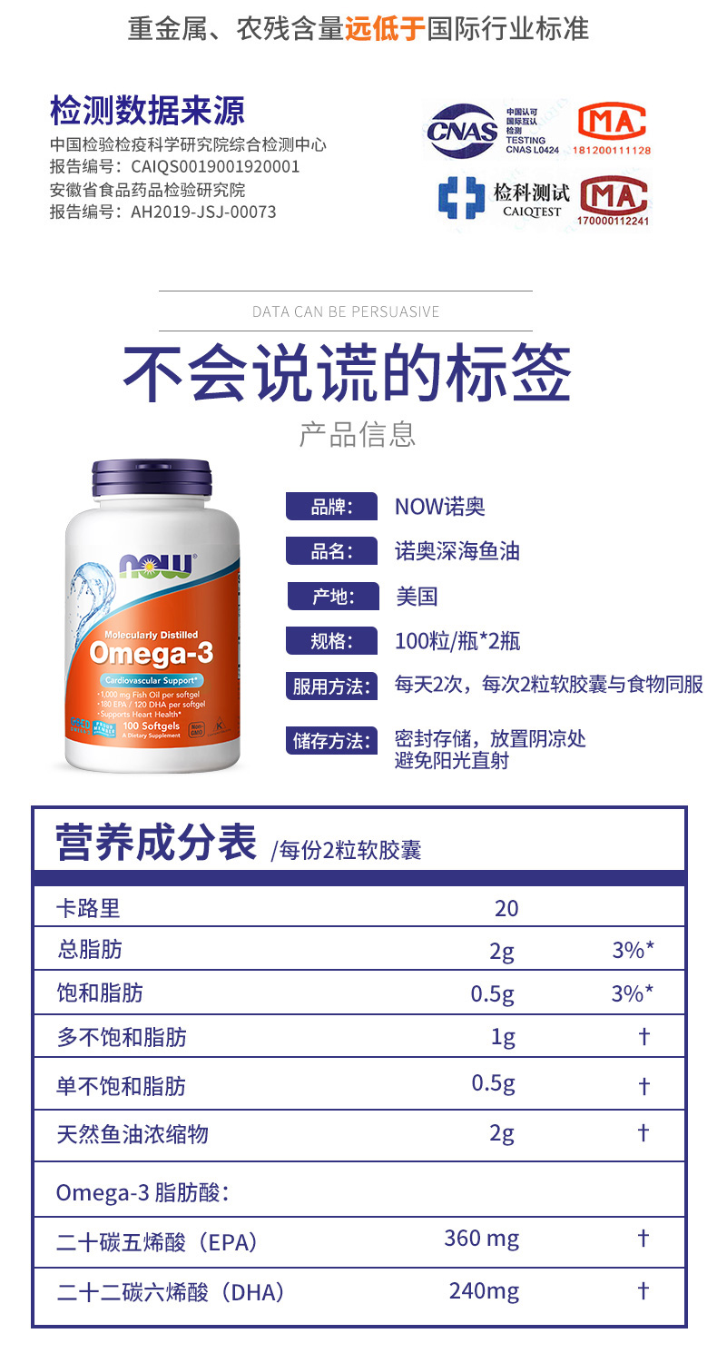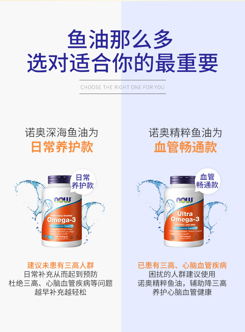 NOW Foods诺奥2大瓶金奖深海鱼油胶囊欧米伽3美国原装进口中老年