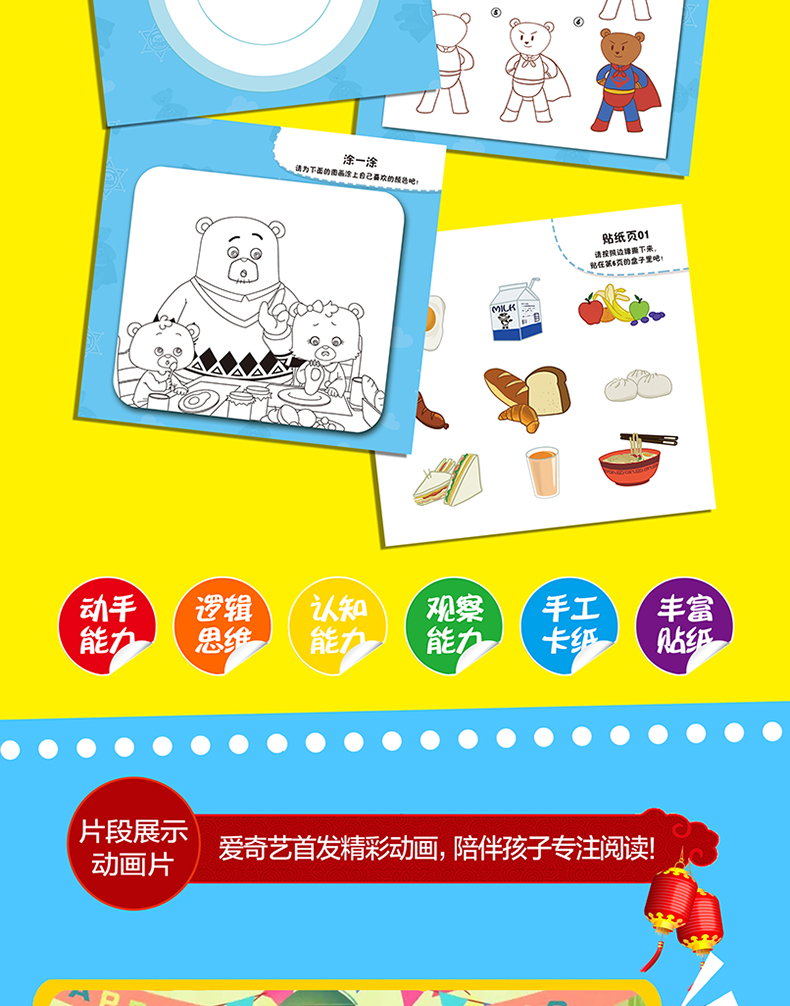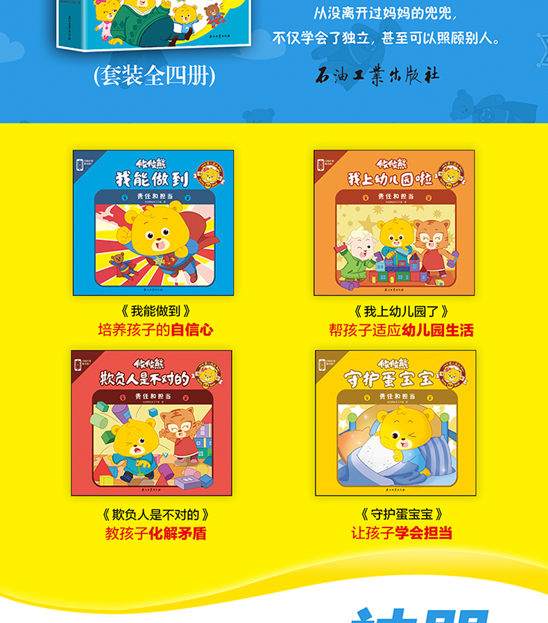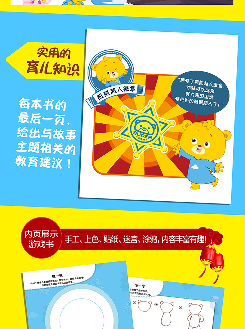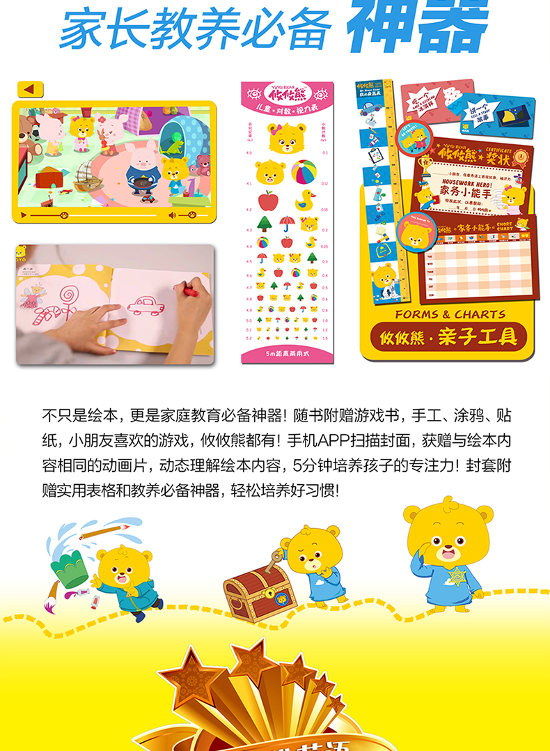 包含4册,四个故事,让孩子减轻对体检的恐惧,培养孩子主动承担家务,鼓励孩子,培养孩子的责任心,提高生活自理能力。还包含了手工、涂鸦等动手游戏,还包含了时间表、奖状等家教工具。
